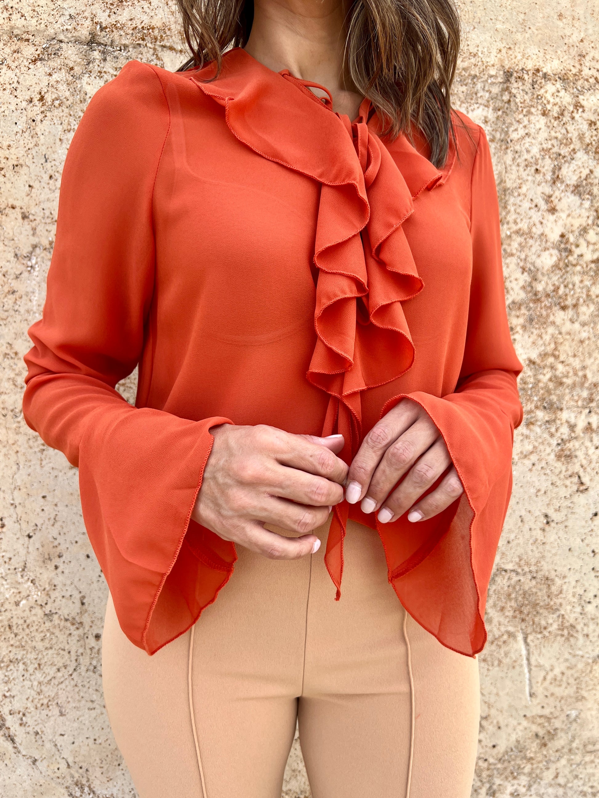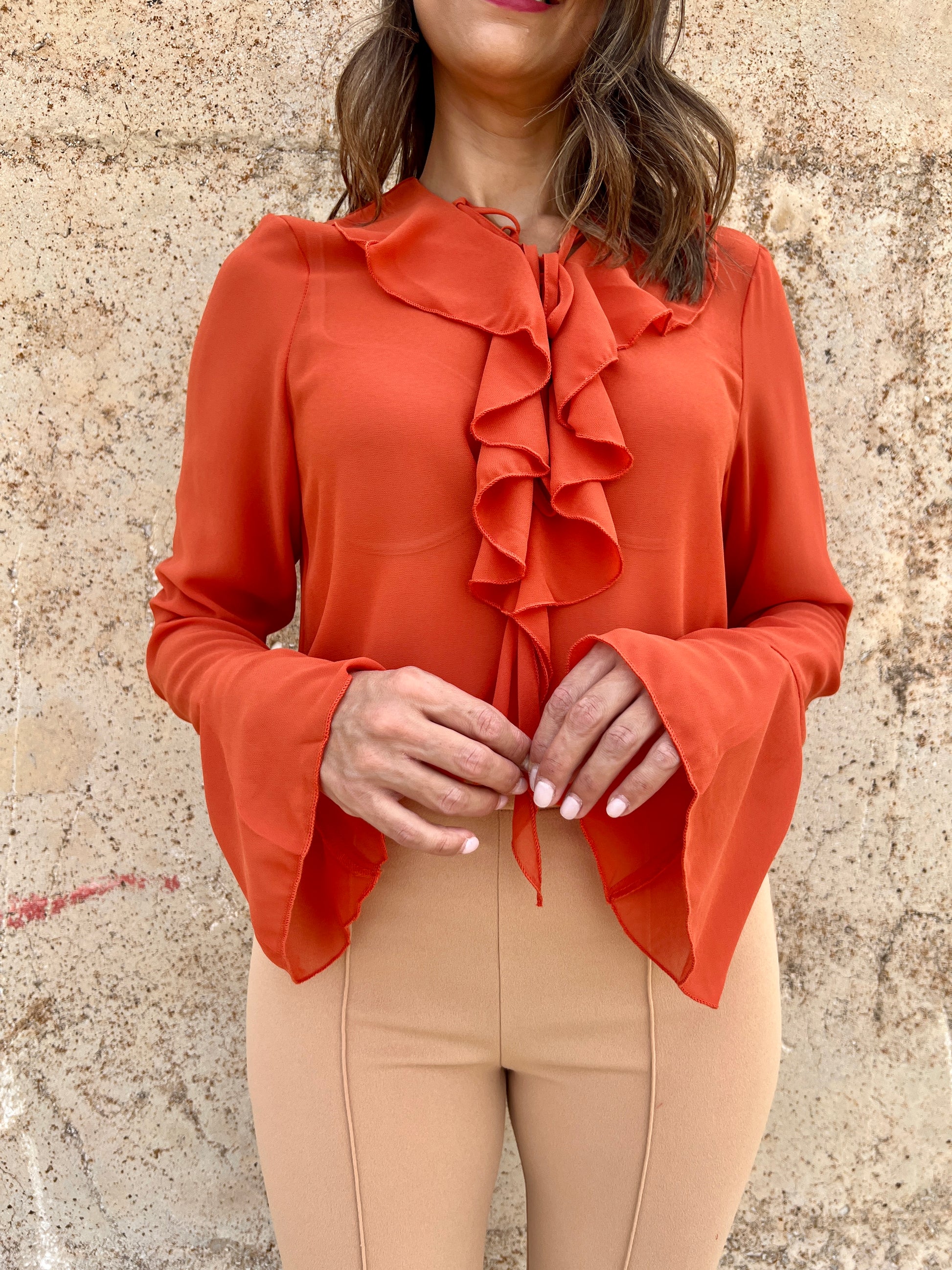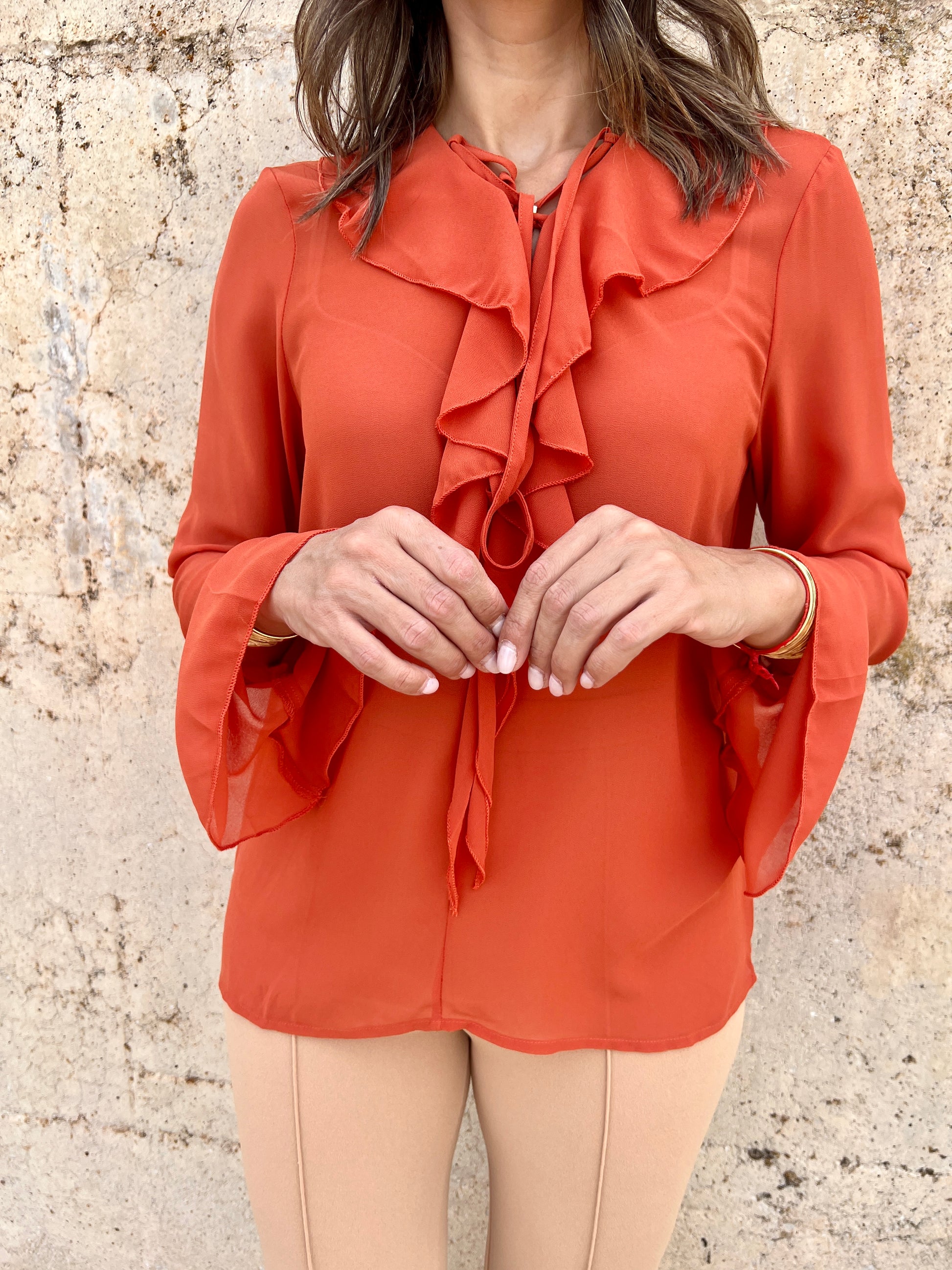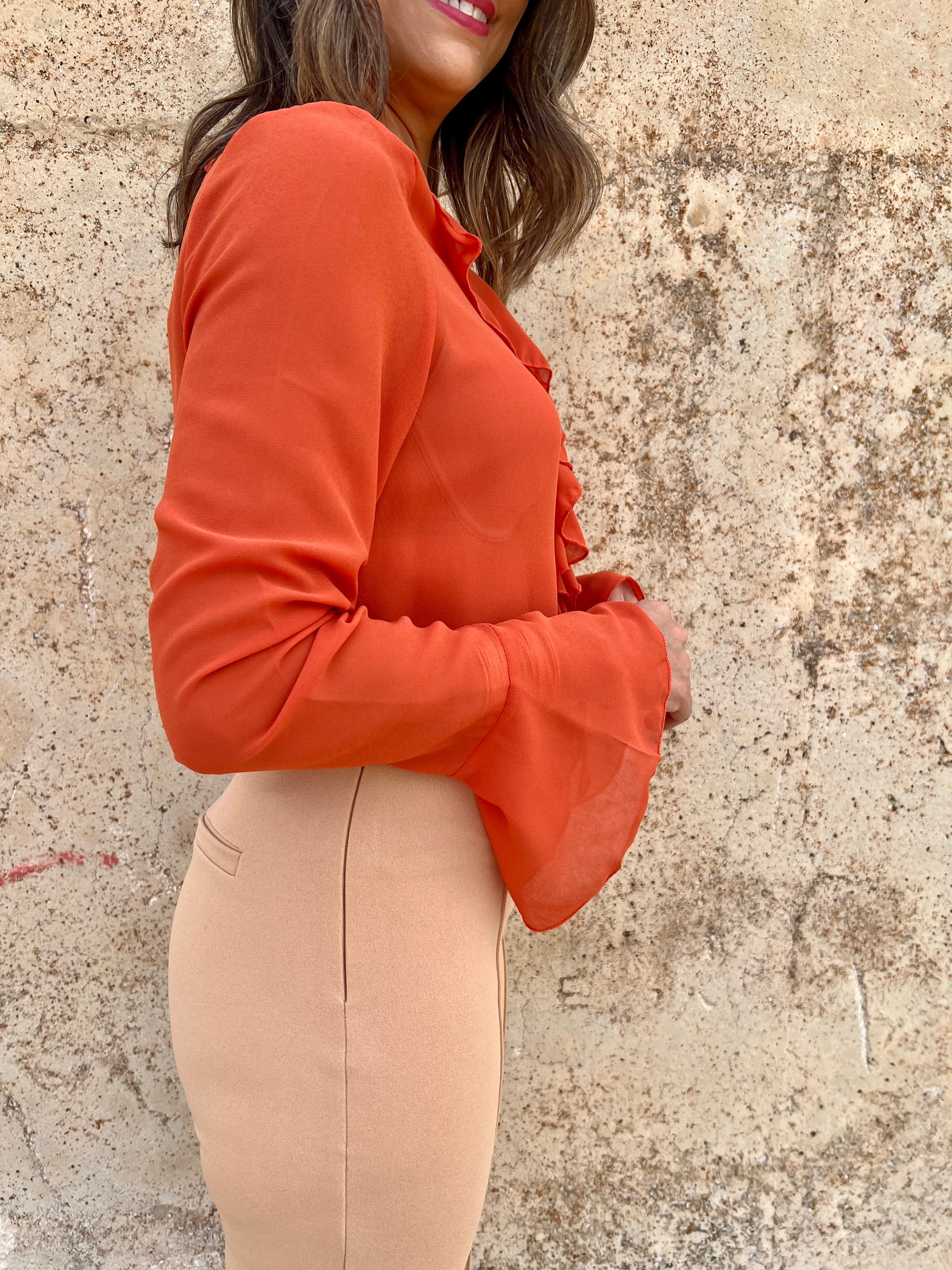 Esta camisa Charis es una prenda elegante y sofisticada que presenta un escote en forma de uve que realza tu figura. Con una tira que cruza los extremos, esta camisa añade un toque moderno a tu conjunto. Además, los volantes y las mangas acampanadas de tejido de gasa le dan un toque femenino y delicado.