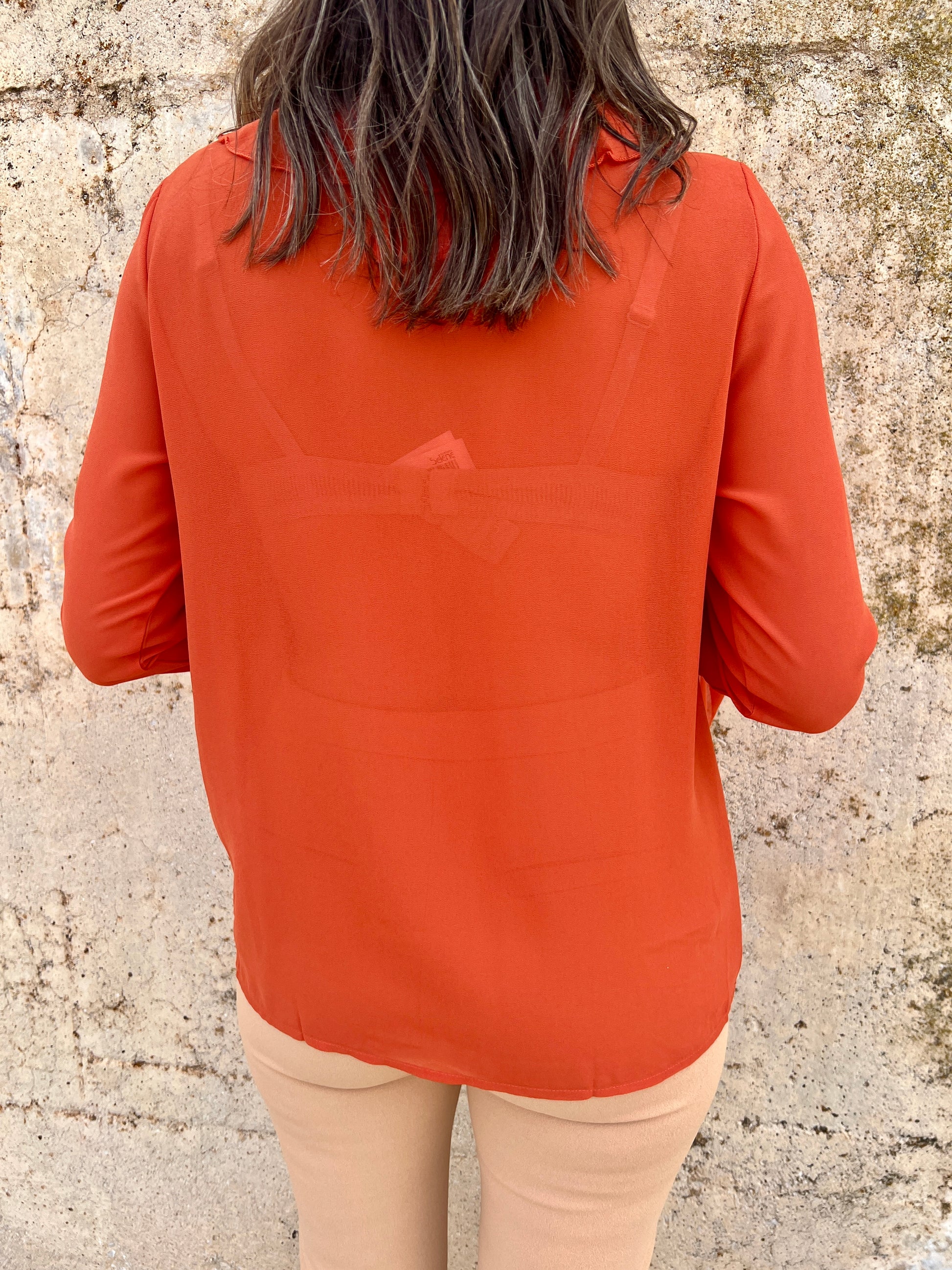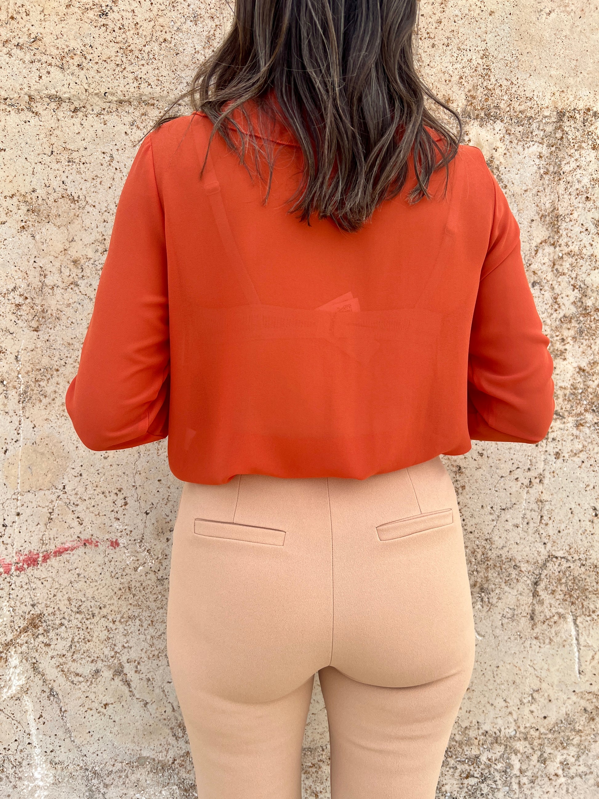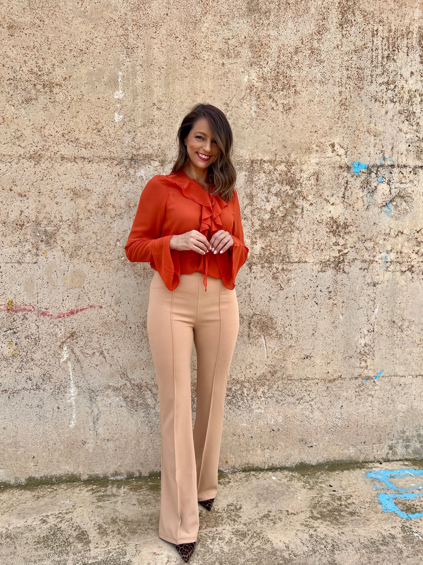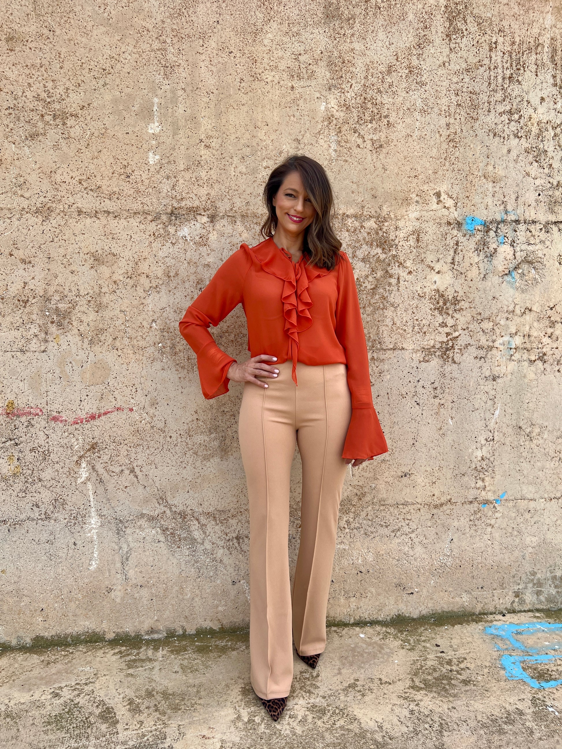 Esta camisa Charis es una prenda elegante y sofisticada que presenta un escote en forma de uve que realza tu figura. Con una tira que cruza los extremos, esta camisa añade un toque moderno a tu conjunto. Además, los volantes y las mangas acampanadas de tejido de gasa le dan un toque femenino y delicado.