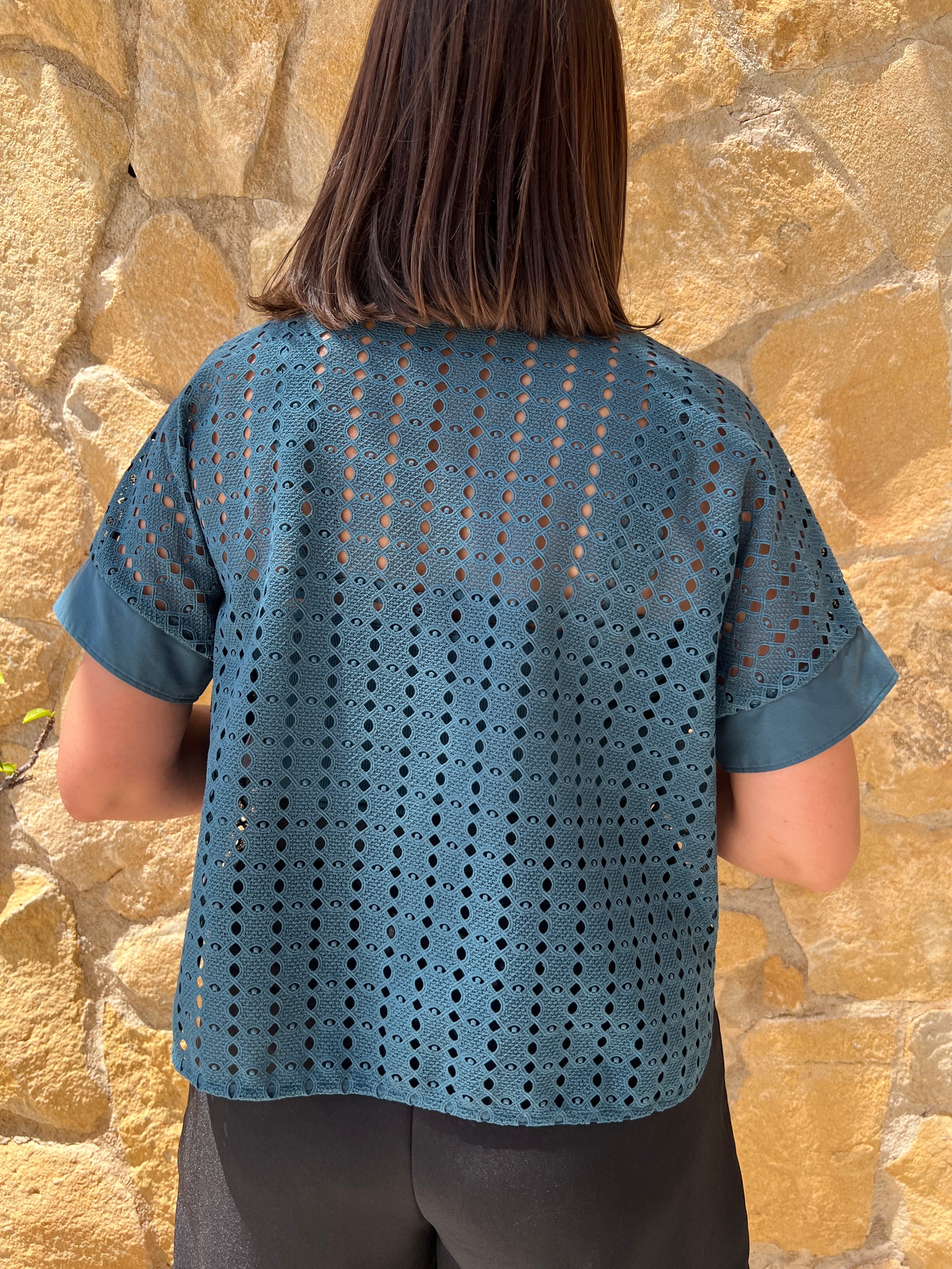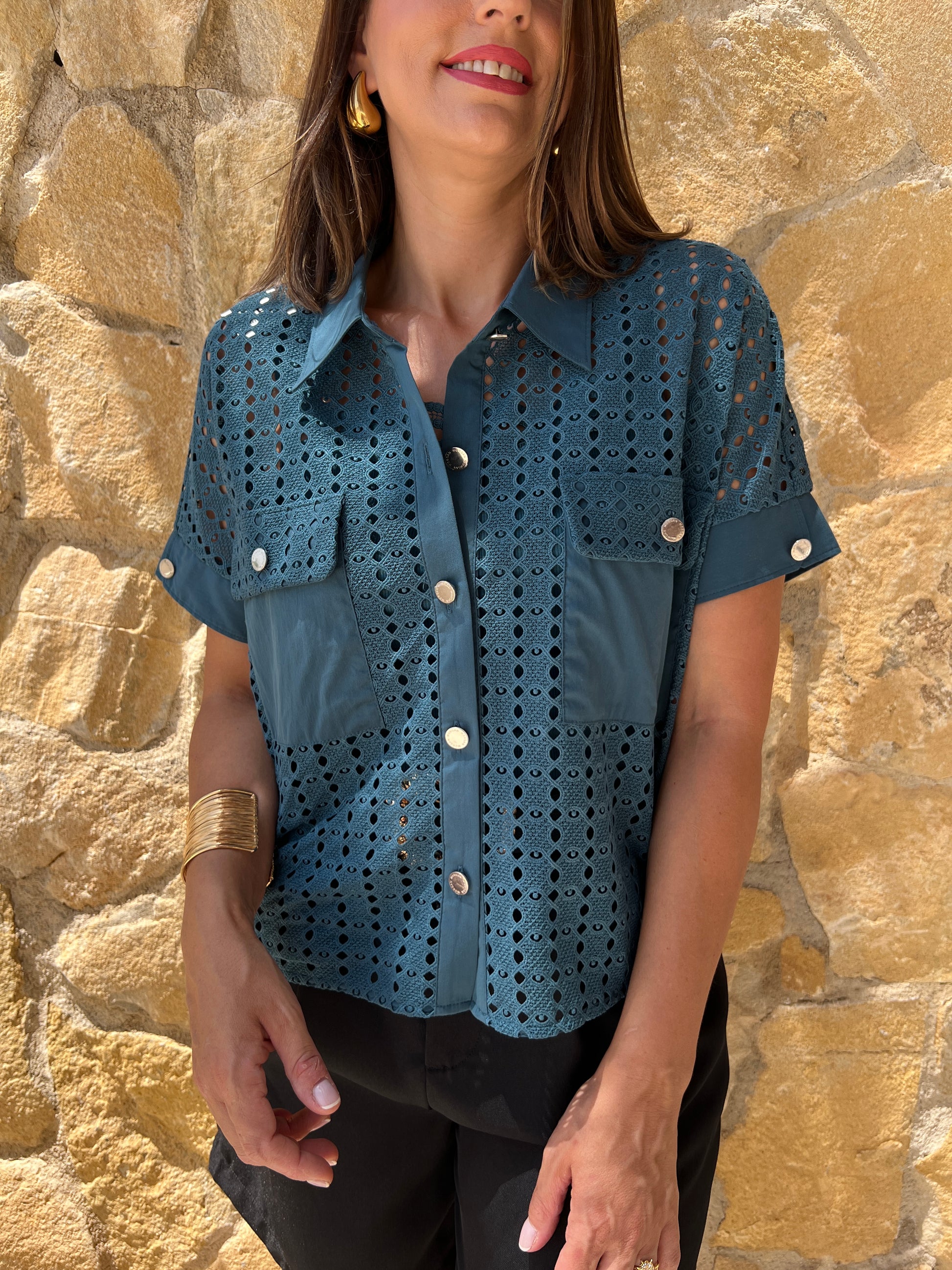 Esta camisa rejilla en color azul petróleo es ideal para darle un toque de estilo a tu atuendo. Su diseño perforado y bolsillos añaden un toque moderno y funcional a esta prenda. Además, su terminación de manga en contraste le da un toque de originalidad. Modelo oversize