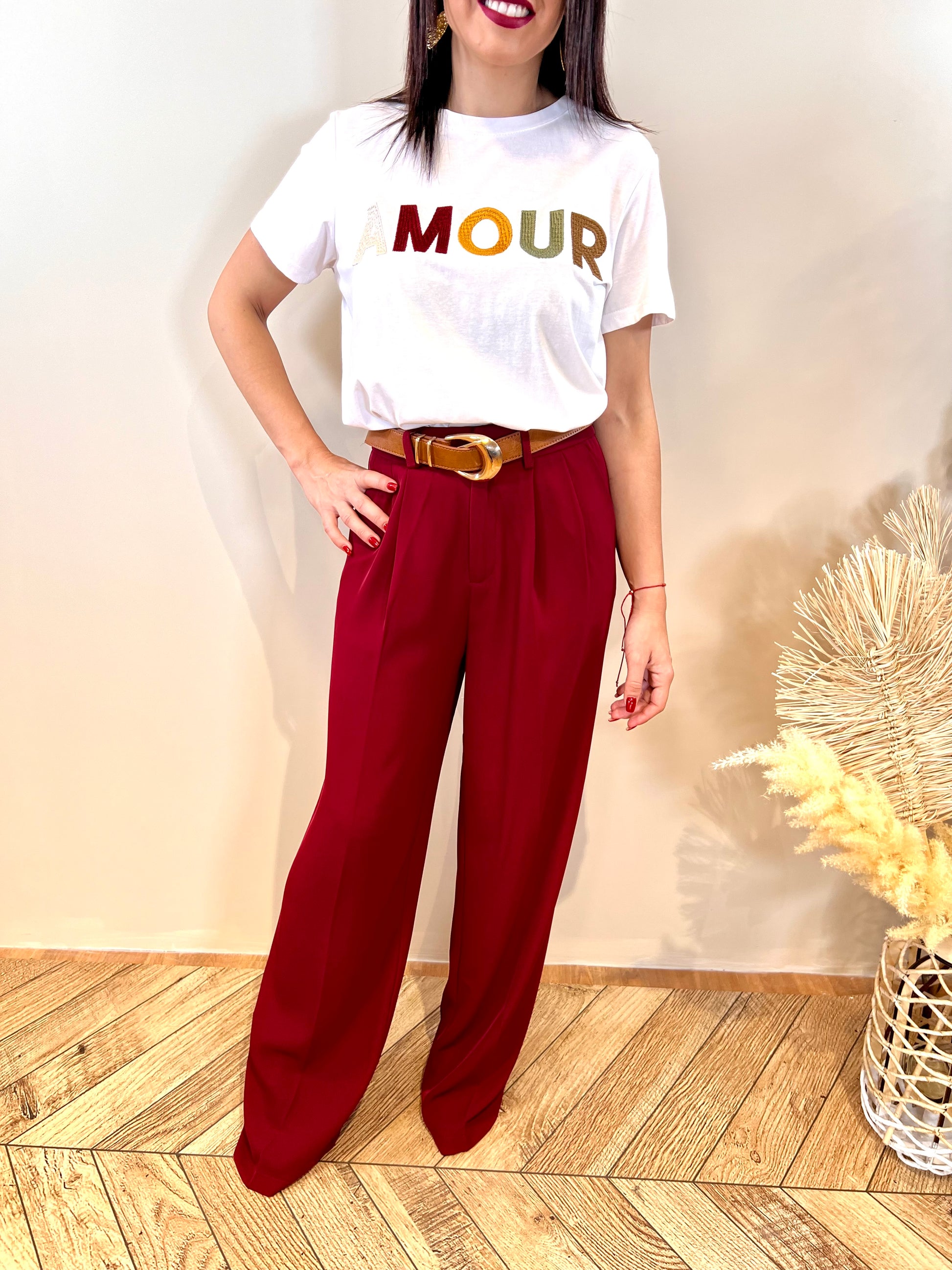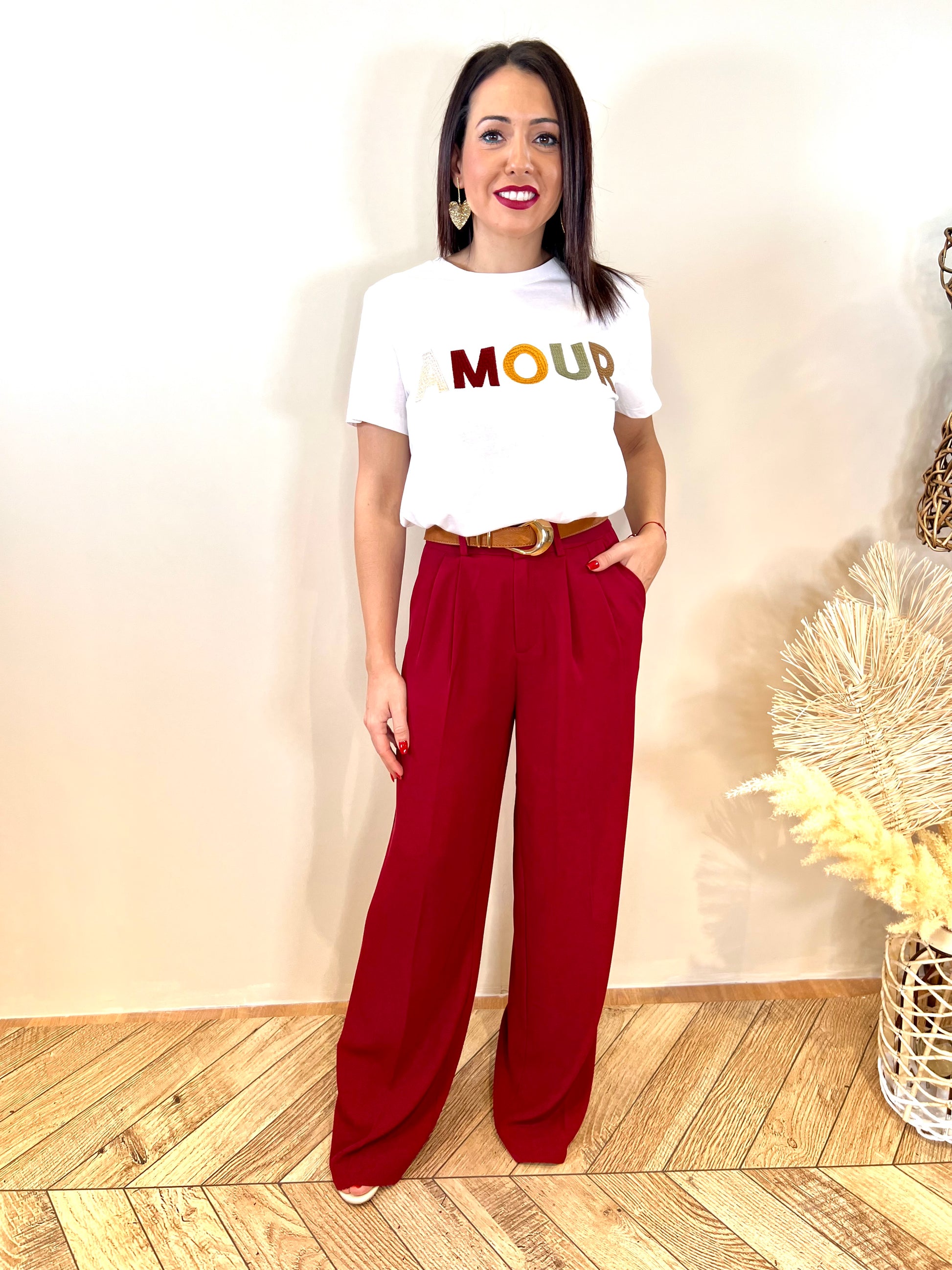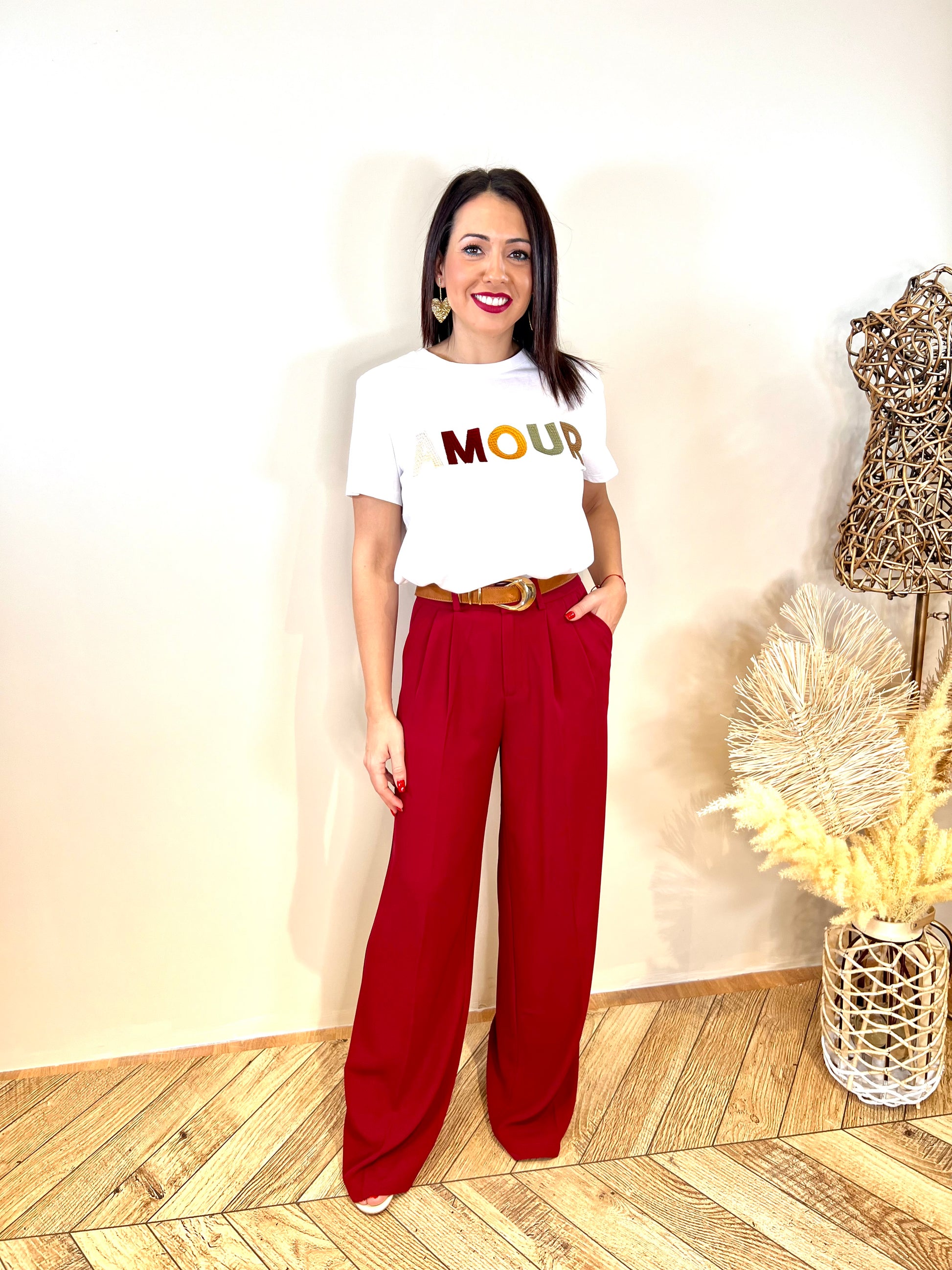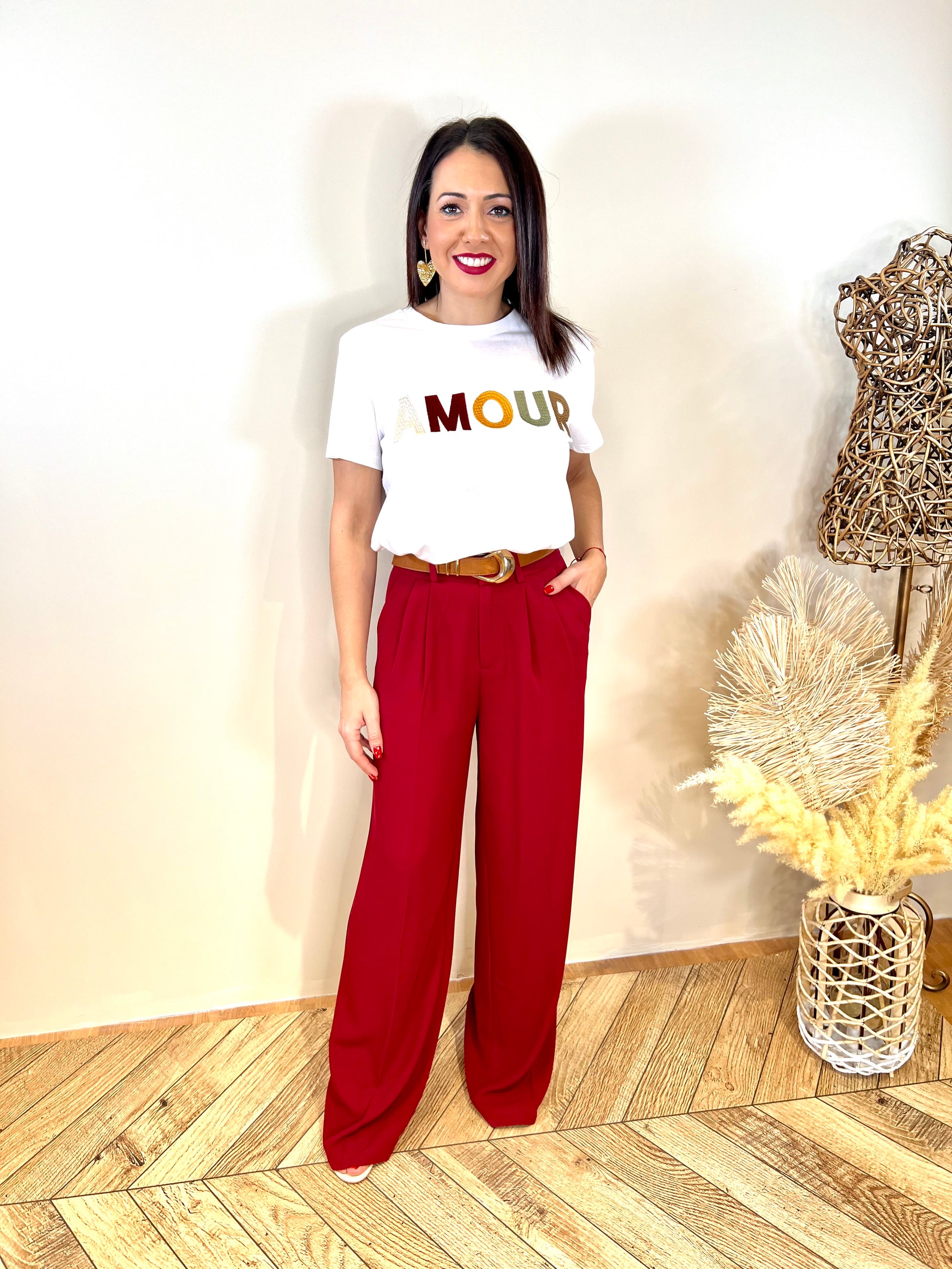 Esta camiseta en blanco cuenta con un relieve llamativo de letras AMOUR en tonalidades variadas y manga corta. Disfruta de su estilo moderno y cómodo mientras expresas tu amor con esta prenda única. Perfecta para cualquier ocasión y fácil de combinar con cualquier atuendo.