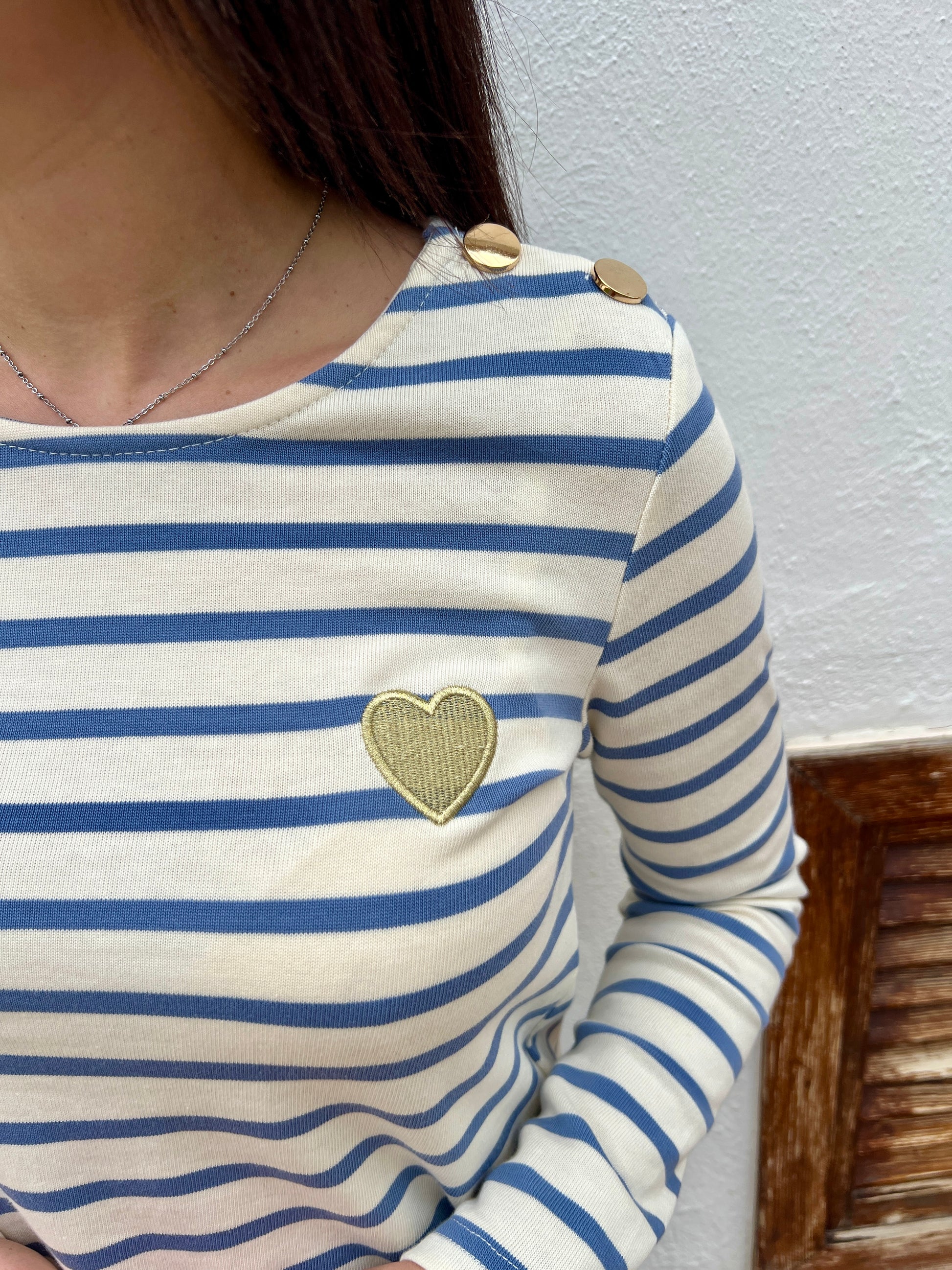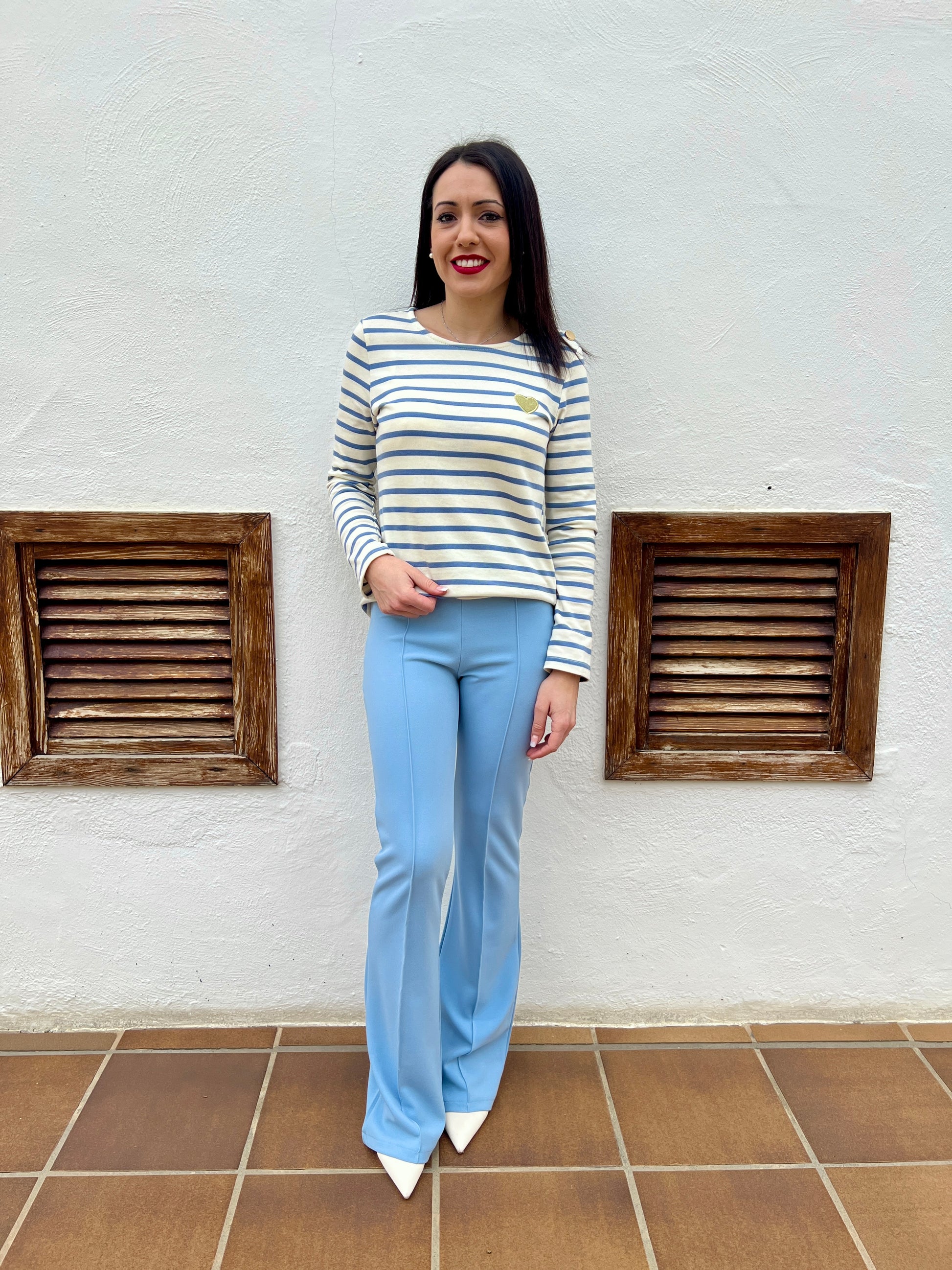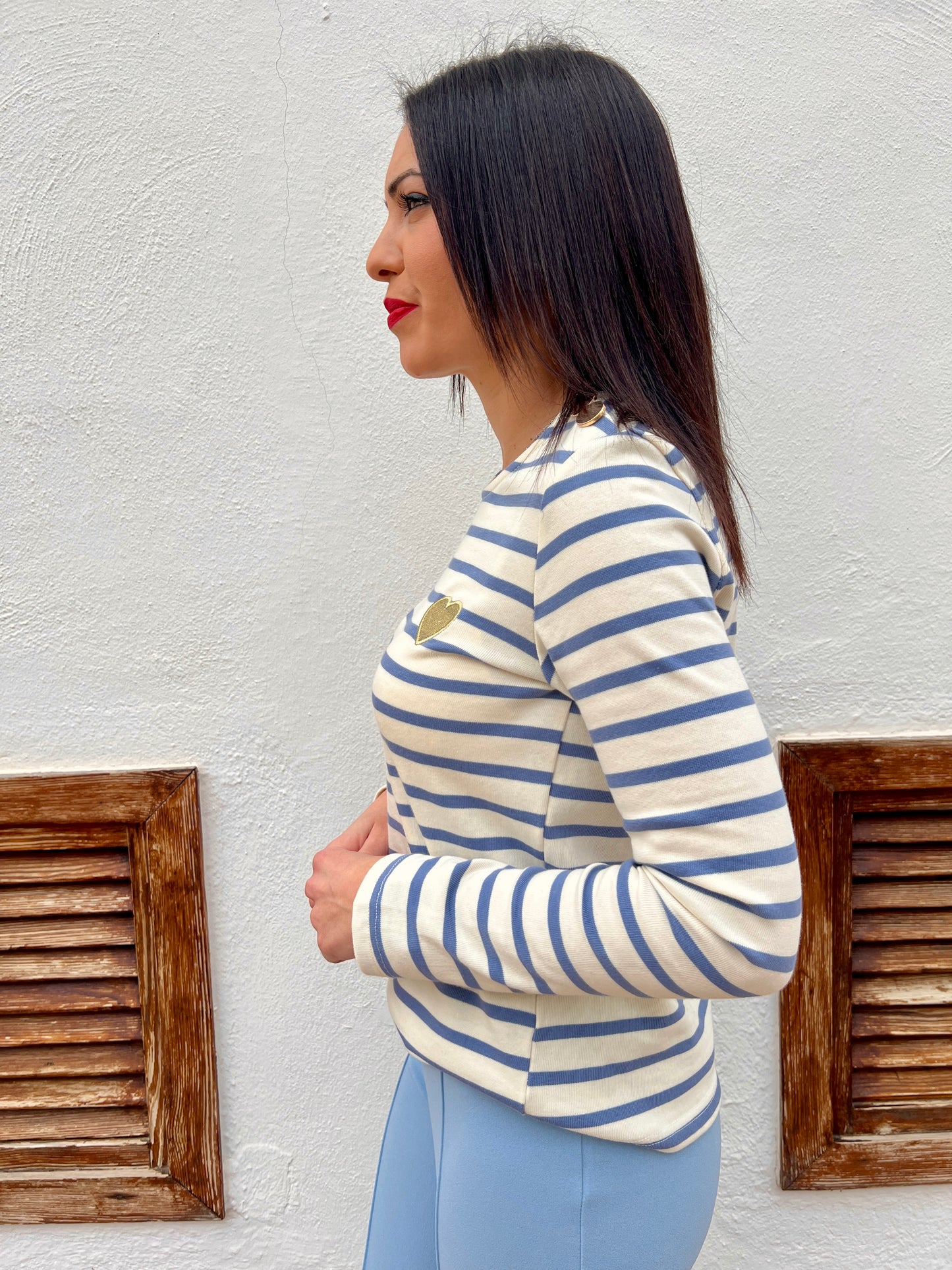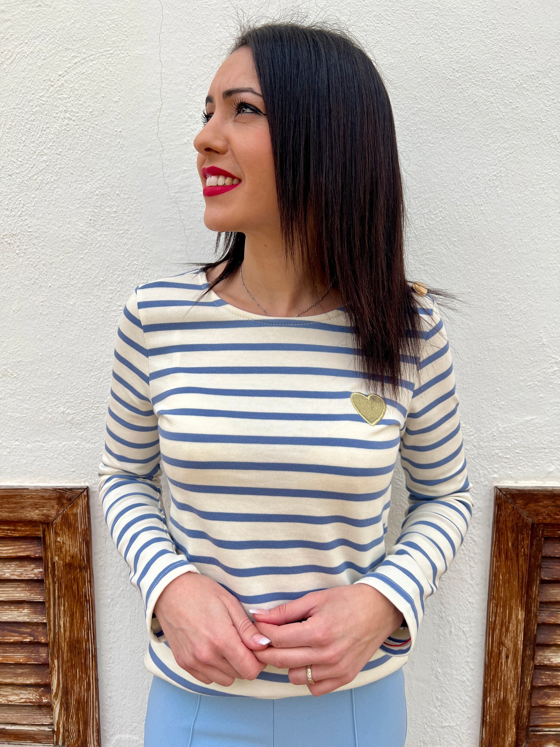 Descubre la elegancia y el estilo de la camiseta Maray. Con su diseño de rayas en tonos azules y detalles bordados en dorado, esta camiseta es perfecta para cualquier ocasión. Combina comodidad y sofisticación en un solo producto. ¡Hazla tuya ahora!