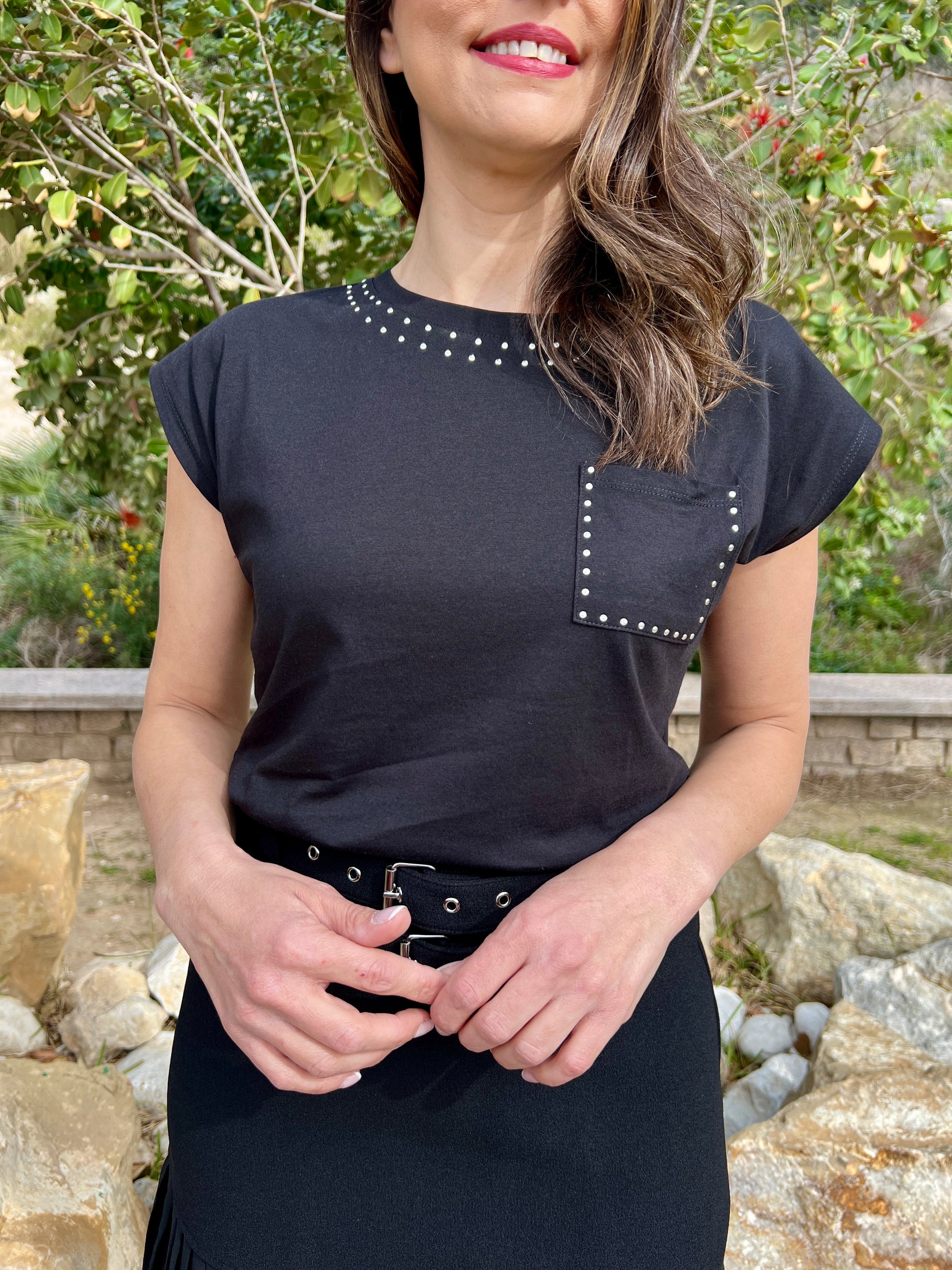La camiseta Sira es una prenda elegante y moderna para cualquier ocasión. Confeccionada en color negro y manga corta, su diseño se destaca por los detalles de tachuelas en plateado que le brindan un toque único y sofisticado. ¡Haz una declaración de estilo con la camiseta Sira!
