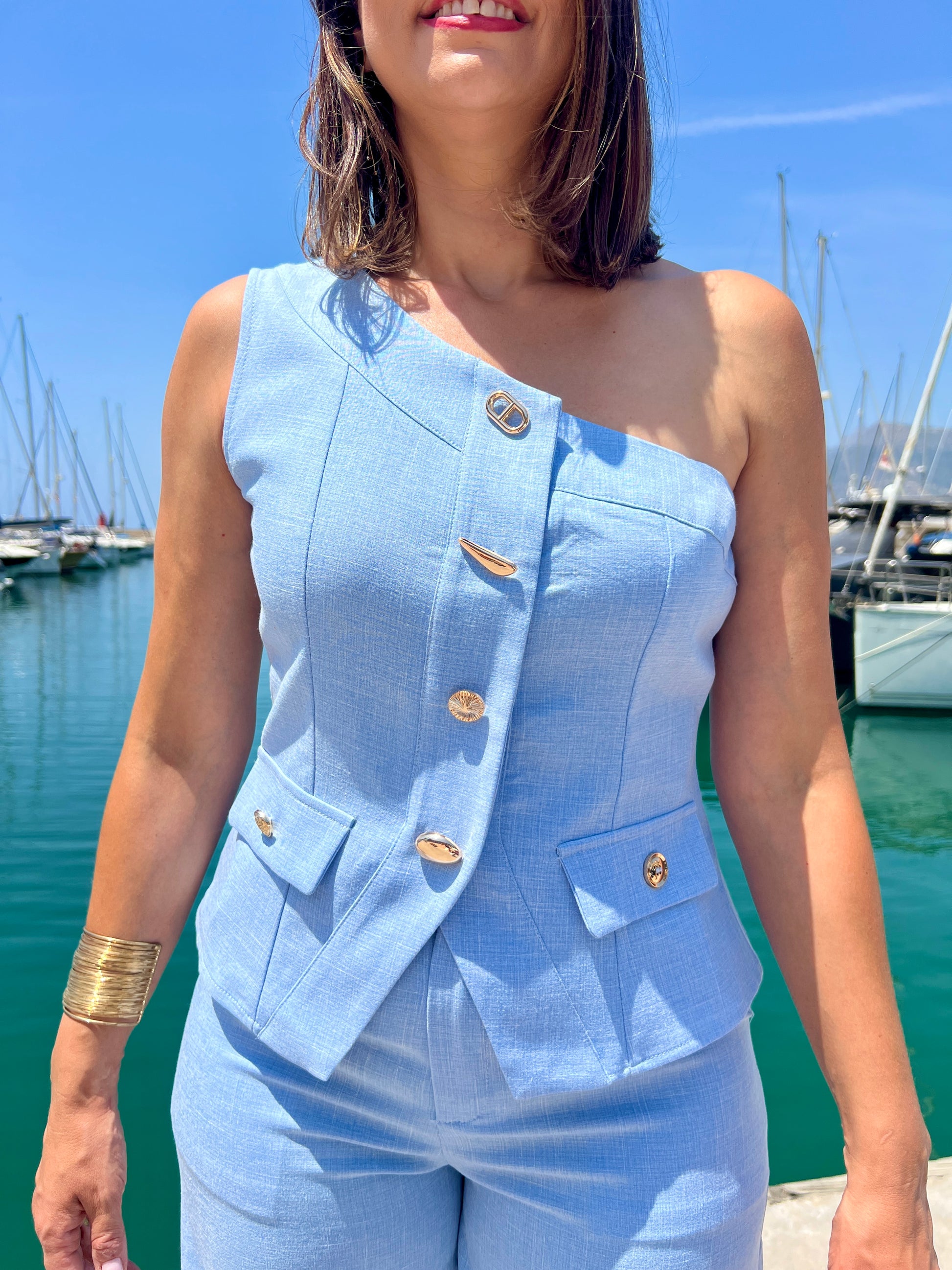 Este elegante Chaleco Amalia presenta un diseño asimétrico con botones decorativos y una cremallera lateral, ofreciendo un toque de estilo único a tu atuendo. Hecho con materiales de calidad, brinda comodidad y durabilidad. Perfecto para añadir un toque de elegancia a cualquier ocasión. ¡Haz una declaración de moda con este chaleco!