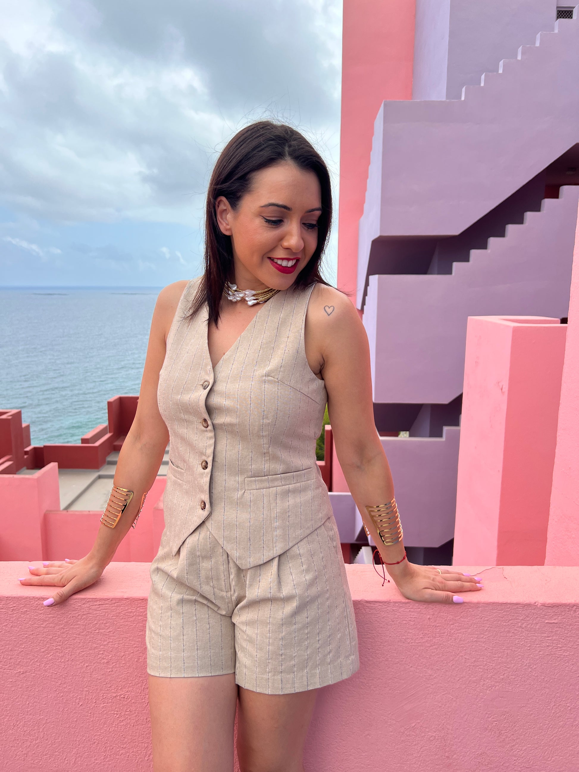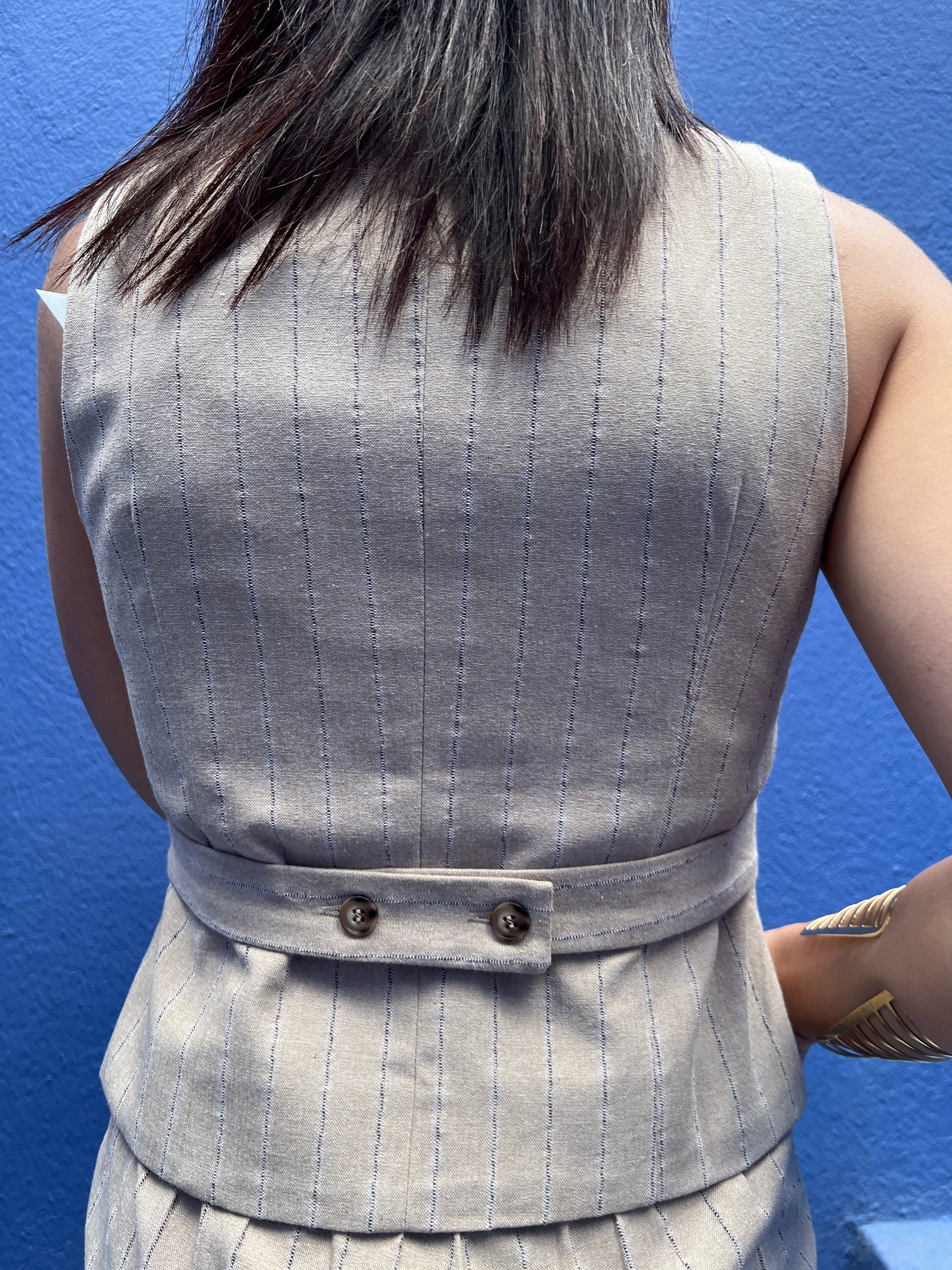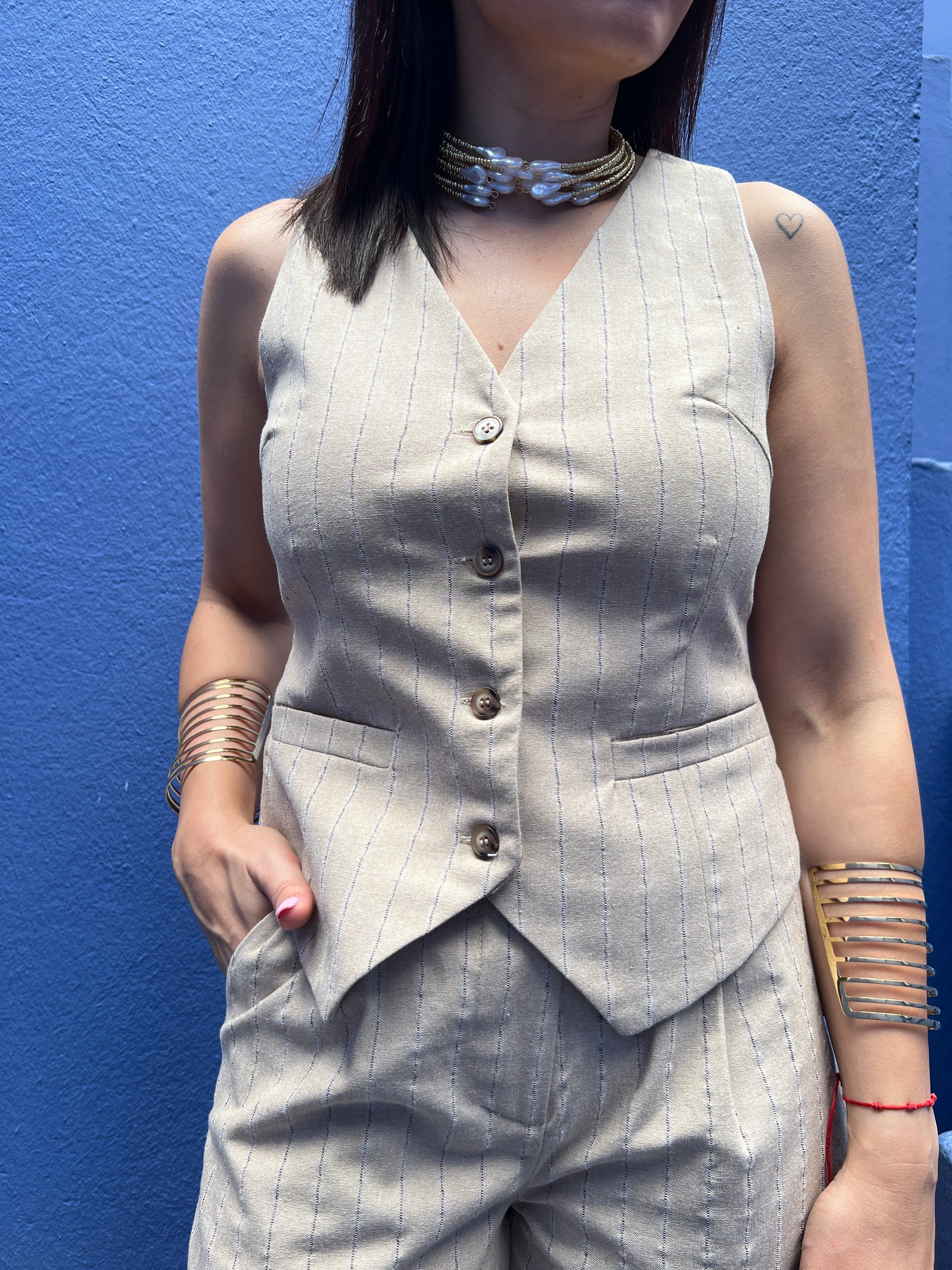 Obtén un look elegante y moderno con el Chaleco Daniela. Su confección sastre y su diseño abotonado en la parte delantera lo hacen perfecto para cualquier ocasión. Con una raya fina en tonos tostados, este chaleco te brindará un estilo sofisticado y versátil. ¡Luce impecable y a la moda con el Chaleco Daniela!