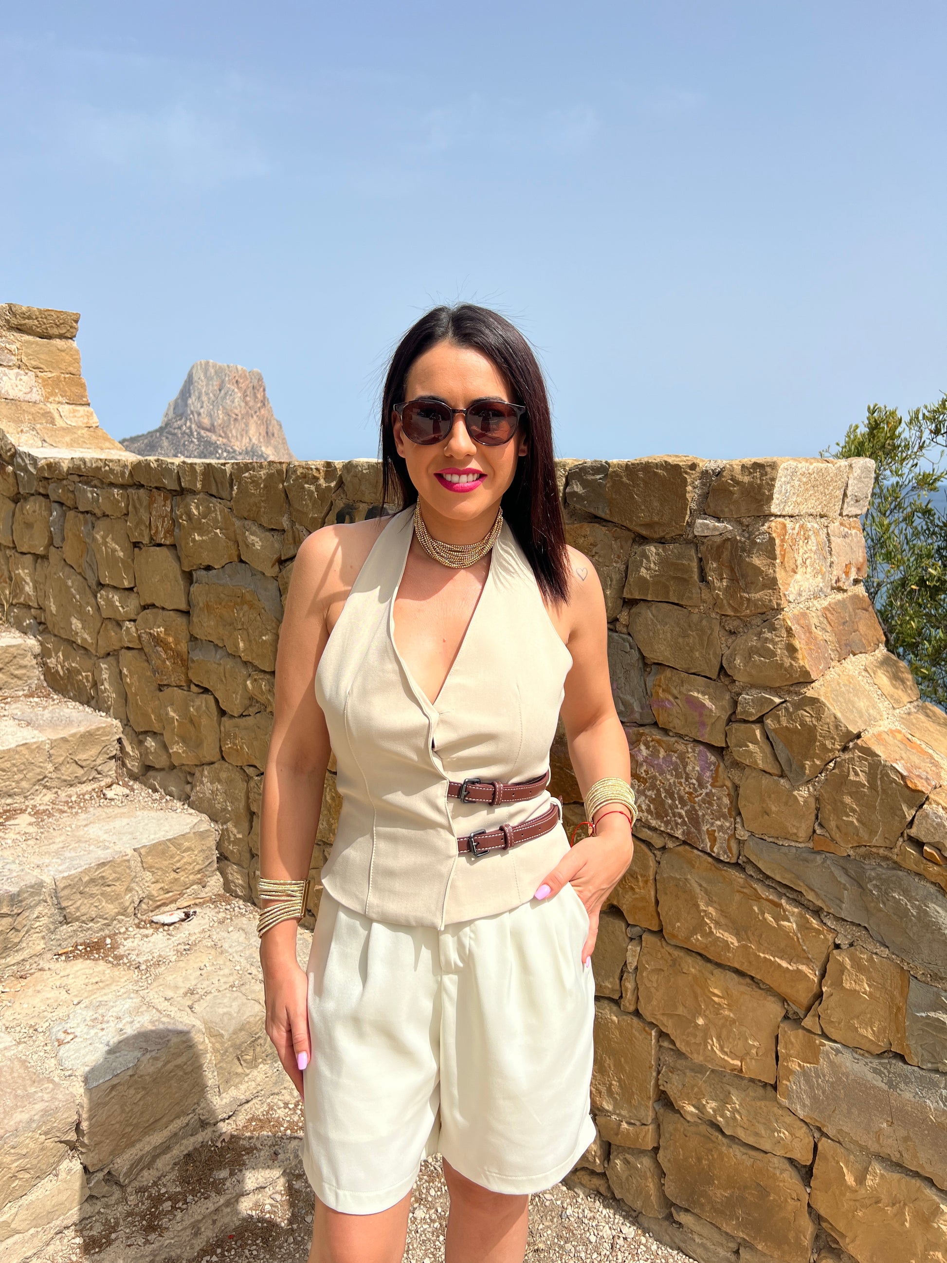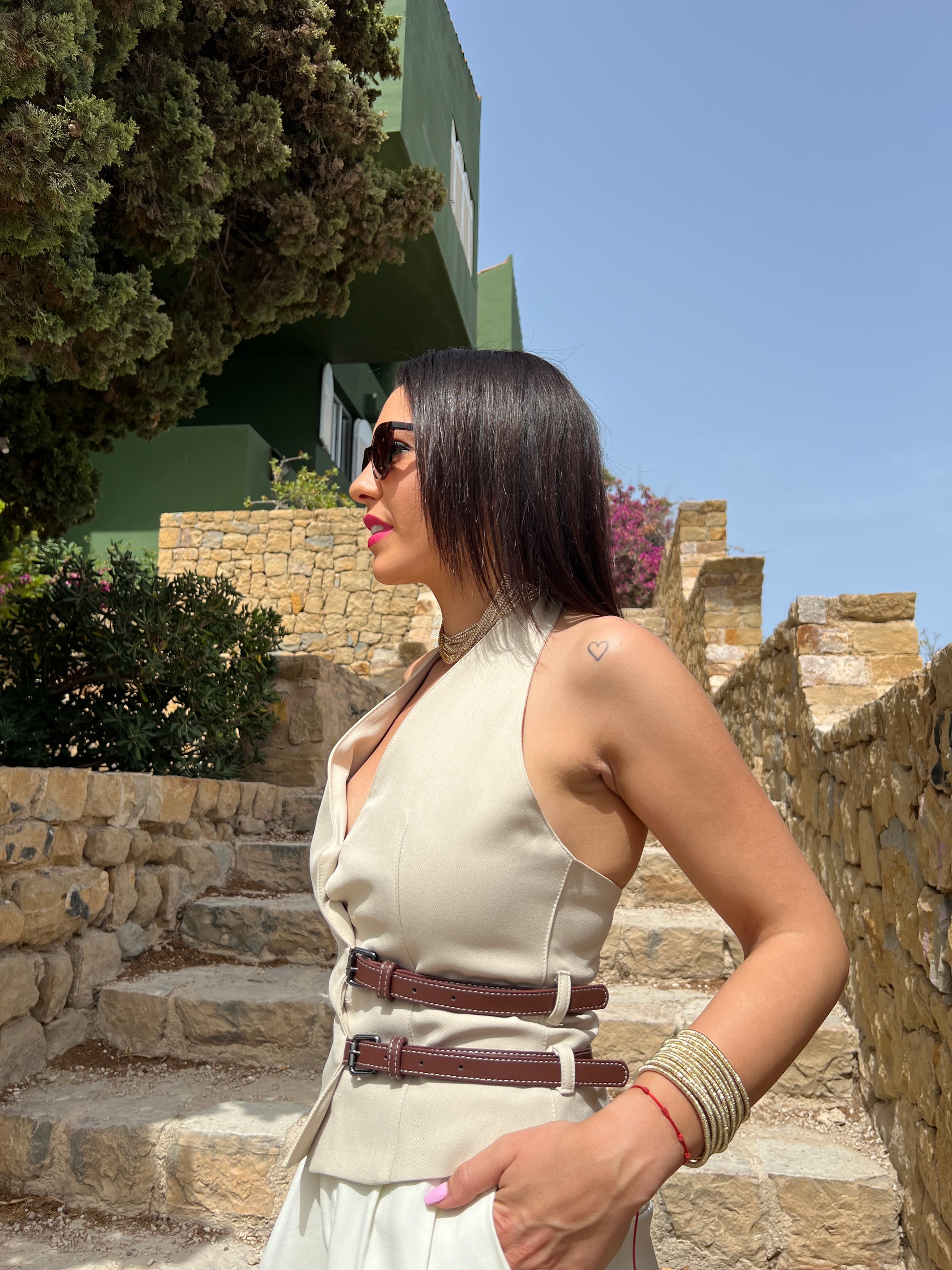 ¡Demuestra tu estilo con el original Chaleco Monaco! Diseñado en elegante color beige con botones centrales y dos cinturones marrones que se abrochan en la parte del costado delantero. ¡El complemento perfecto para tu atuendo!
