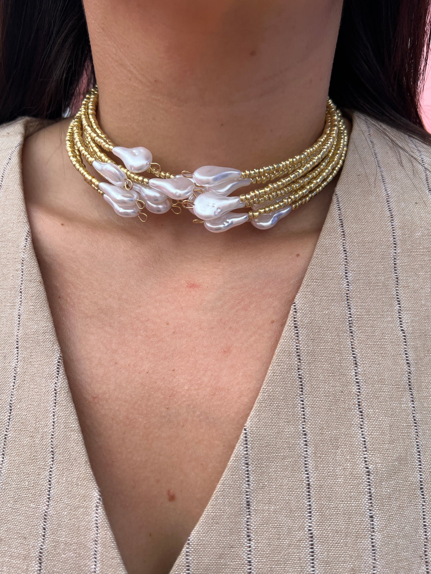 Descubre la elegancia y la exclusividad con nuestro Collar Libano. Este collar abierto es adornado con bolitas en dorado y una terminación en lágrima de perla, añadiendo un toque de lujo a cualquier look. Haz una declaración de estilo con este accesorio único en tu colección.