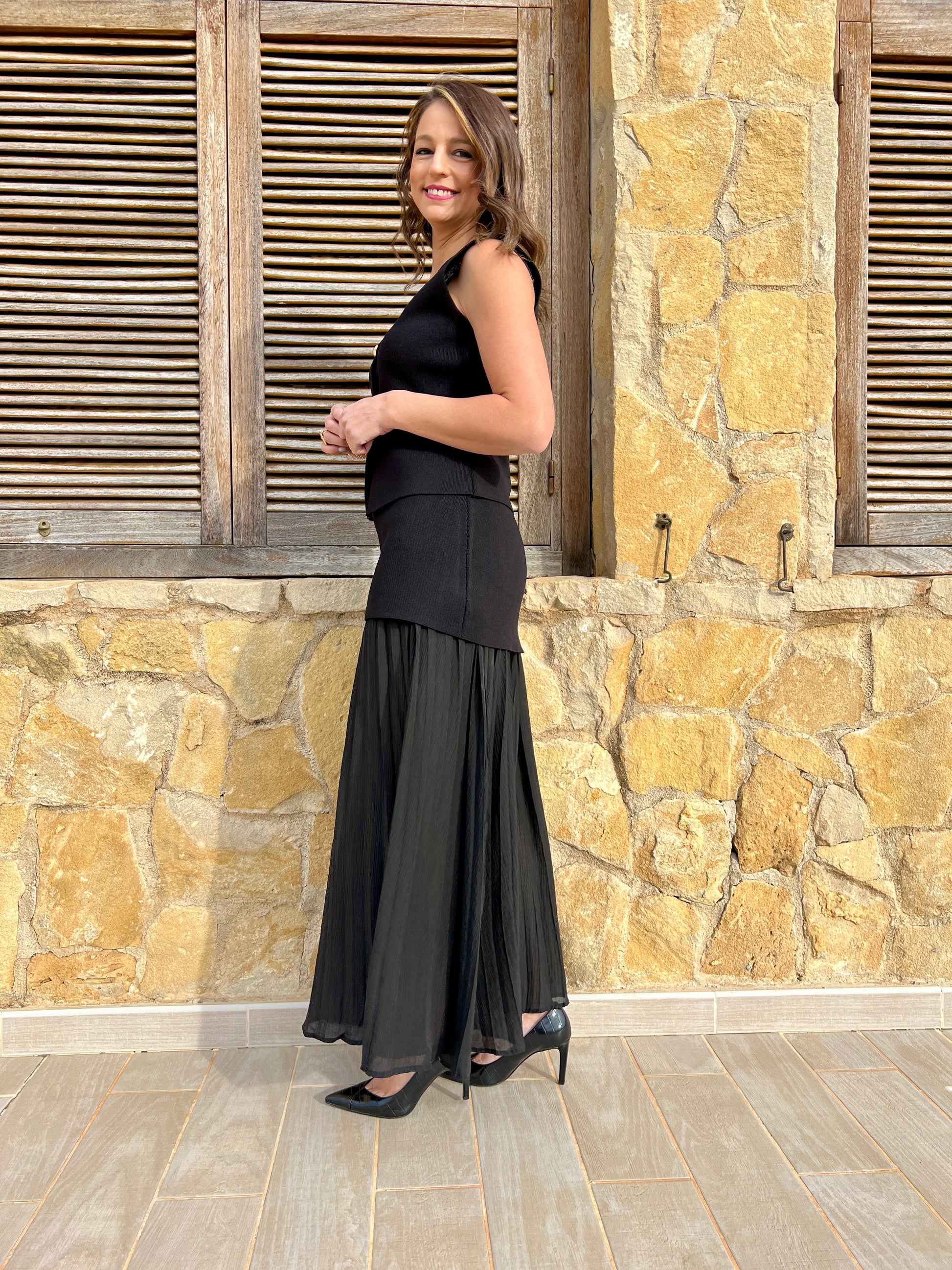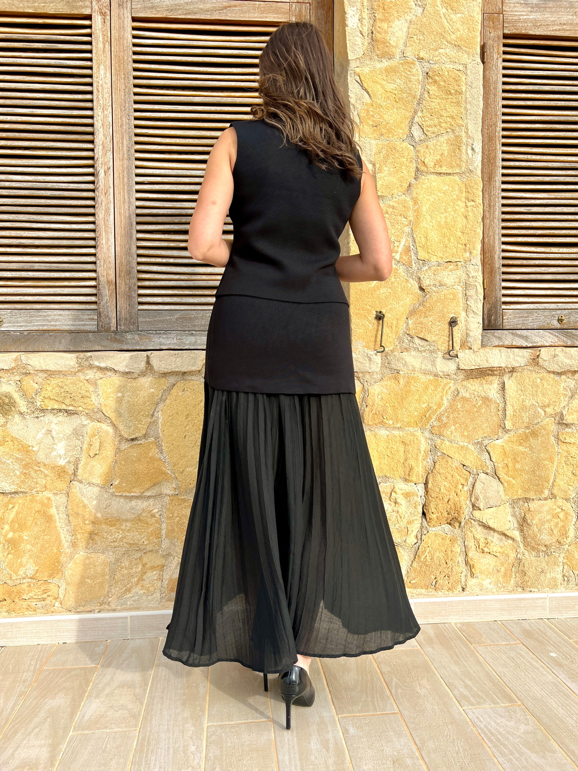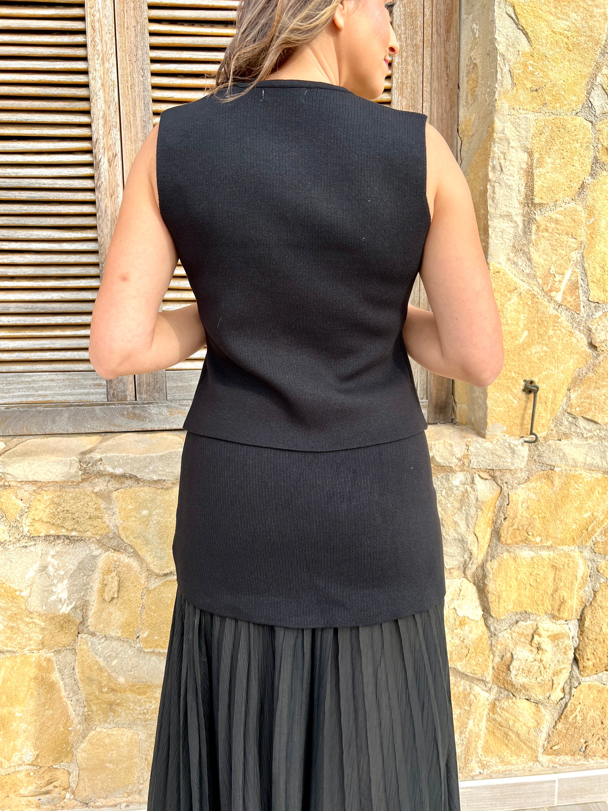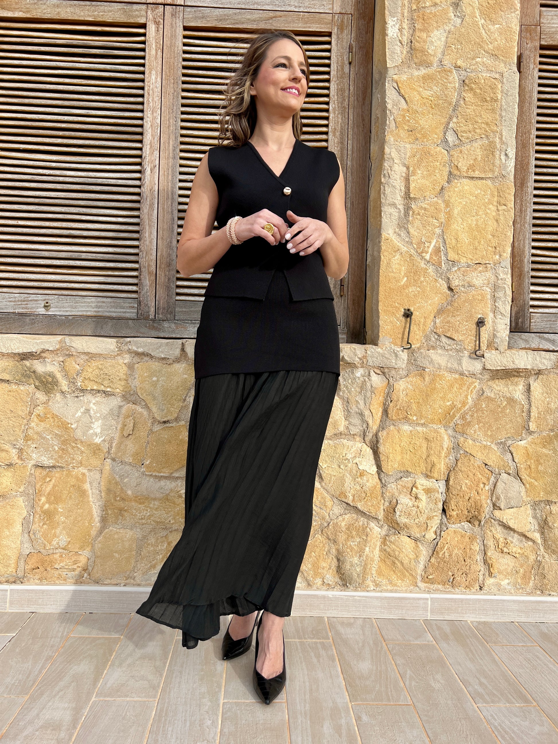 chaleco con botones el dorado, en la falda la parte más alta es de punto  y por debajo sale tejido plisado vaporoso.