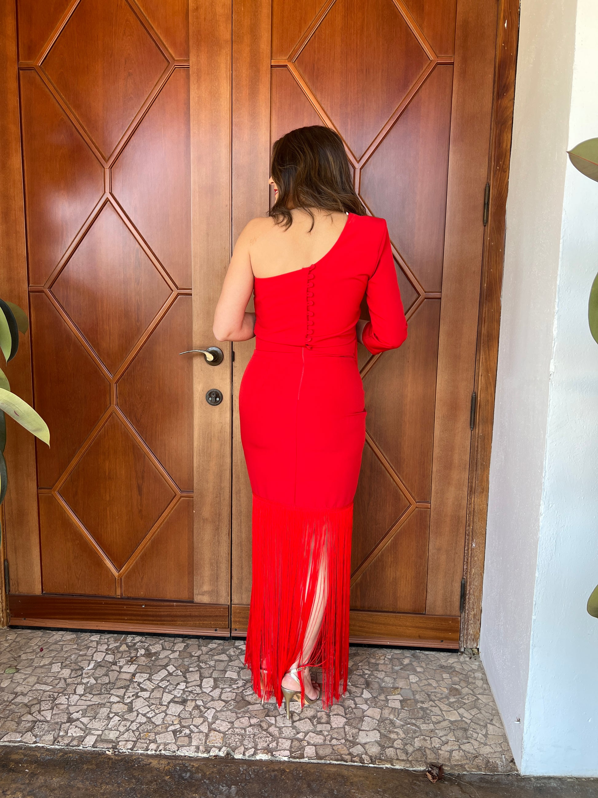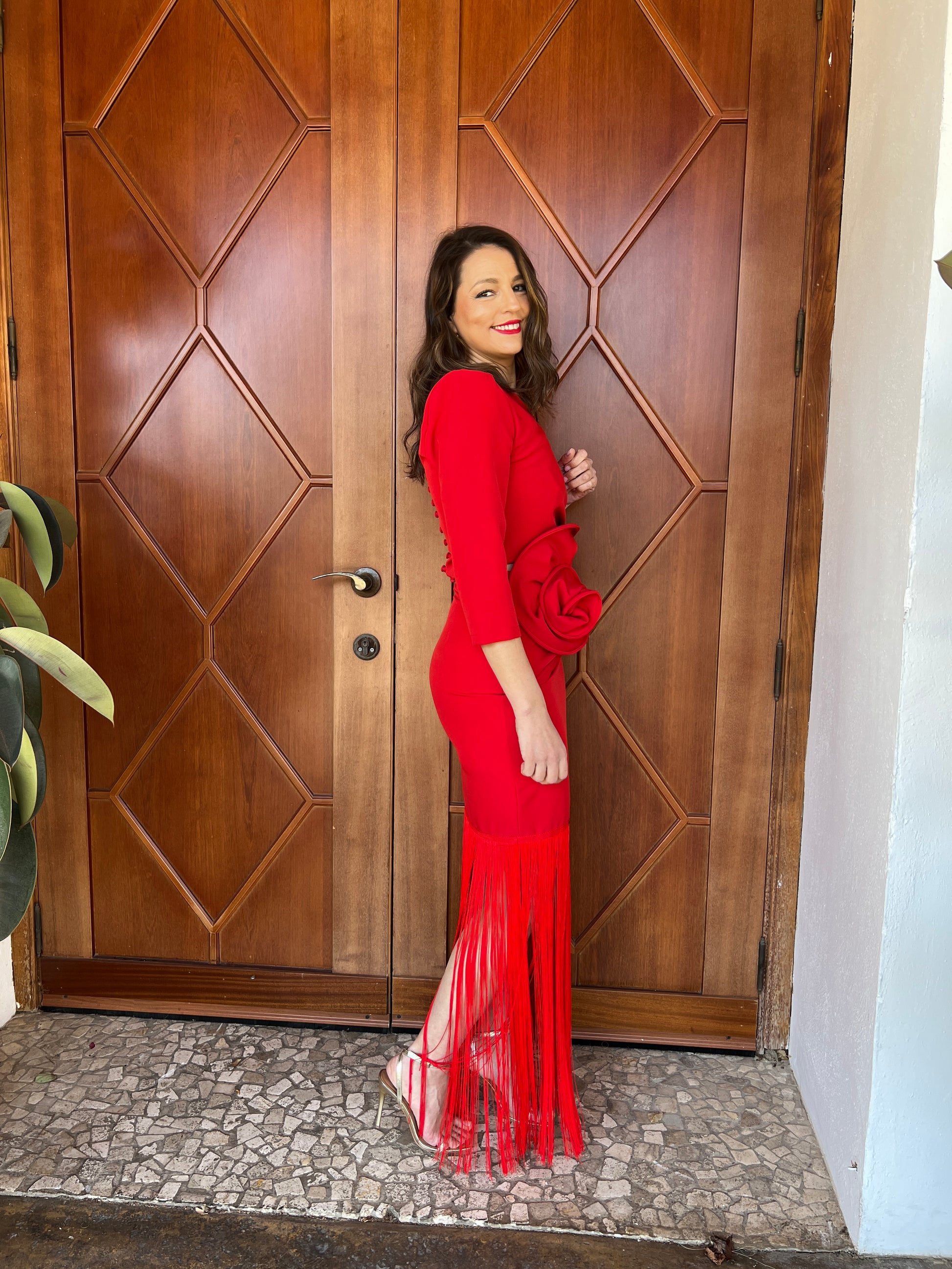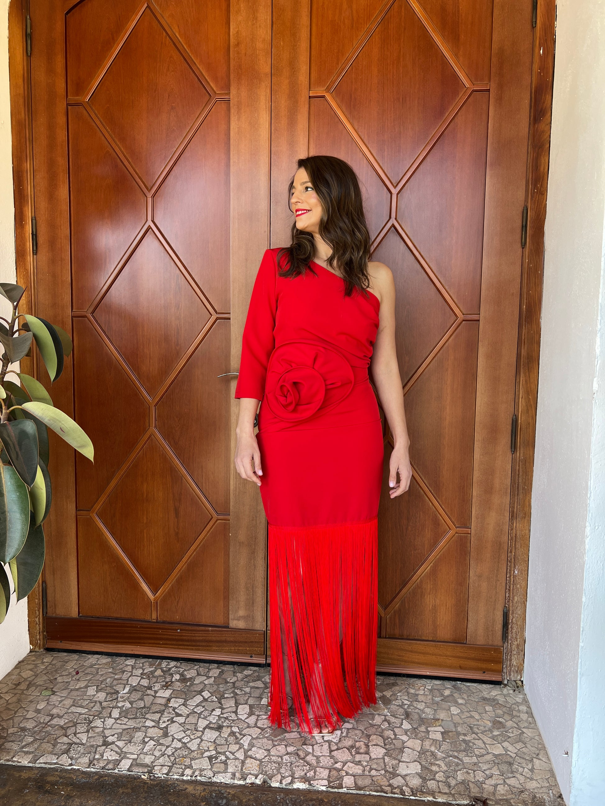 Este conjunto de fiesta Gadea es la elección perfecta para cualquier ocasión especial. Consta de dos piezas, un top asimétrico con botones en la parte trasera y una hermosa falda adornada con una flor en la cintura y flecos largos en la parte inferior. Añade estilo y elegancia a tu look de fiesta con este conjunto.