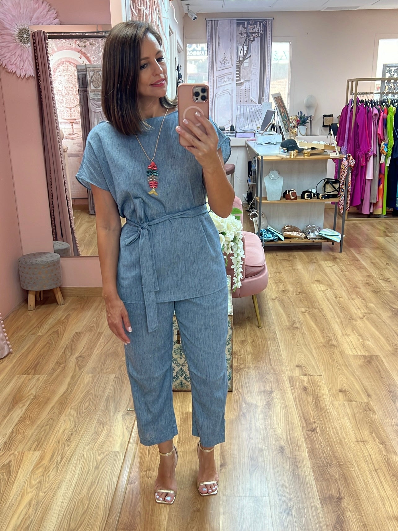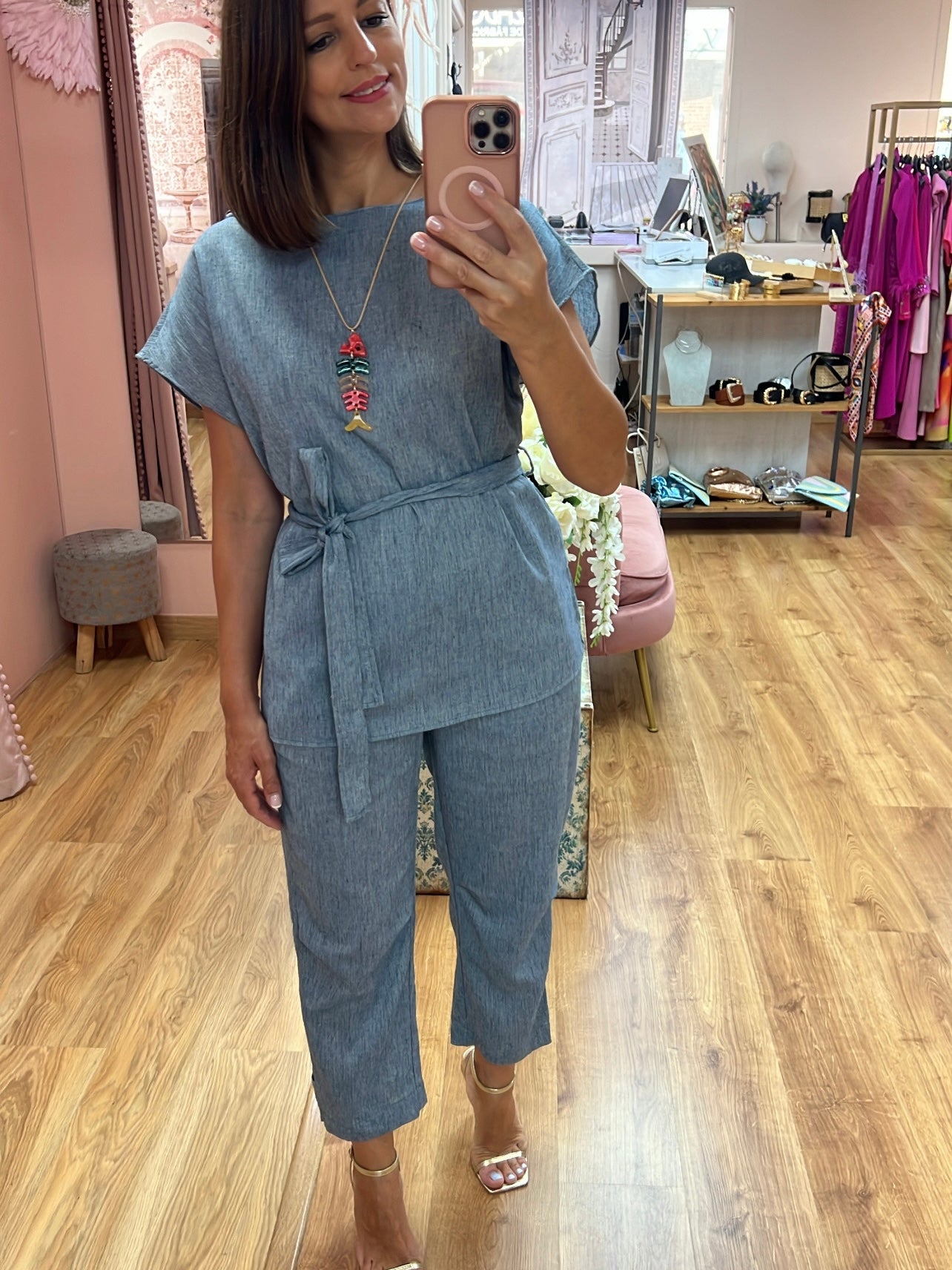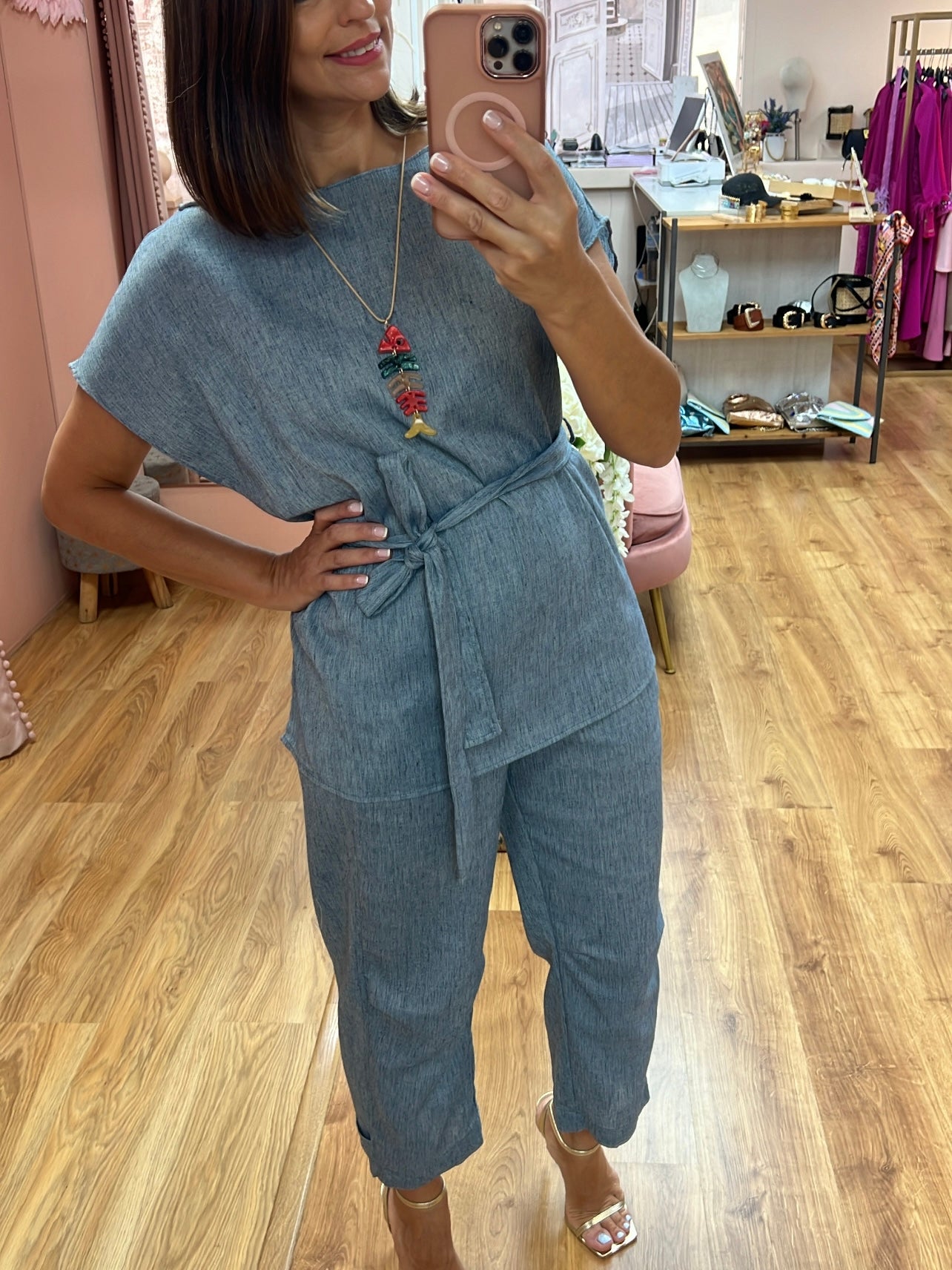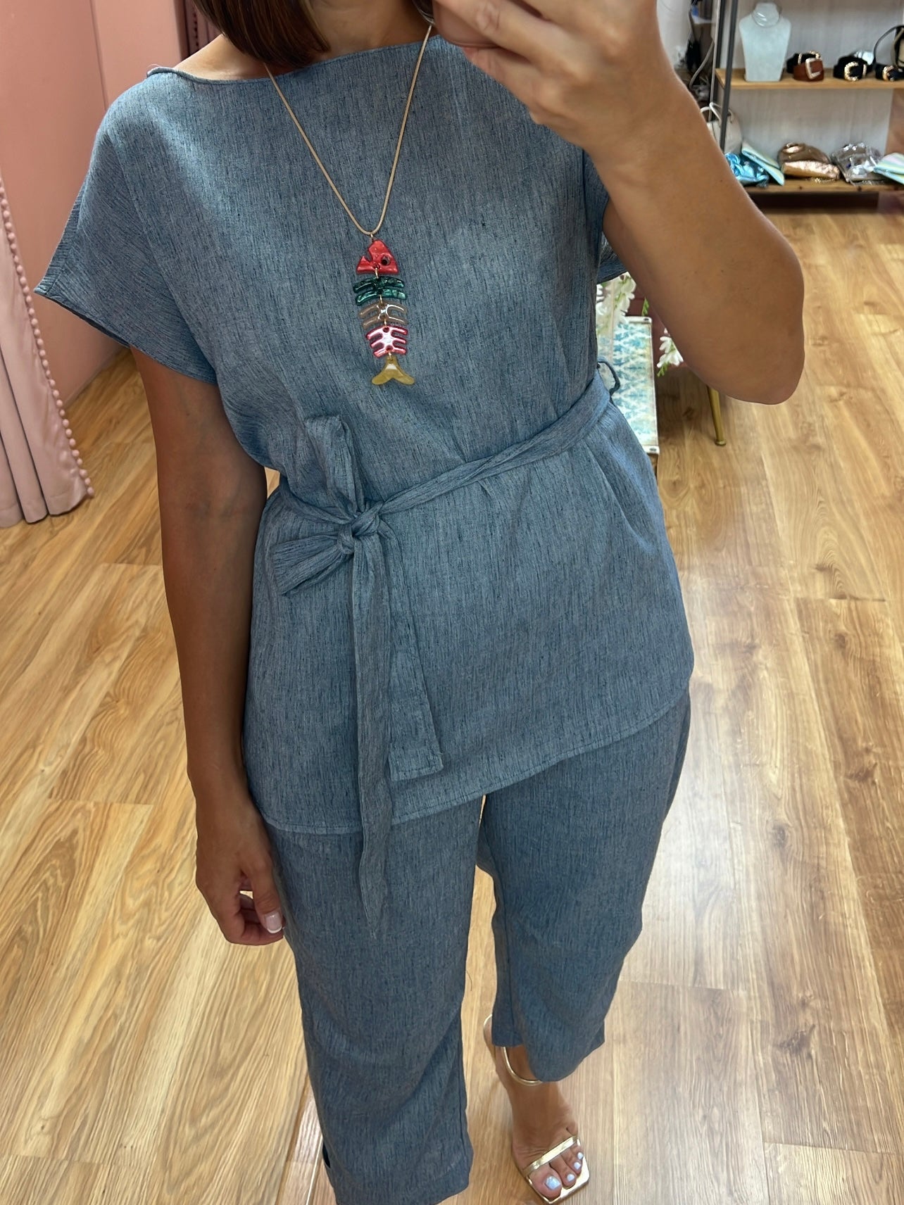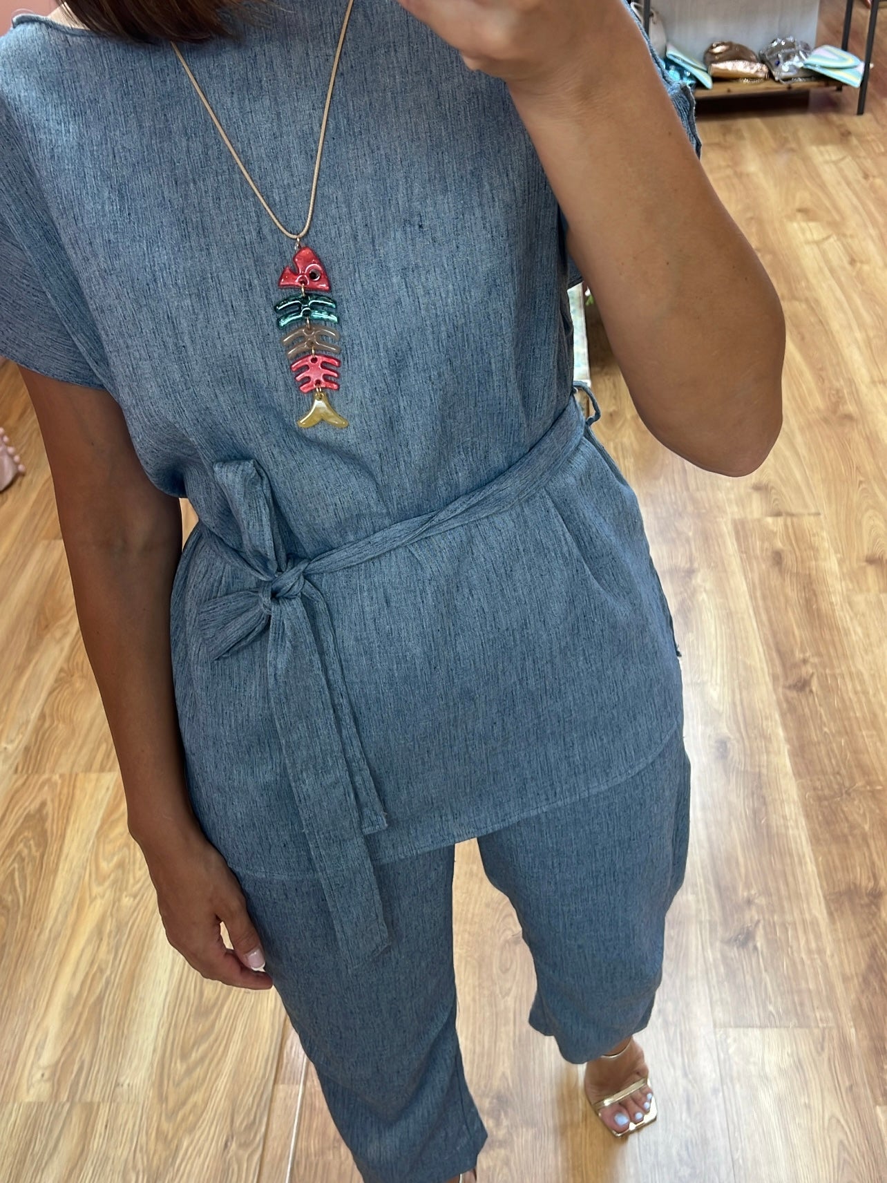 Conjunto 80%de algodón 20%lino la parte de arriba es obeso e en tallaje de SM/ LXL En corte recto con cinturón a conjunto para poder ajustar al modo deseado