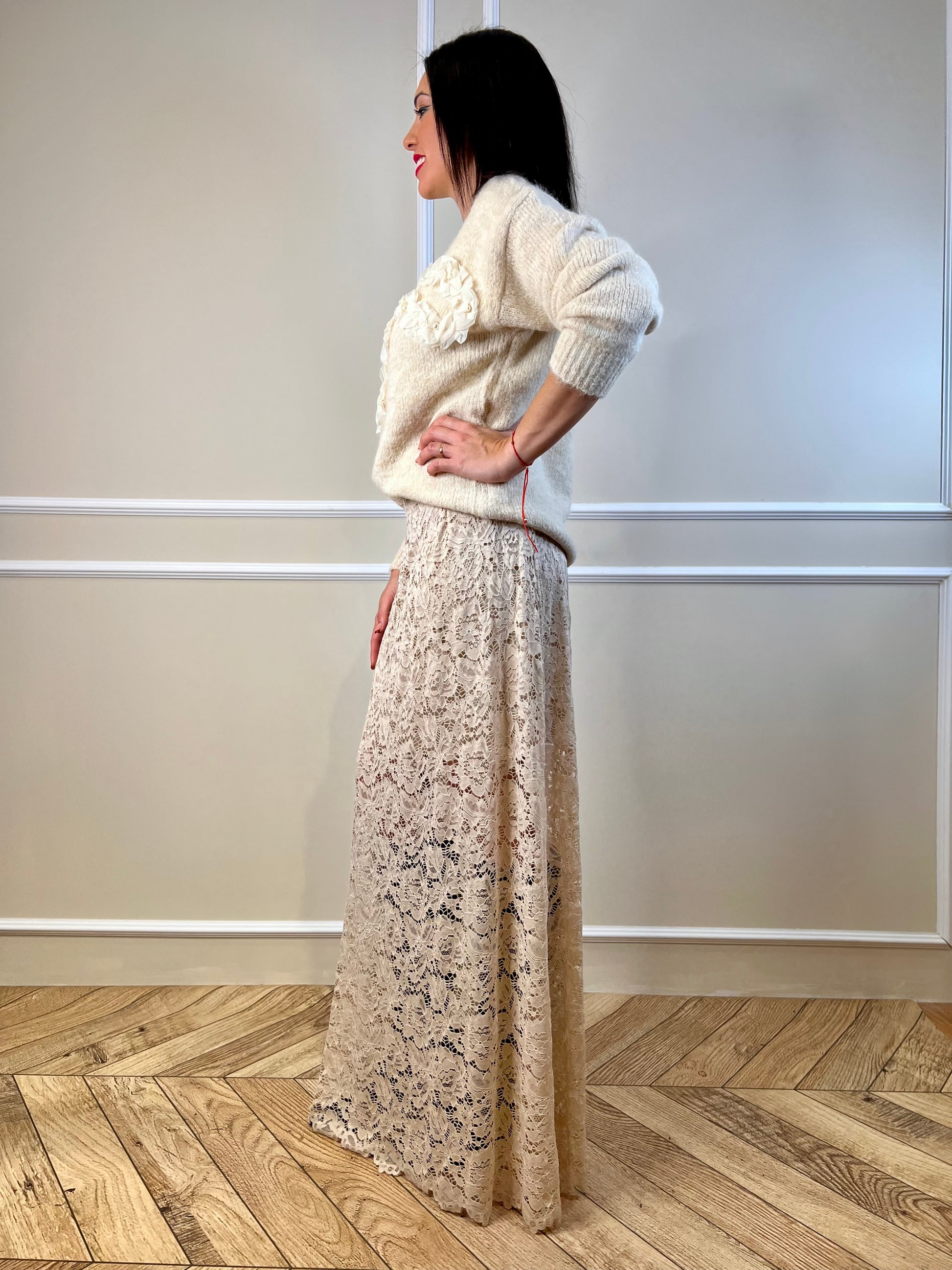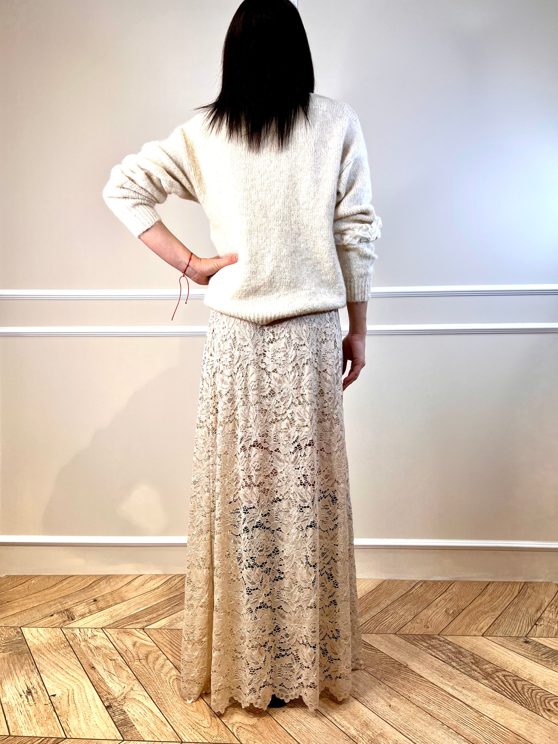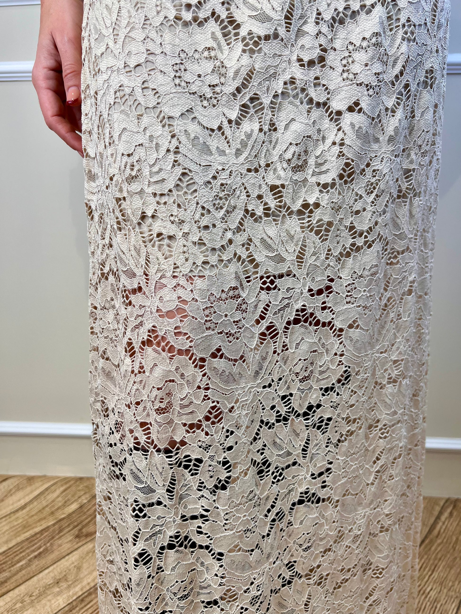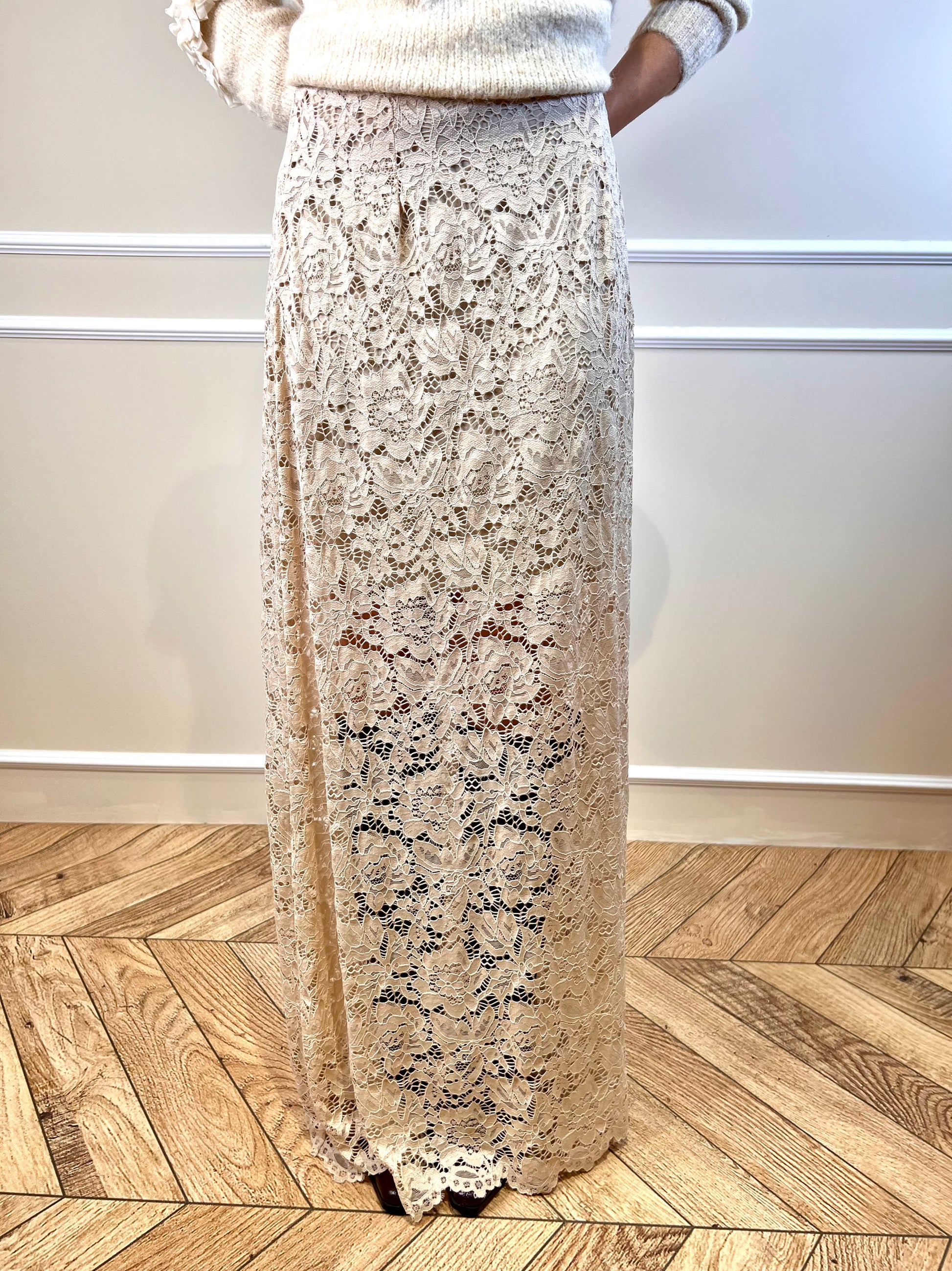 La Falda Encaje es perfecta para un look elegante y sofisticado. Con un diseño largo de encaje y un forro que llega hasta la rodilla, crea una transparencia encantadora en la parte de abajo. Añade un toque de sensualidad a tu outfit con esta falda única.