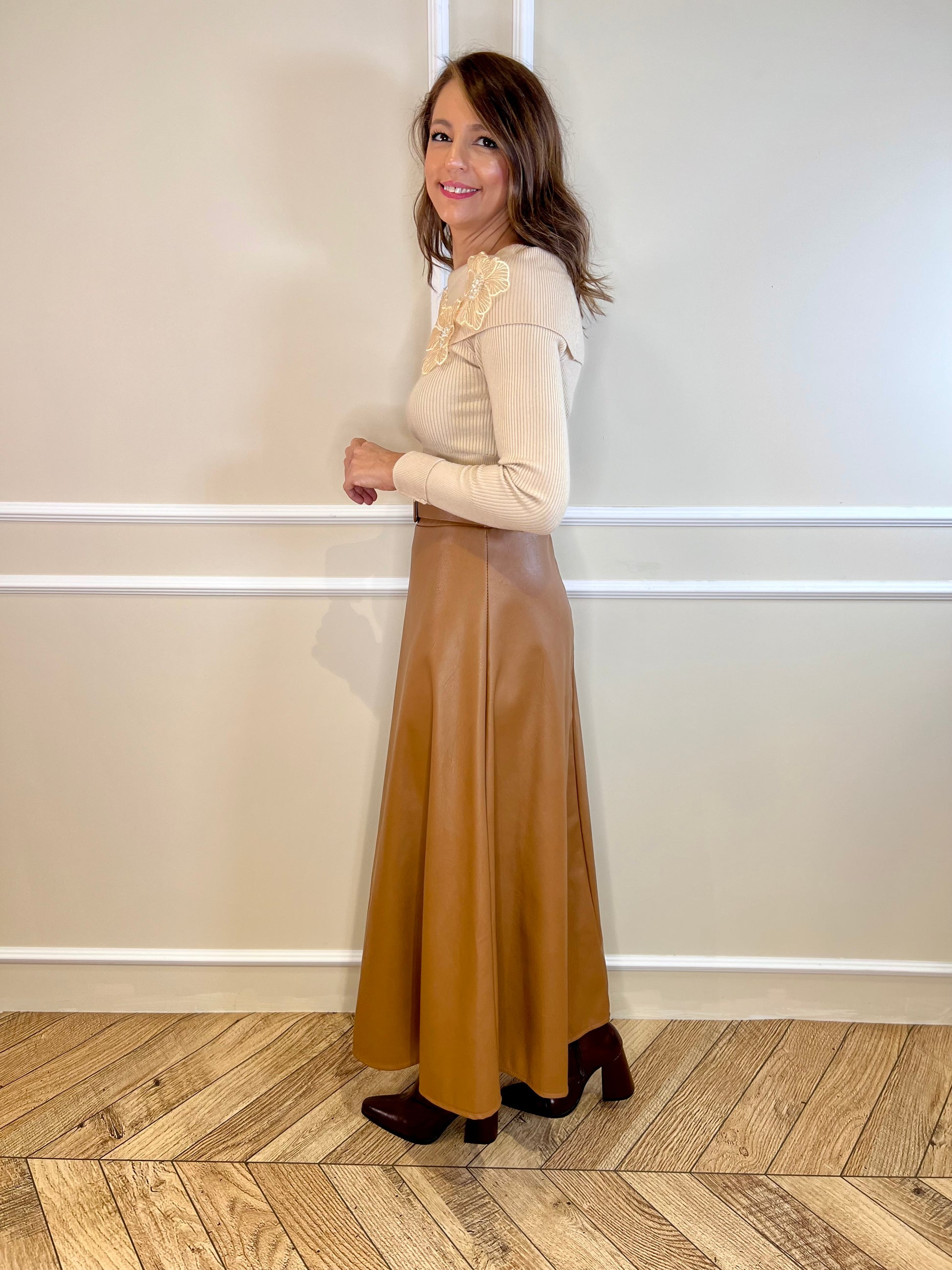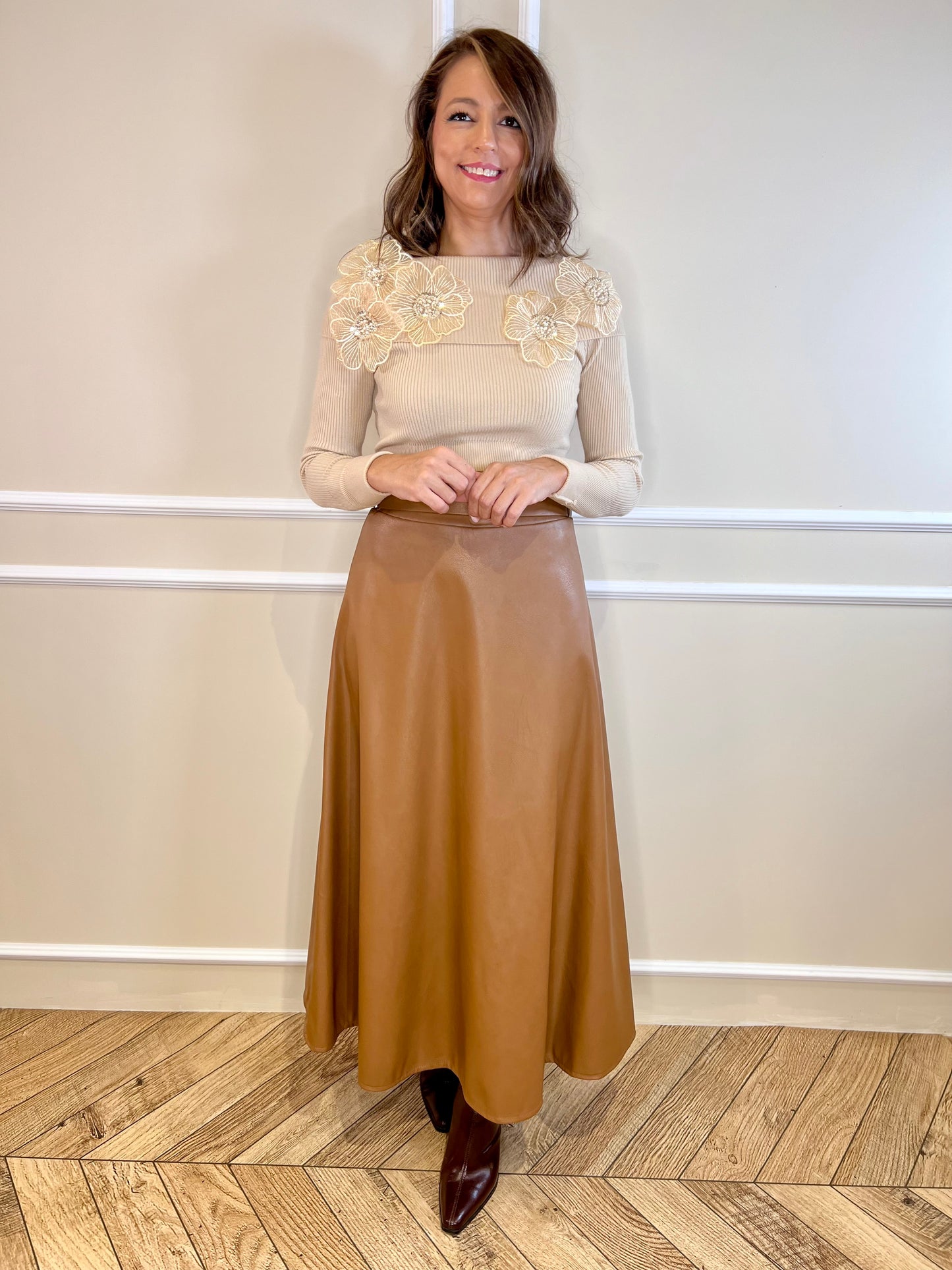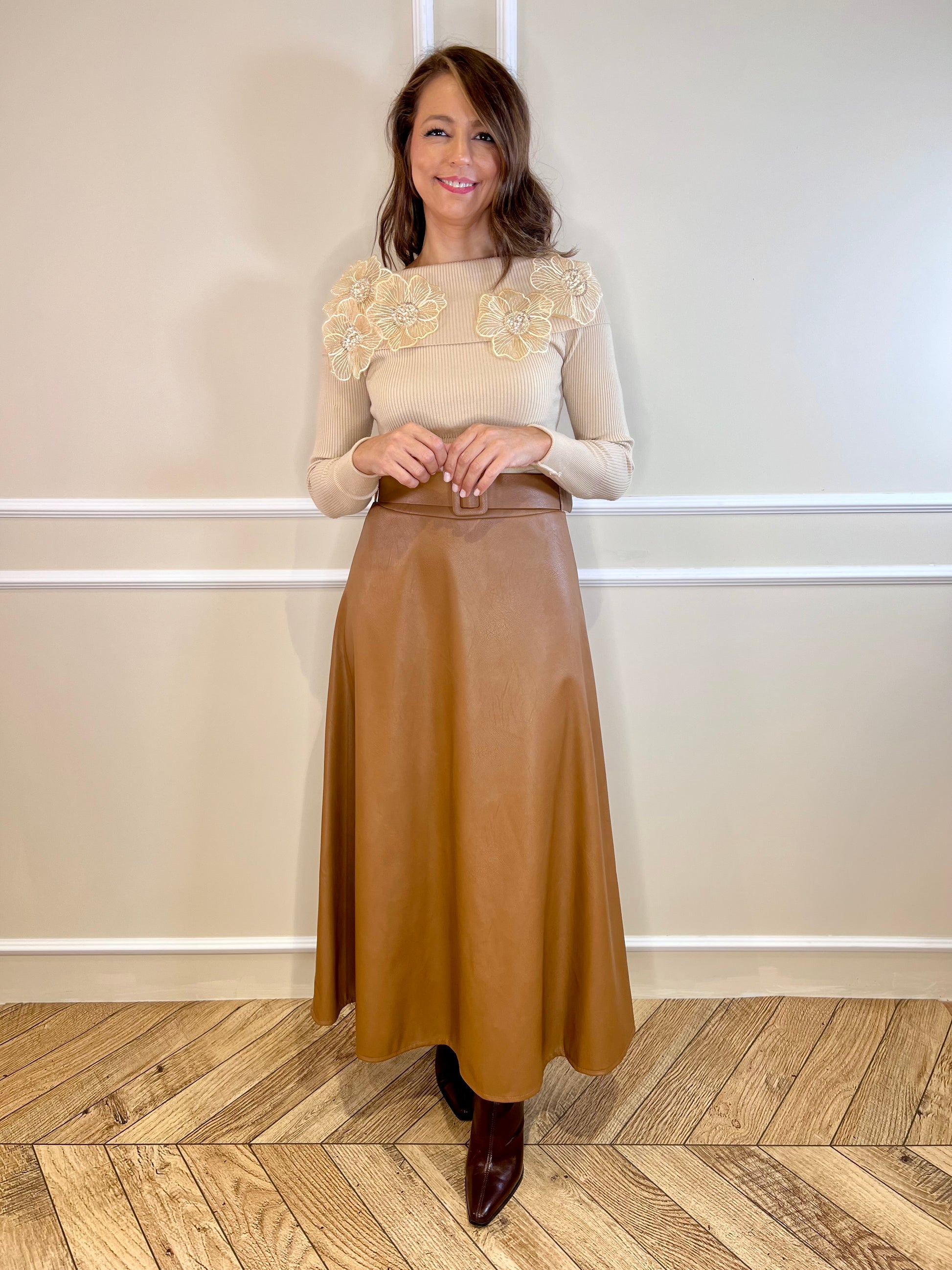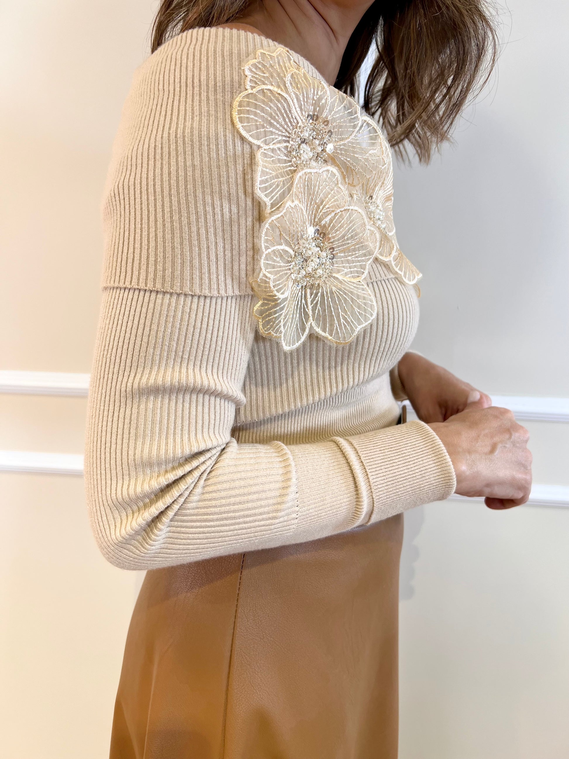 Envuélvete en elegancia con nuestro jersey Noa Camel. Su ajuste en punto de canale y su escote barco te brindarán comodidad y estilo. Los delicados apliques de flor en el mismo tono completan este look sofisticado y exclusivo.
