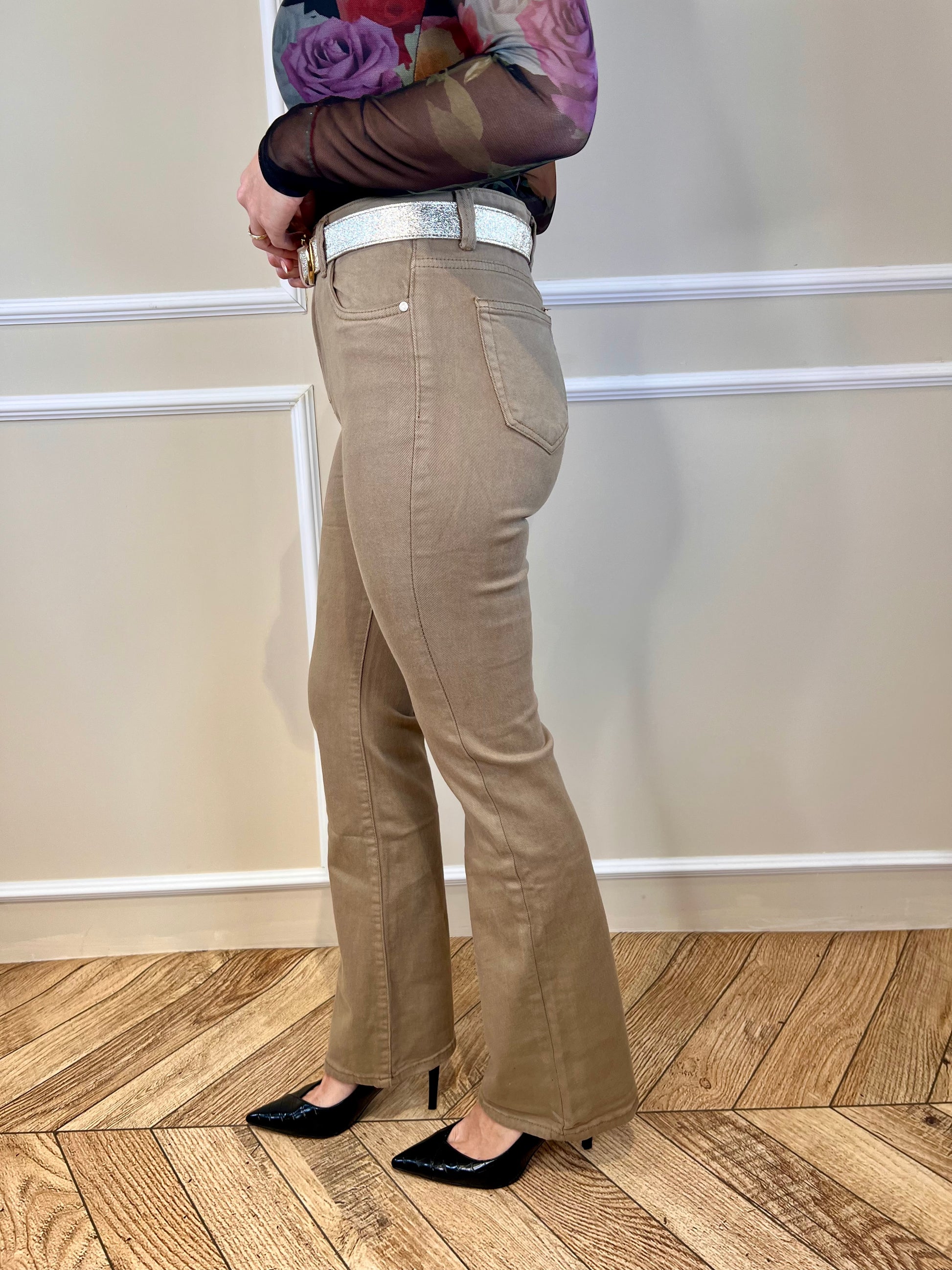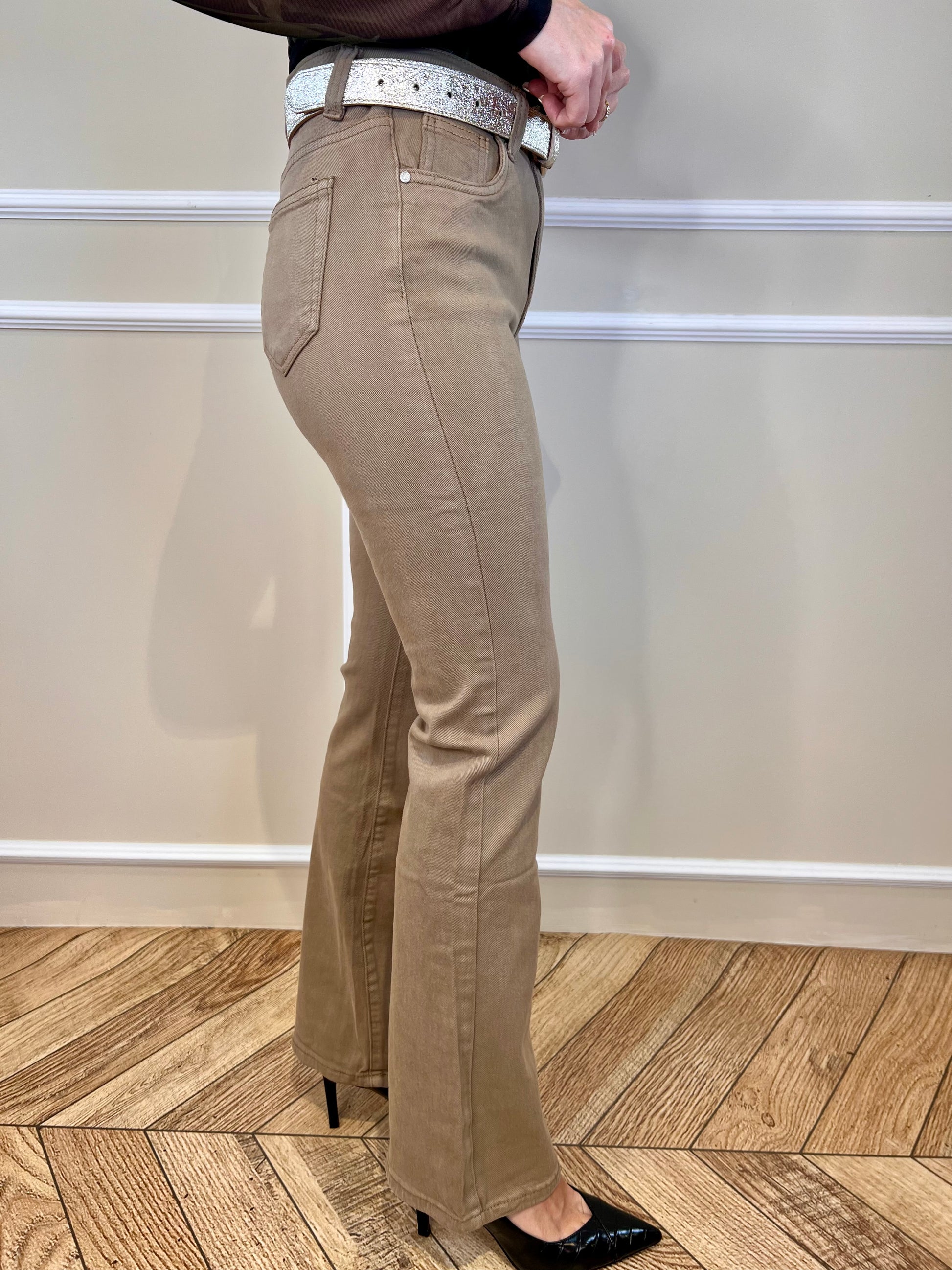 Pantalón con efecto faja, recoge la barriga creando un efecto de barriga plana. De color camel corte flared acampanado.