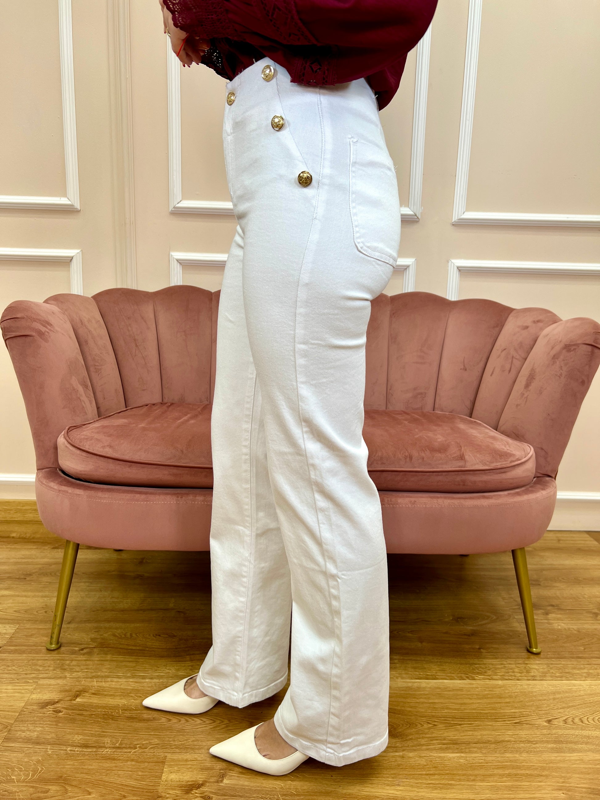 Déjate seducir por el estilo y la elegancia del Pantalón Katia Blanco. Confeccionado con tejido vaquero elástico que se adapta perfectamente a tu figura, este pantalón de corte recto cuenta con bolsillos en la parte trasera, y botones decorativos en dorado en la parte de delante. Una prenda imprescindible para lucir una silueta impecable y sofisticada. ¡No te lo pierdas!