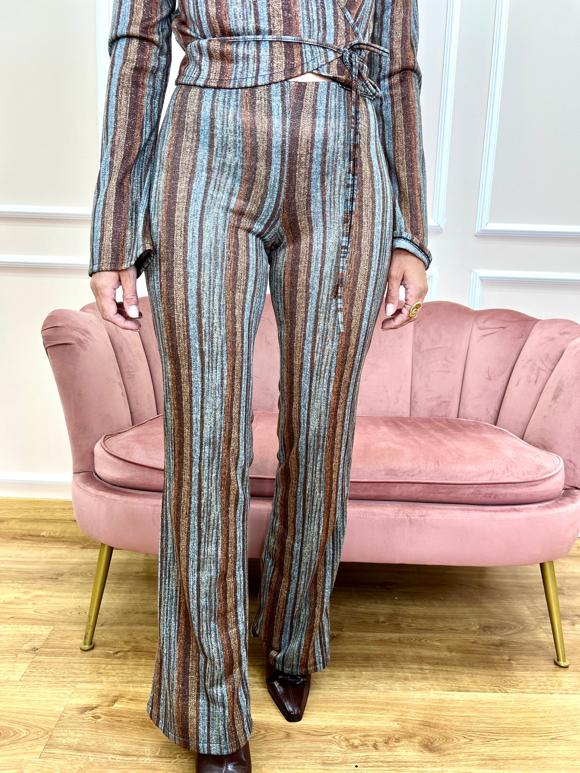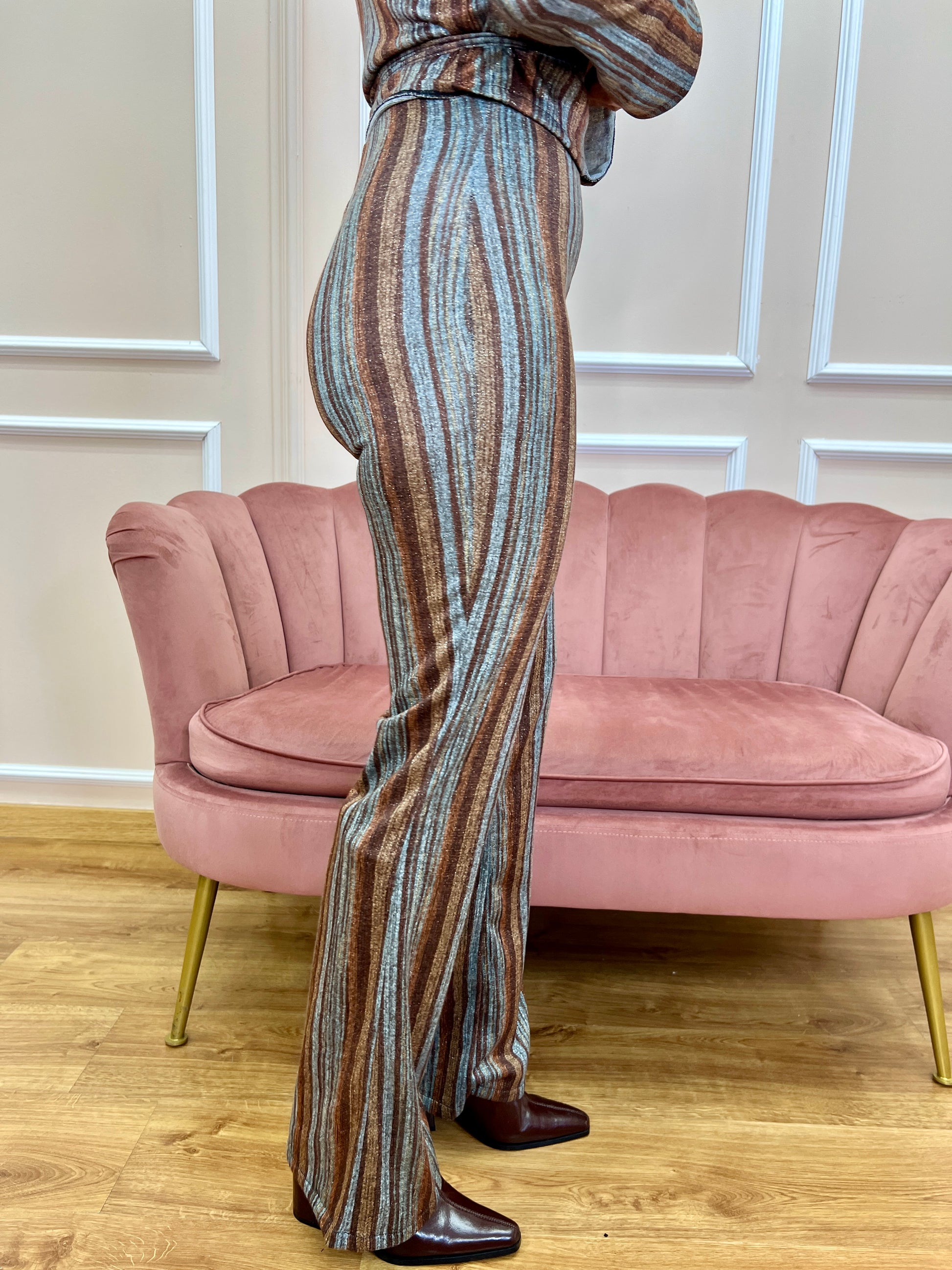 El Pantalón Kenny es la prenda perfecta para agregar un toque de elegancia y comodidad a tu guardarropa. Confeccionado en un tejido de lurex elástico en tonos marrón y azul, su diseño ligeramente acampanado te brindará un look sofisticado y moderno. ¡Descubre la versatilidad de este pantalón y luce siempre a la moda!