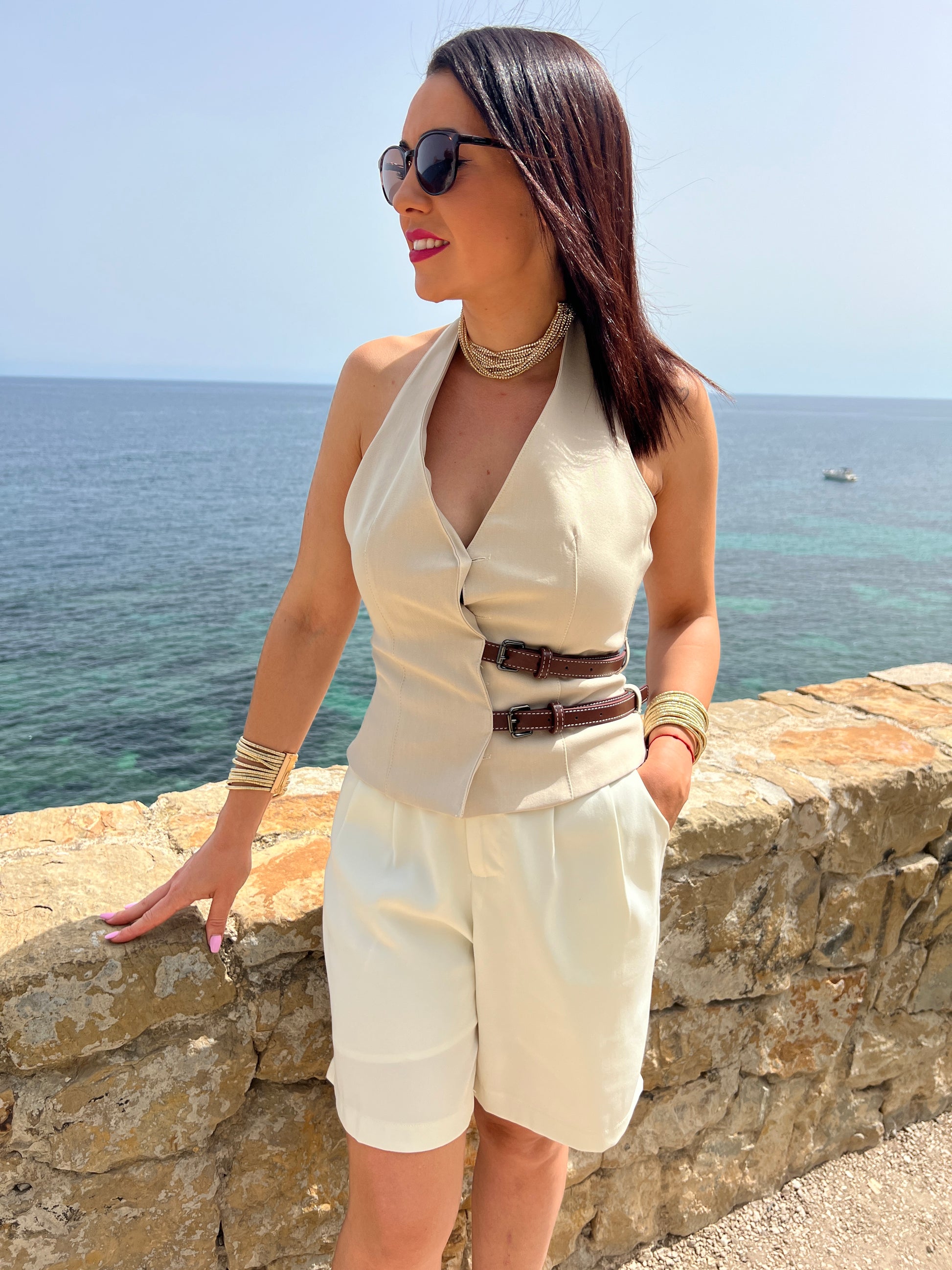 Experimente la comodidad y elegancia con nuestro Pantalón chino corto Short Lucia. Confeccionado con bolsillos y pinzas delanteras, este pantalón cuenta con un elástico en la parte trasera en un sutil tono beige. Perfecto para un look sofisticado y exclusivo en cualquier ocasión.