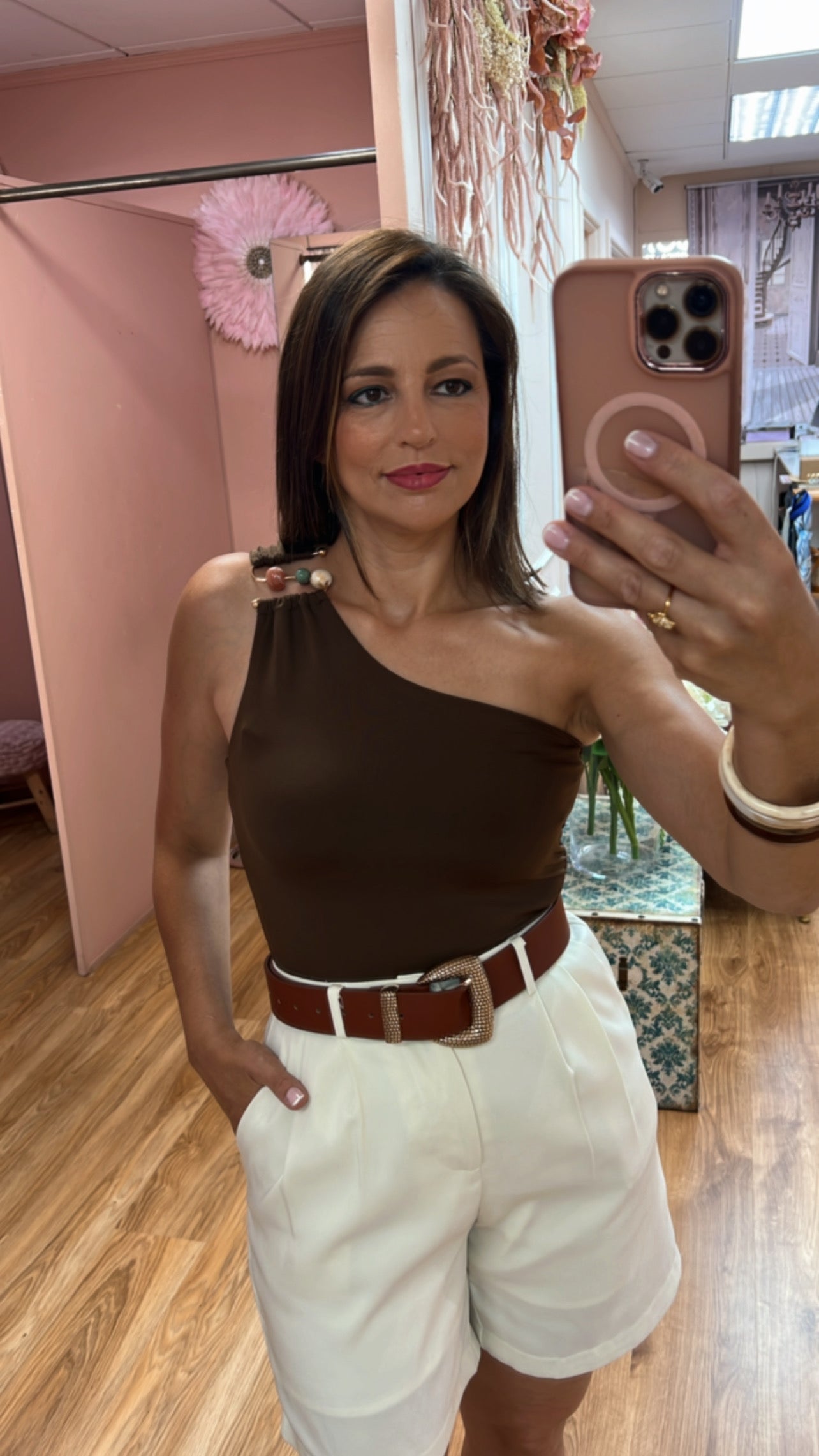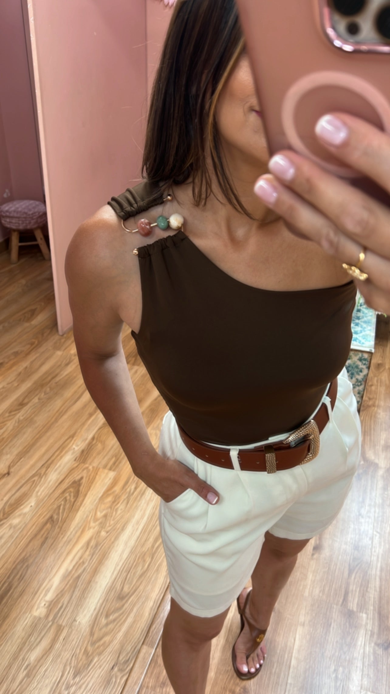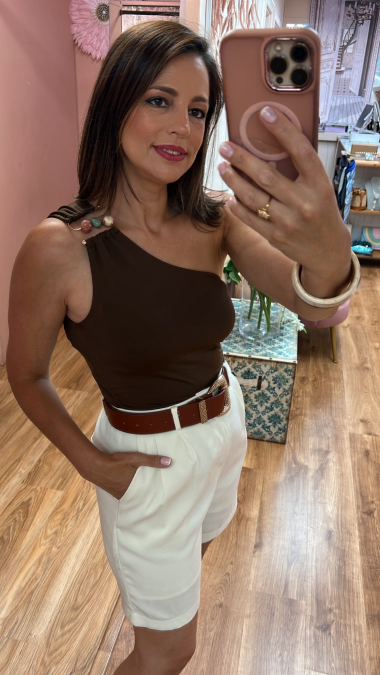 Este top Chiara es elegante y cómodo, con un diseño asimétrico elástico que se adapta a tu cuerpo. Su detalle en el hombro con tres piedras en diferentes colores le da un toque único. ¡Lúcete con estilo y comodidad!