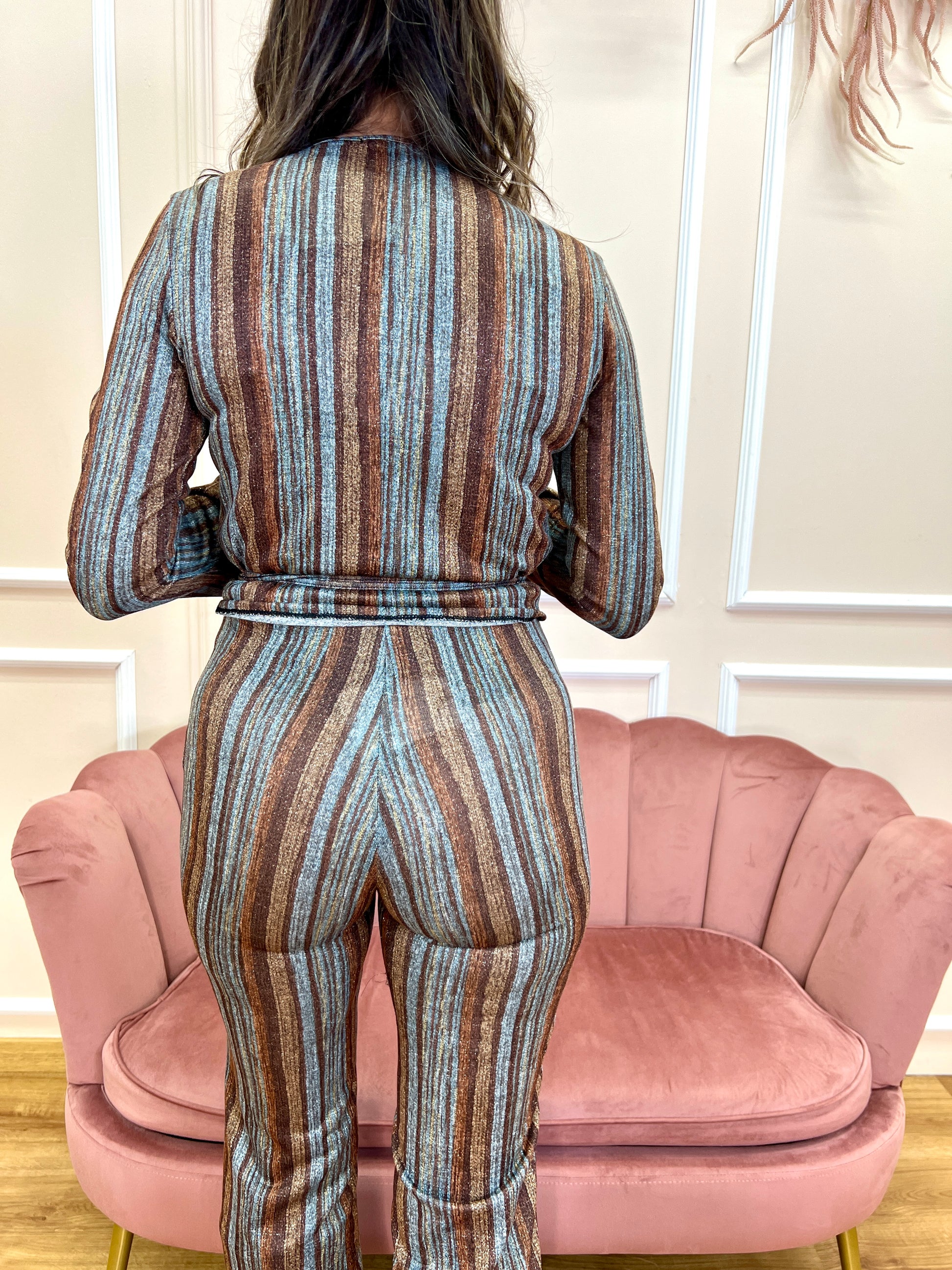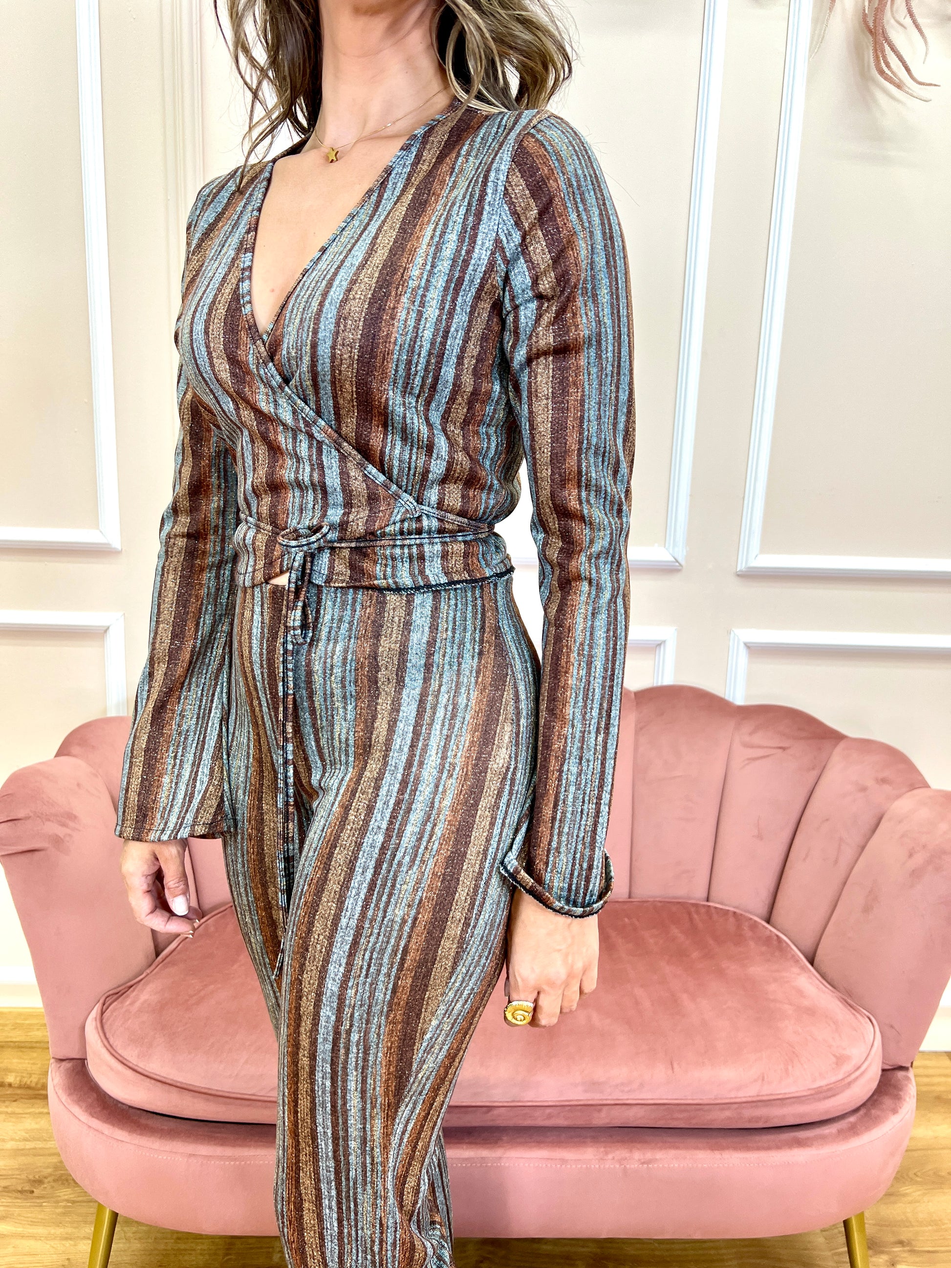 Este top Kenny cuenta con un diseño cruzado que realza la figura, junto con mangas ligeramente acampanadas para un toque de estilo. El estampado de rayas en lurex agrega un brillo sutil al conjunto. Ideal para ocasiones especiales o para darle un toque elegante a un look casual.