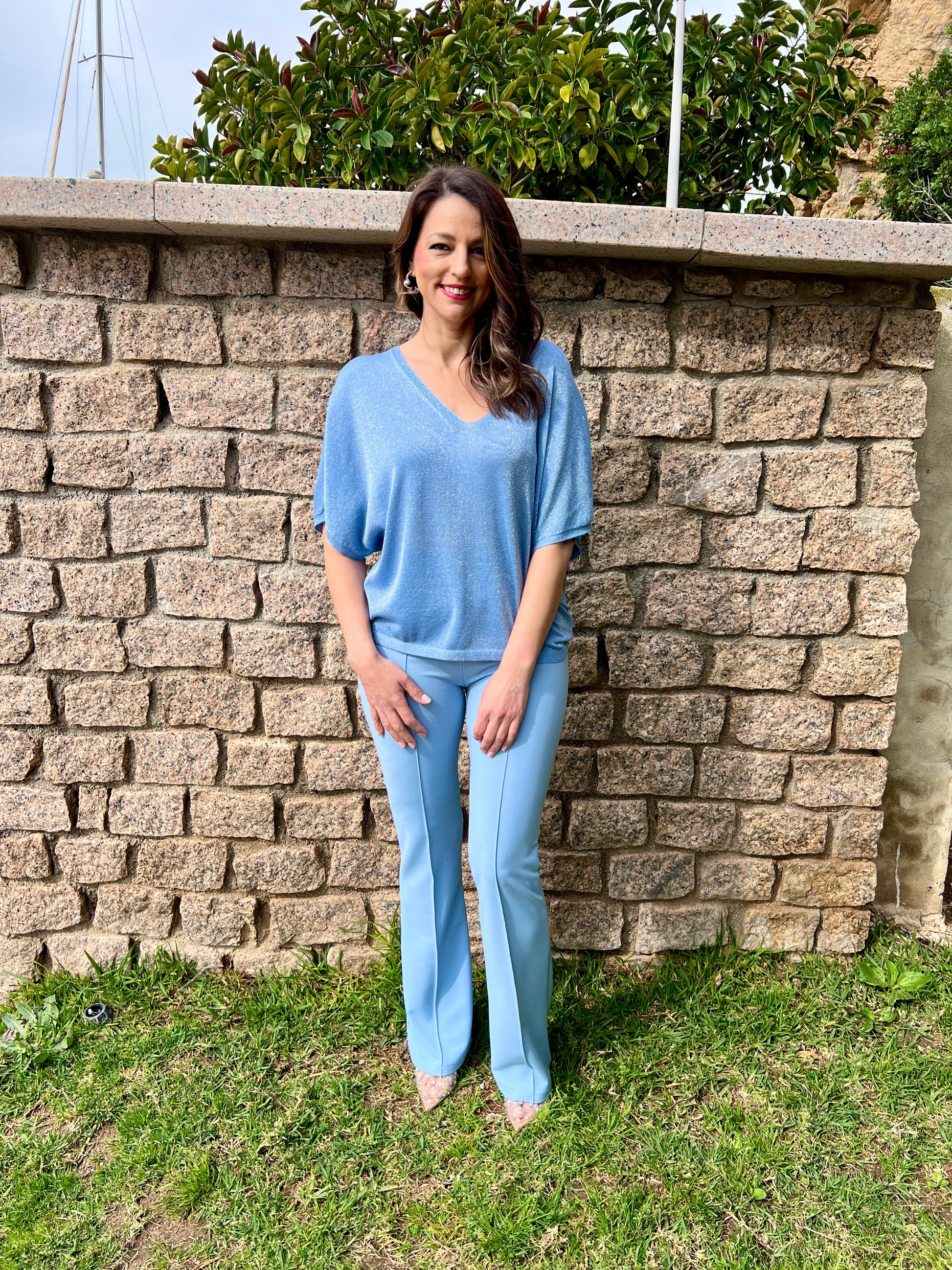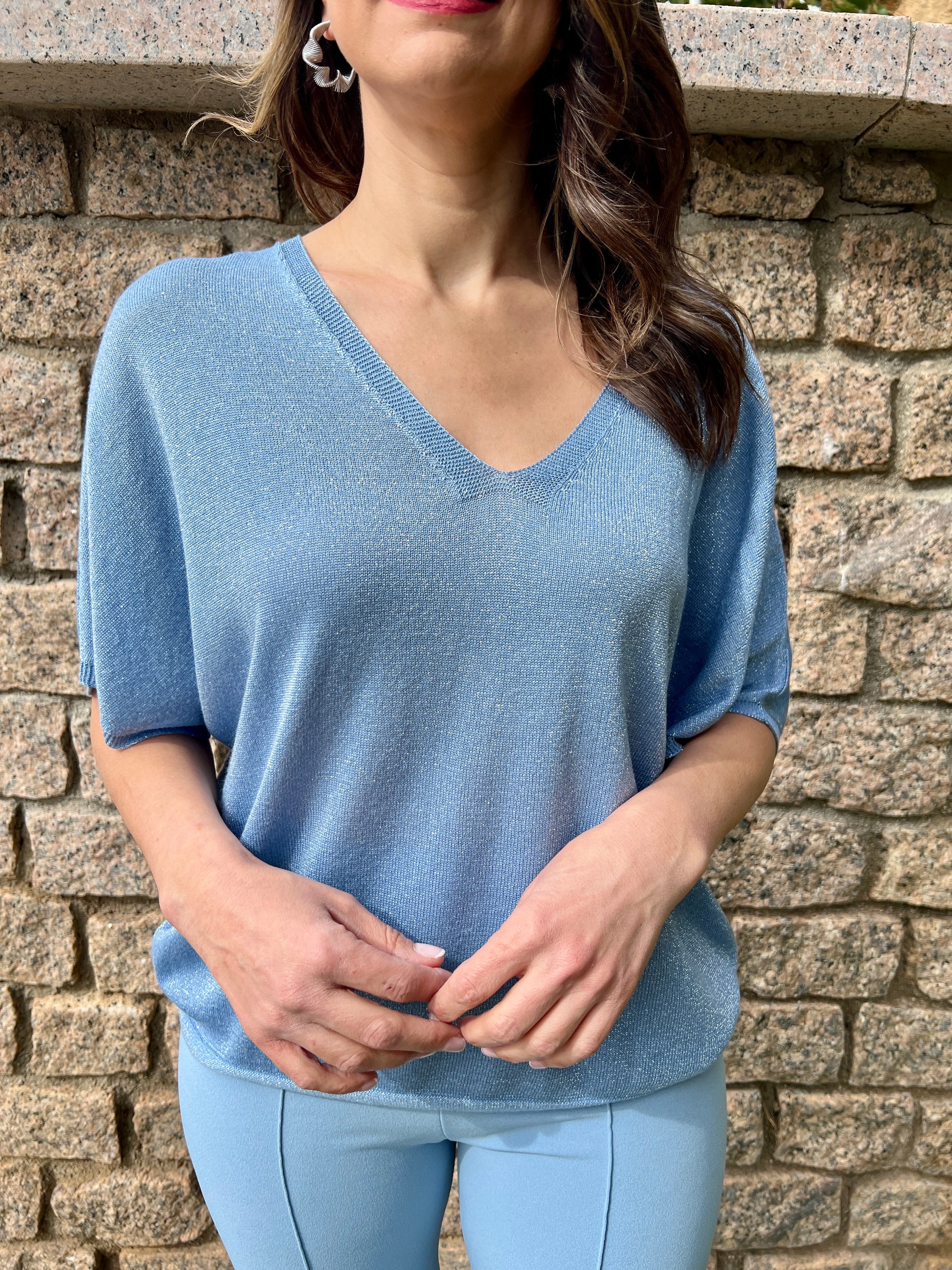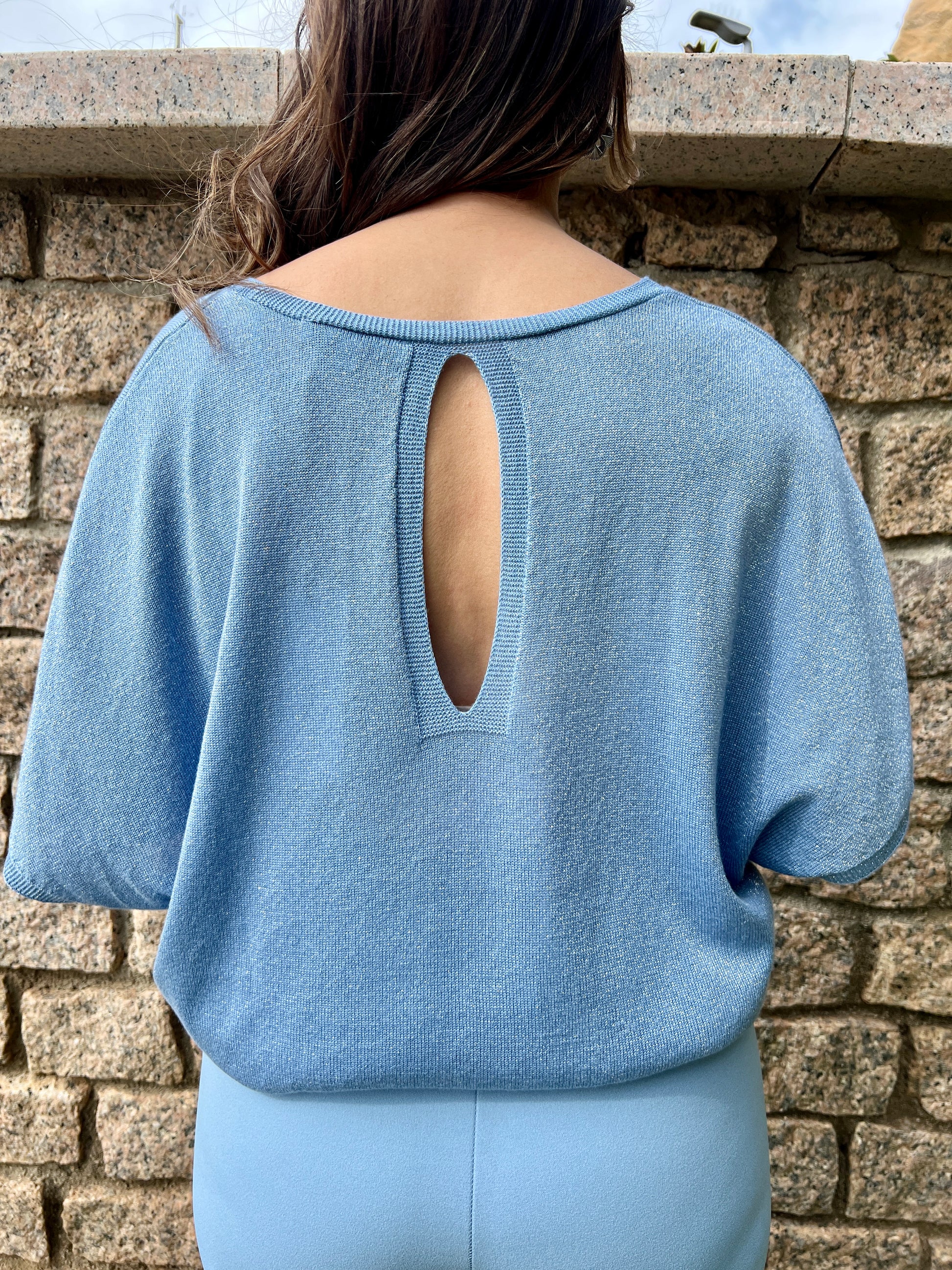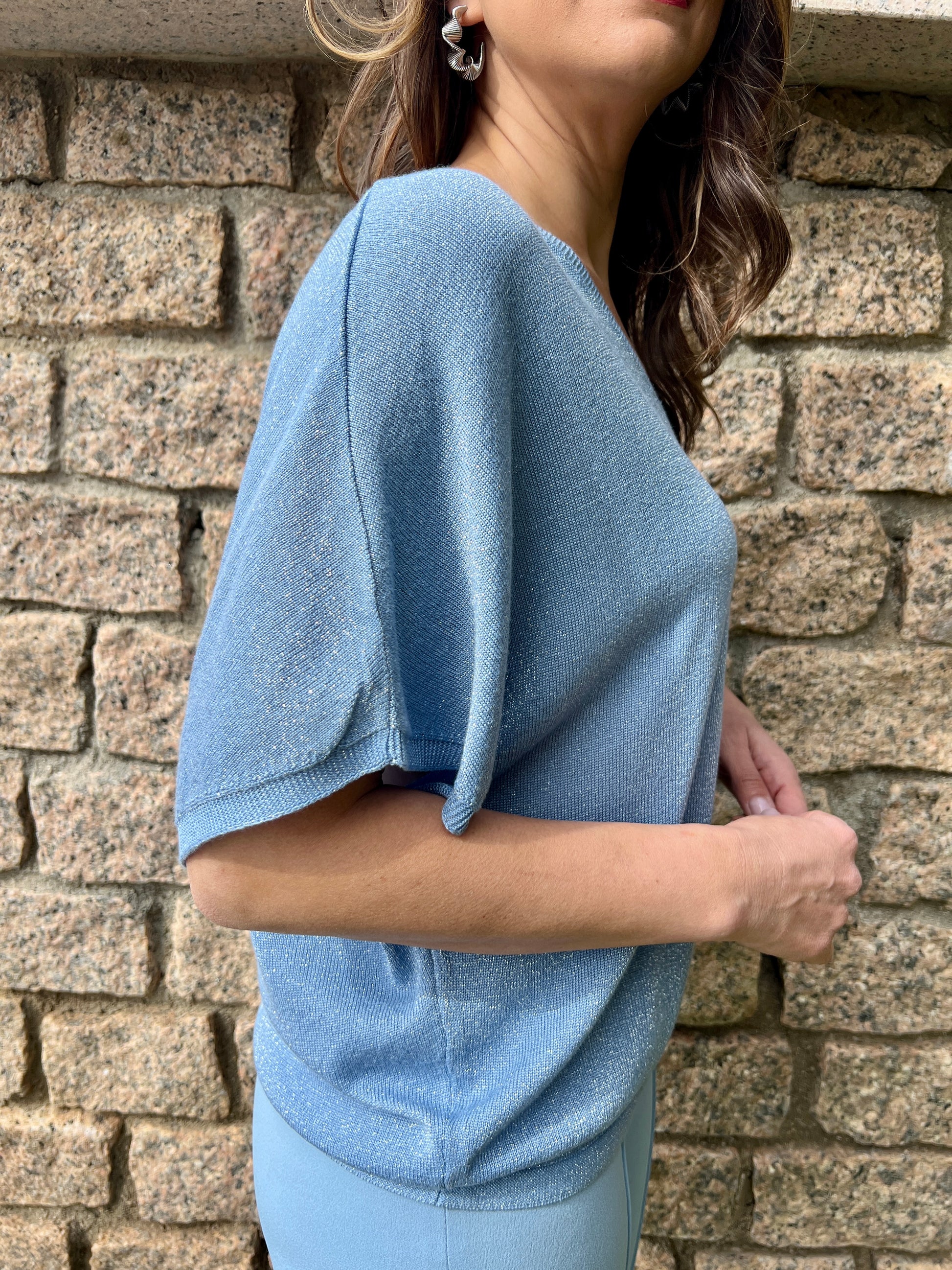 Este top de punto de lurex en un suave tono azul bebé es la elección perfecta para un look elegante y sofisticado. Confeccionado con materiales de alta calidad, te brinda comodidad y estilo a partes iguales. Ideal para cualquier ocasión, este top te hará destacar entre la multitud. ¡Hazte con él ahora y eleva tu estilo al siguiente nivel!