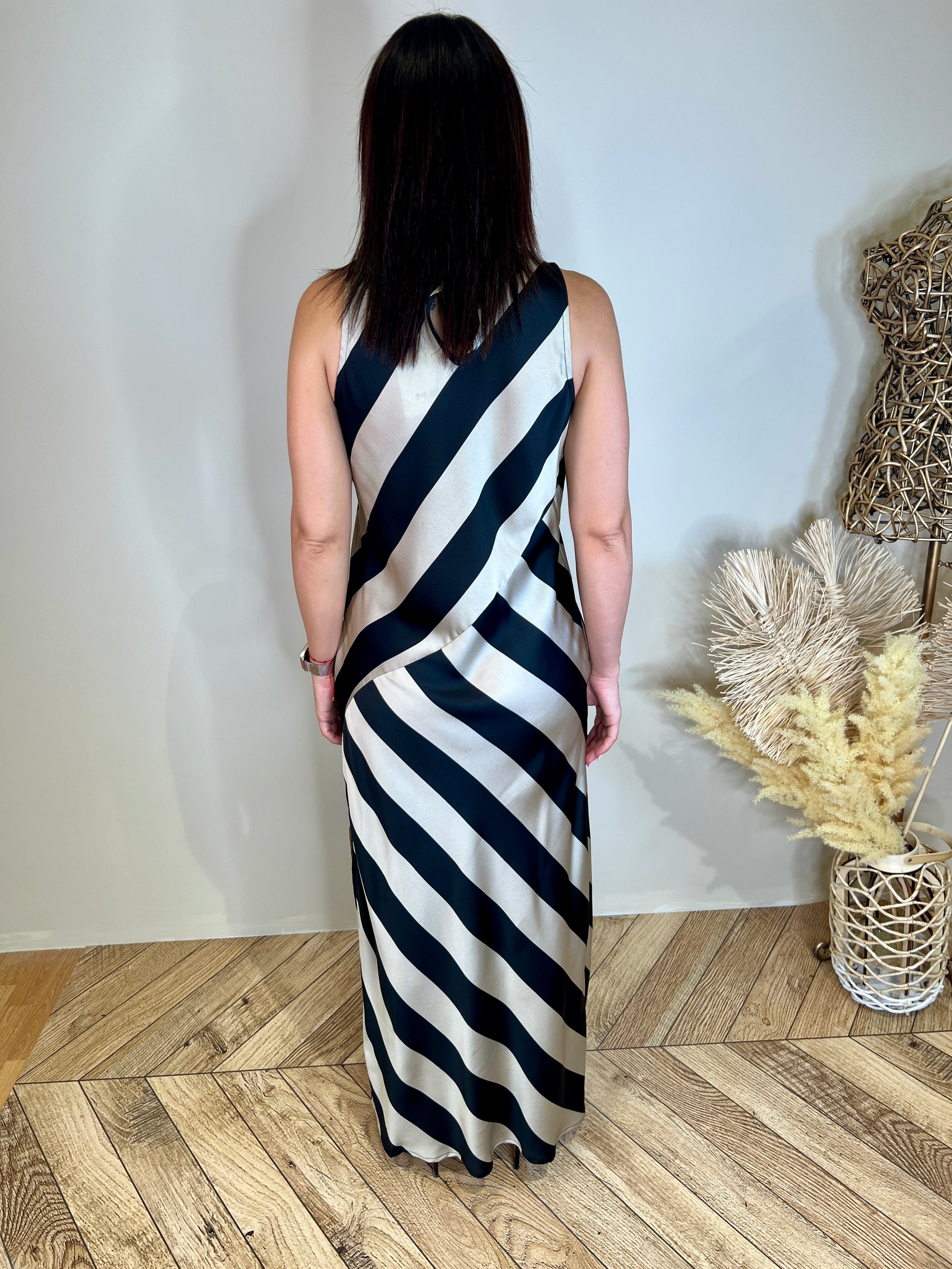 "El Vestido Celine es una pieza exclusiva y elegante que combina rayas en tonos negros y cava. Su diseño estratégico estiliza la silueta y realza la figura de quien lo usa. Perfecto para un look sofisticado y refinado."