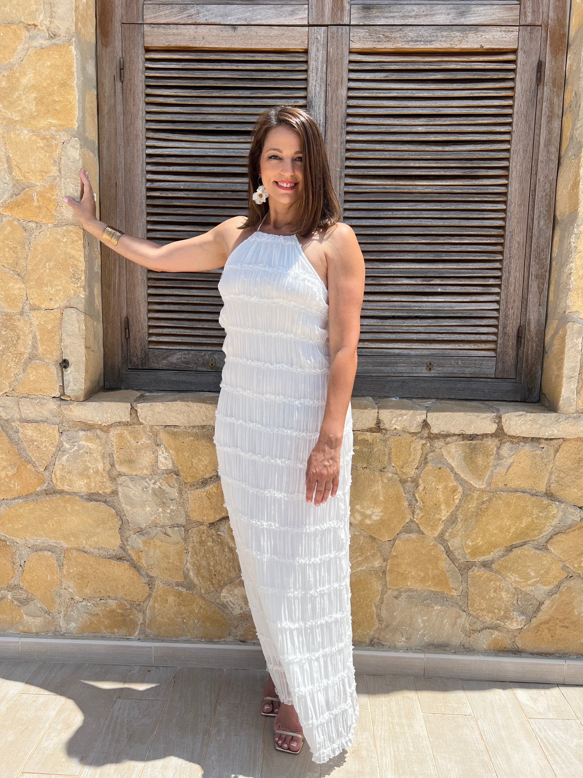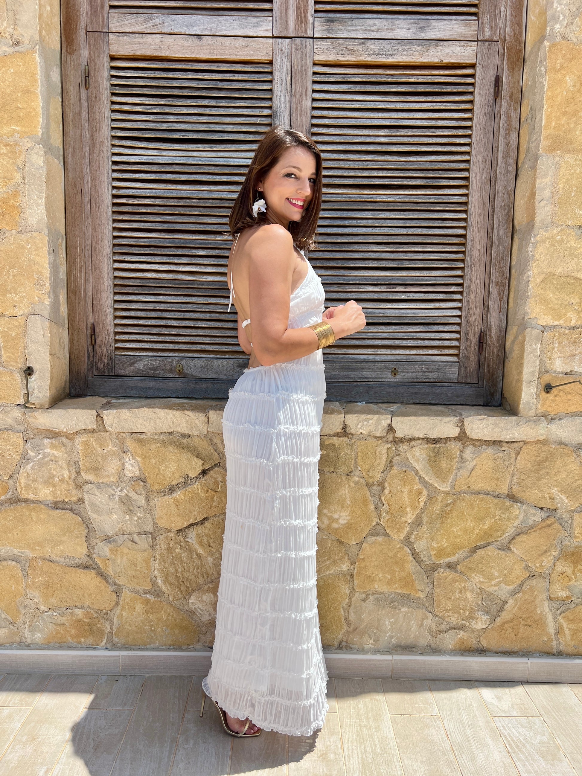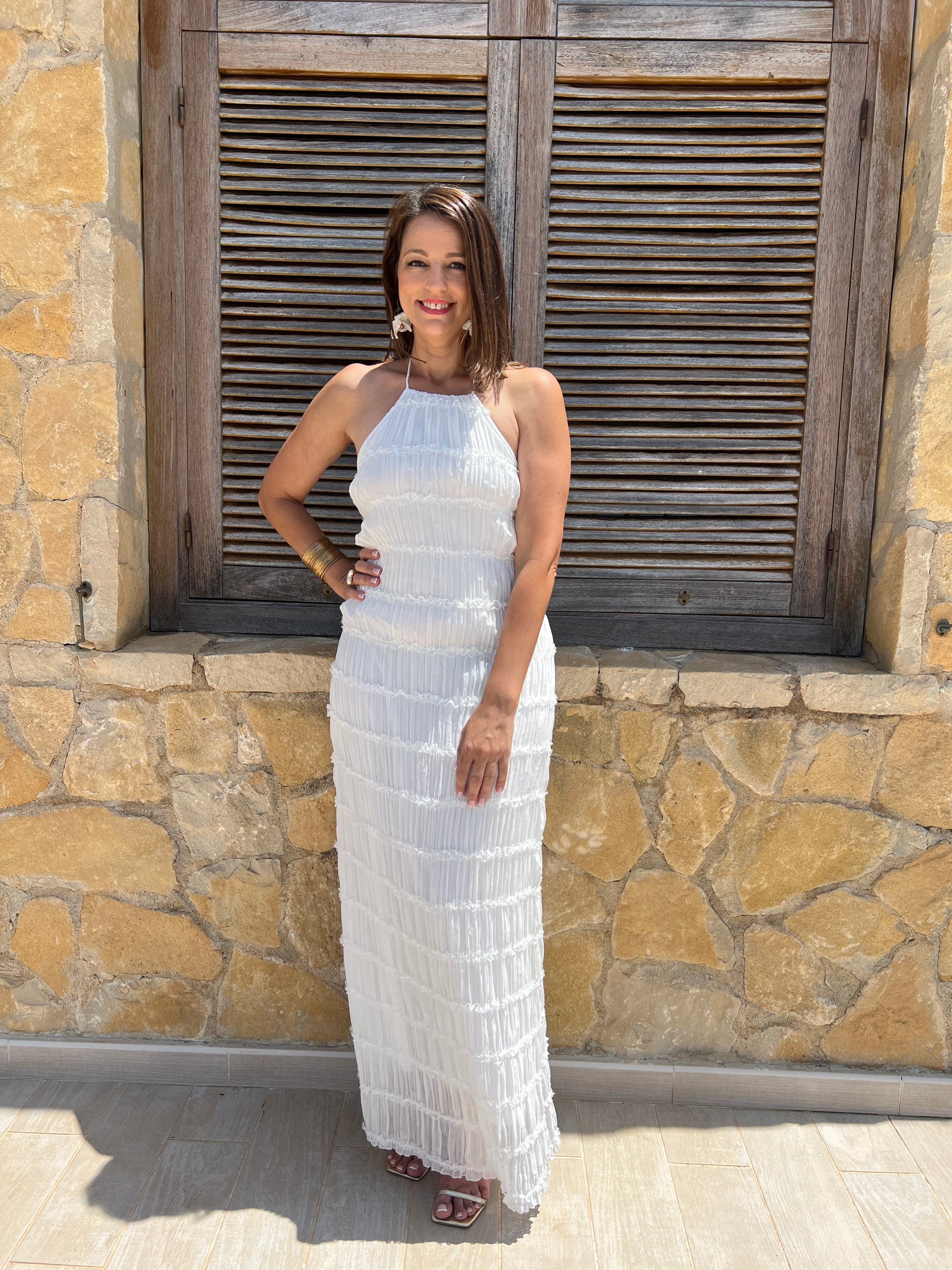 Nuestro Vestido Marel es la combinación perfecta de estilo y comodidad. Su diseño con espalda al aire y tiras elásticas regulables te permite ajustarlo a tu medida, mientras que su escote halter en tono blanco te brinda un look elegante y fresco. Ideal para cualquier ocasión.