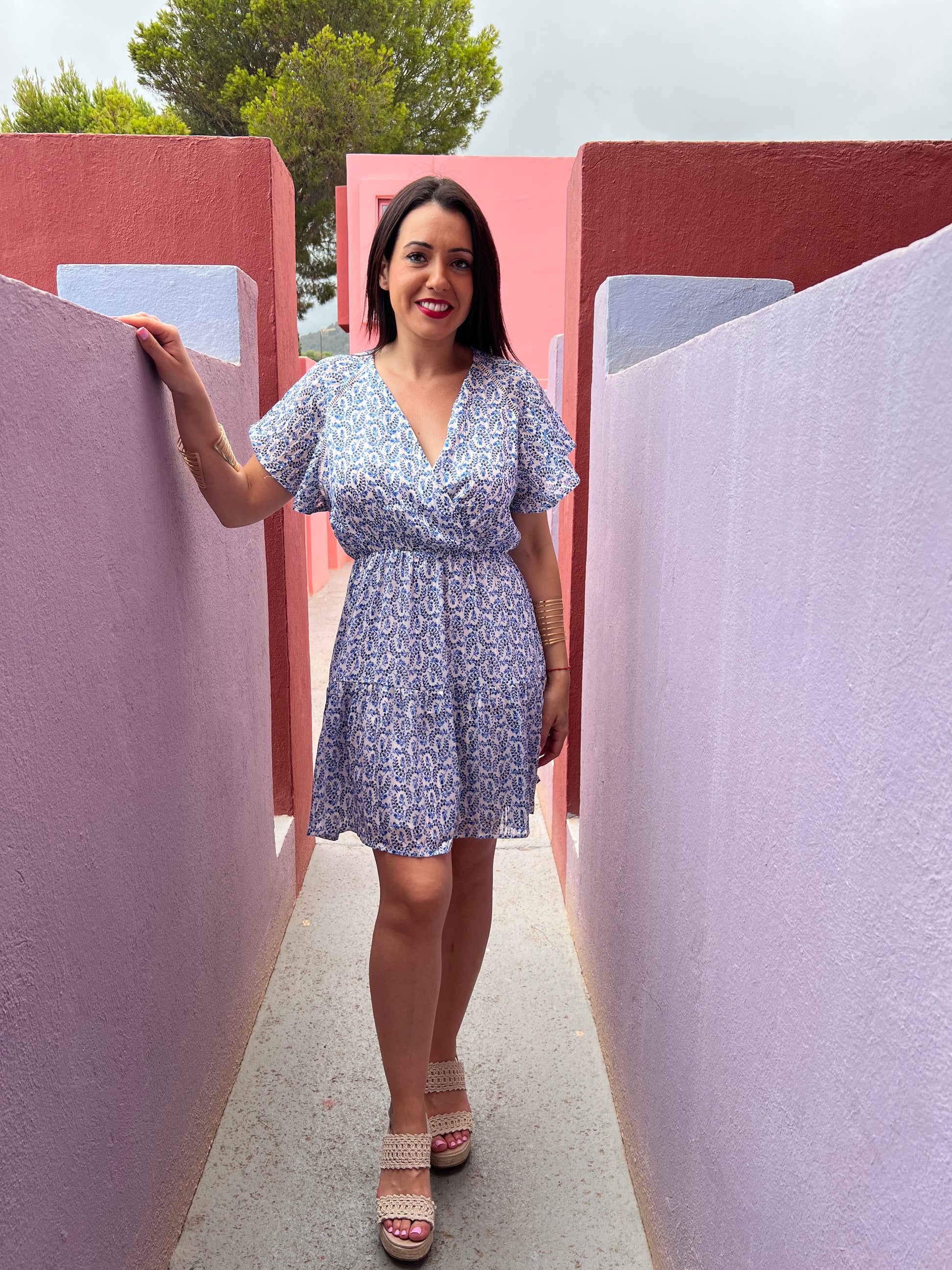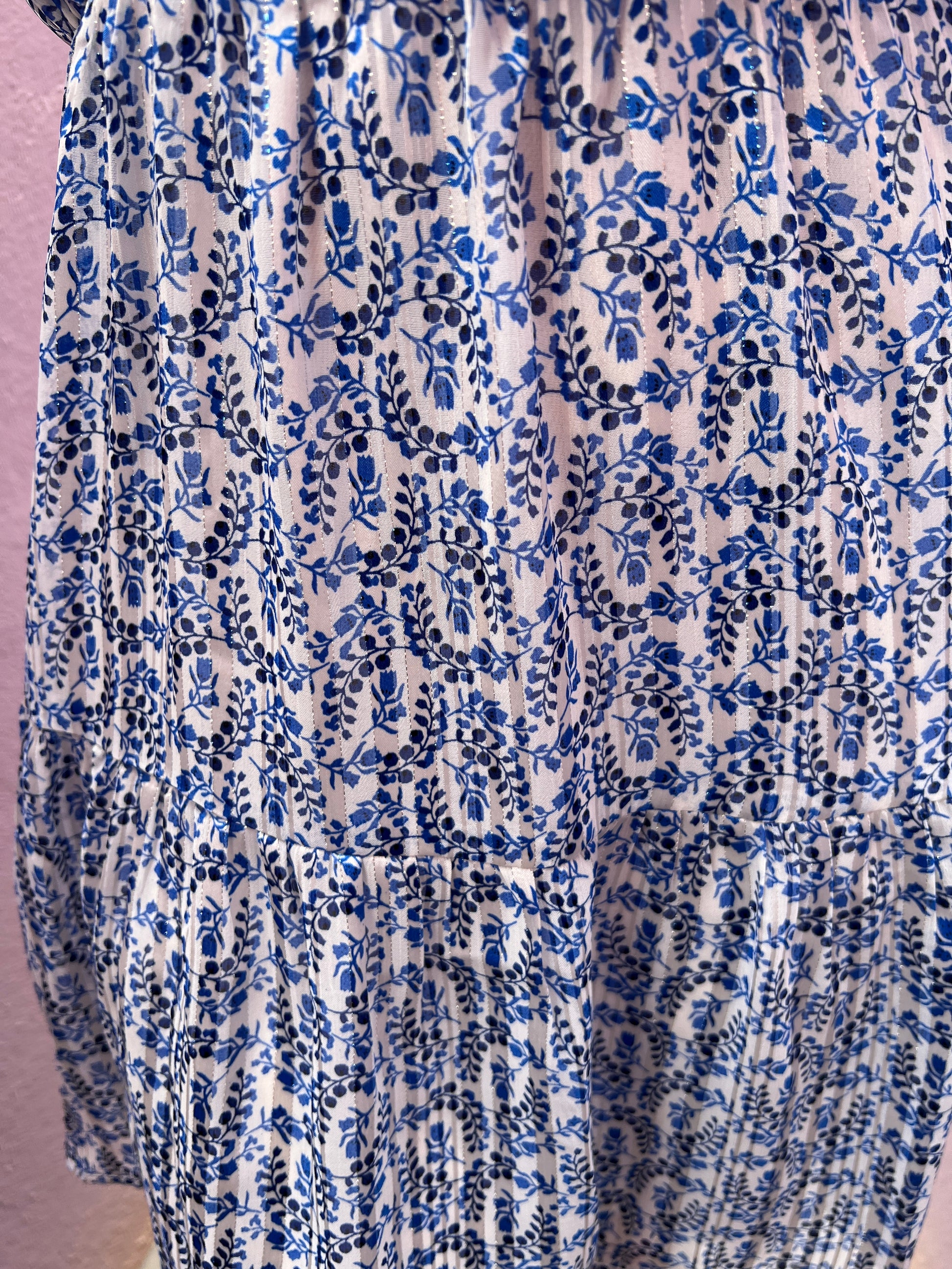 Este vestido Olivia está hecho de una hermosa gasa con un estampado de flores en tonos de azul y un delicado hilo plateado. La cintura elástica, el escote cruzado y el volante en la manga y el bajo, brindan un ajuste cómodo y elegante. Perfecto para una ocasión especial o para un día casual.