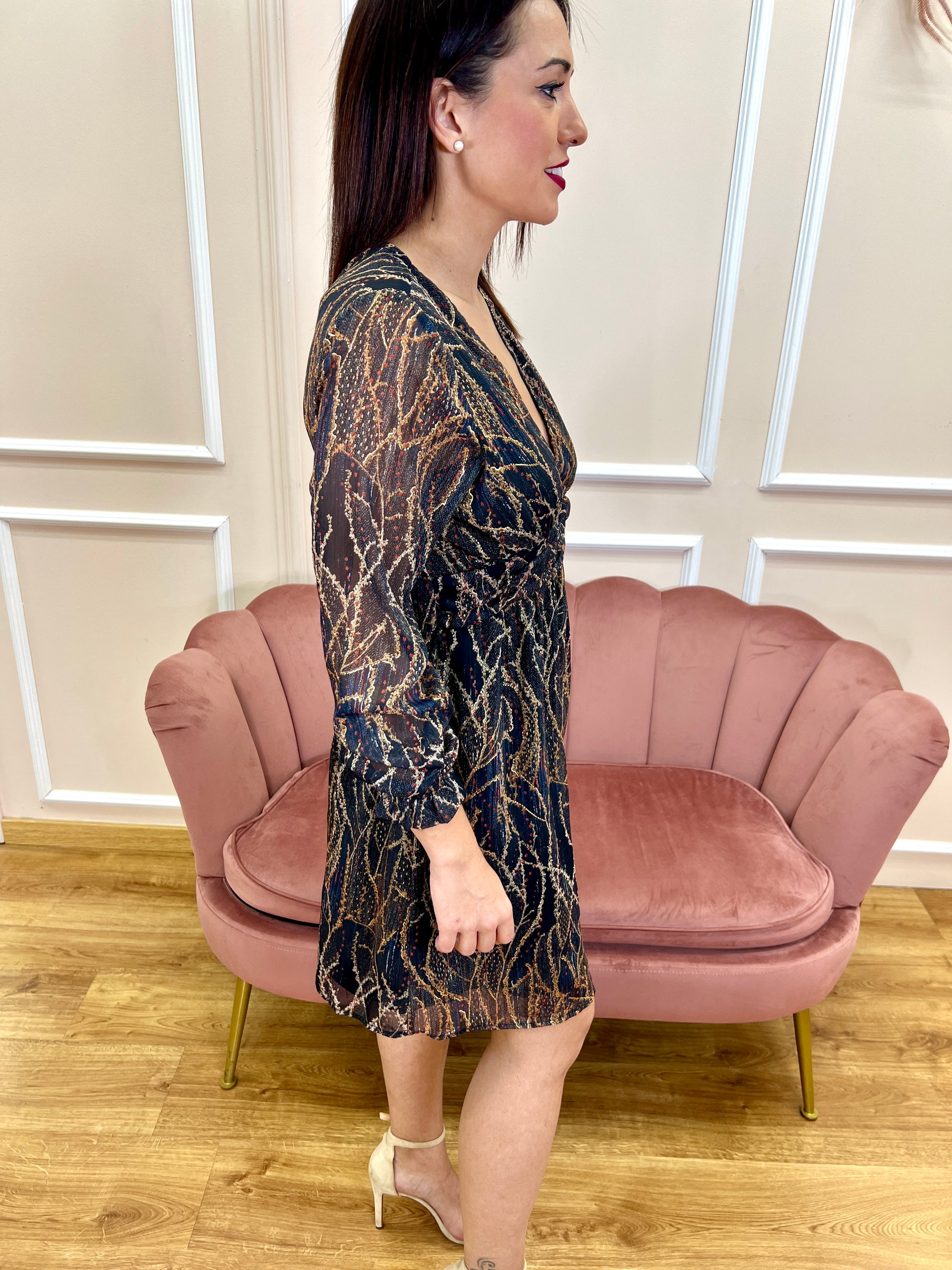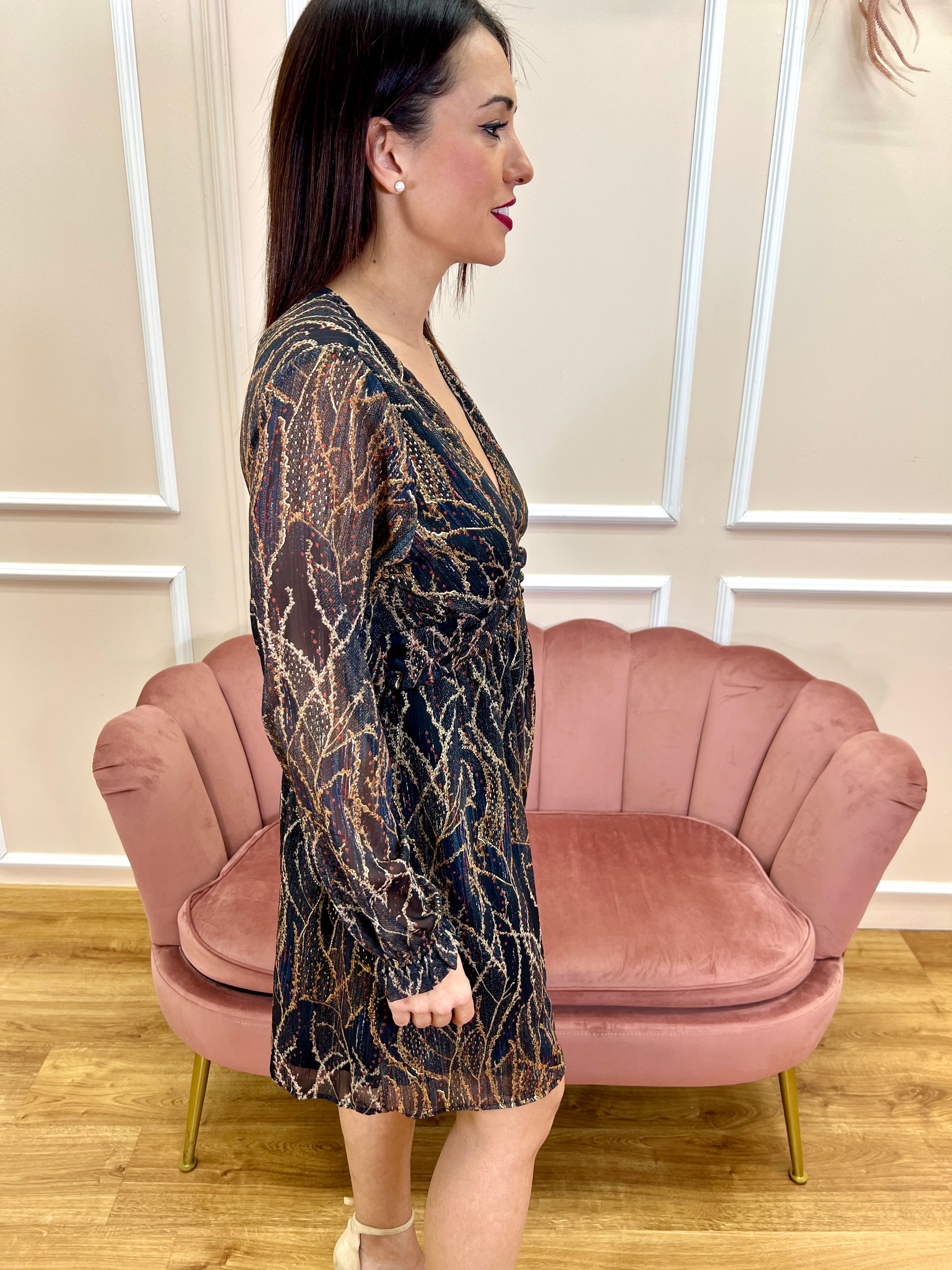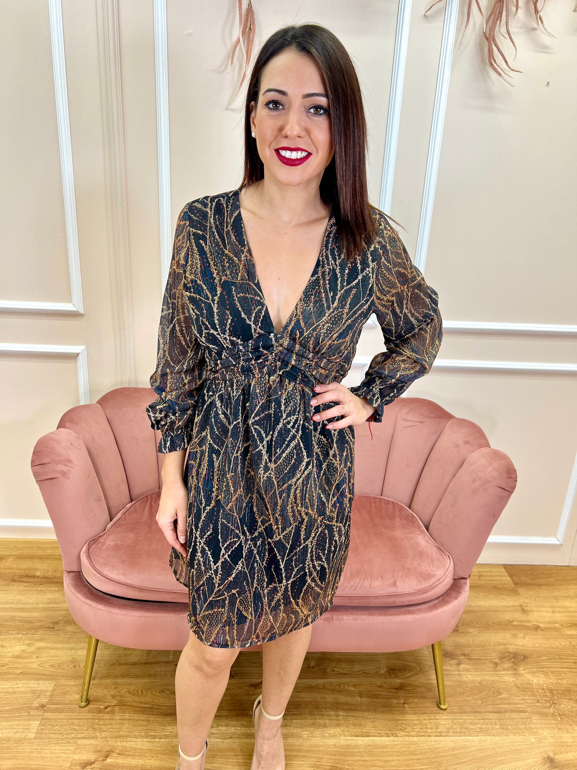 El Vestido Oriana es la prenda perfecta para lucir elegante y sofisticada. Con su cómodo escote de manga elástica, te sentirás cómoda y a la moda. El estampado en tonos marrones teja y el hilo dorado le dan un toque único y moderno. Ideal para cualquier ocasión, este vestido te hará lucir radiante.