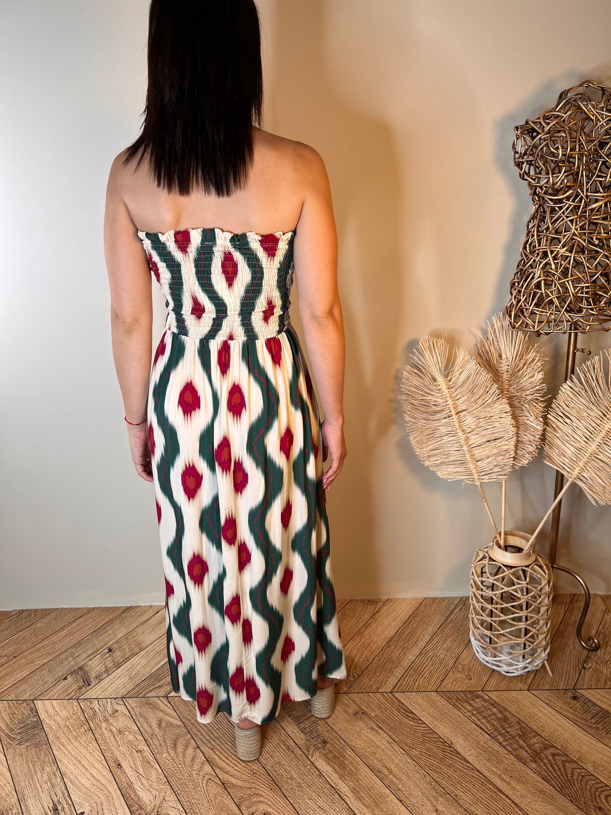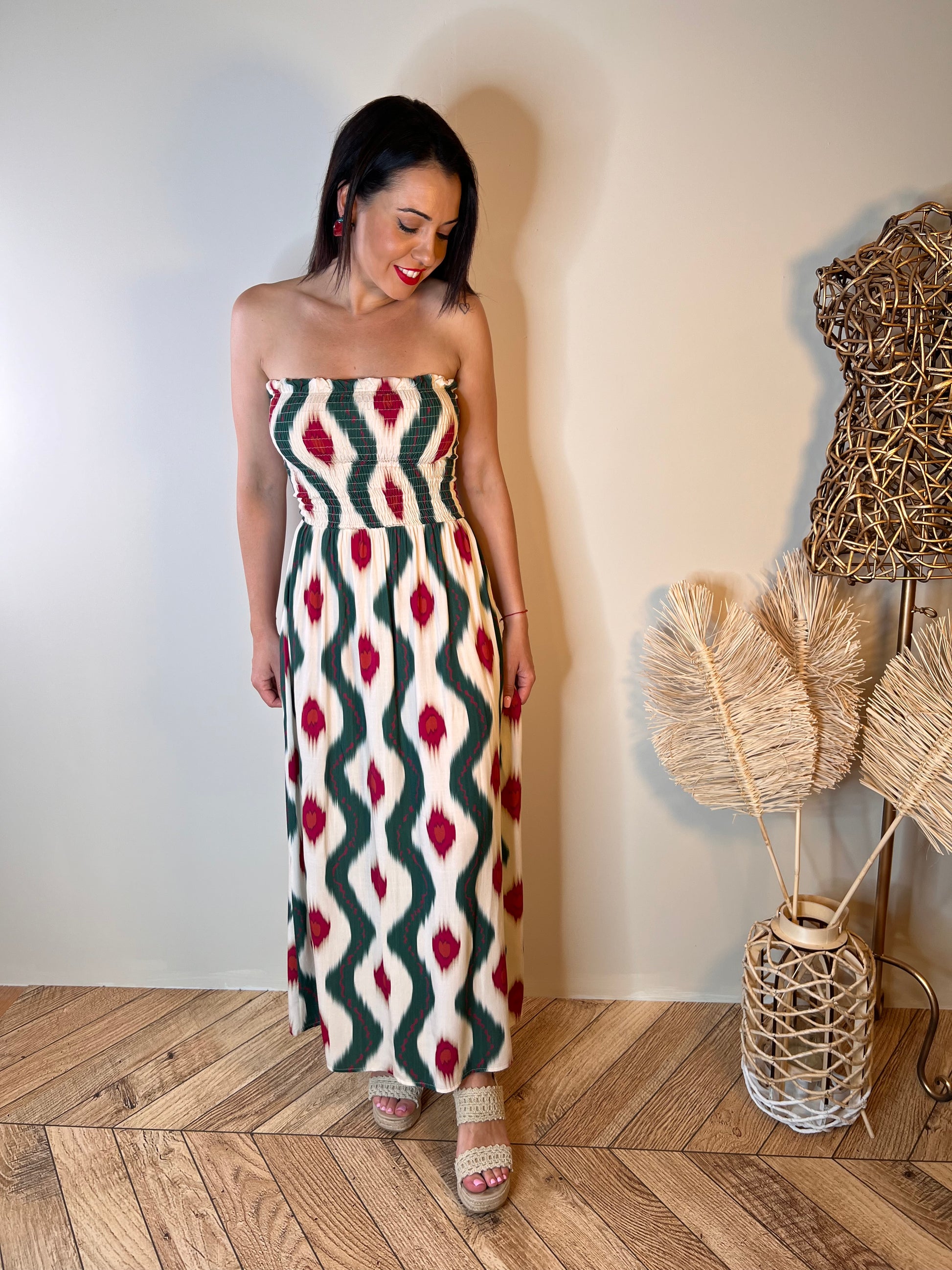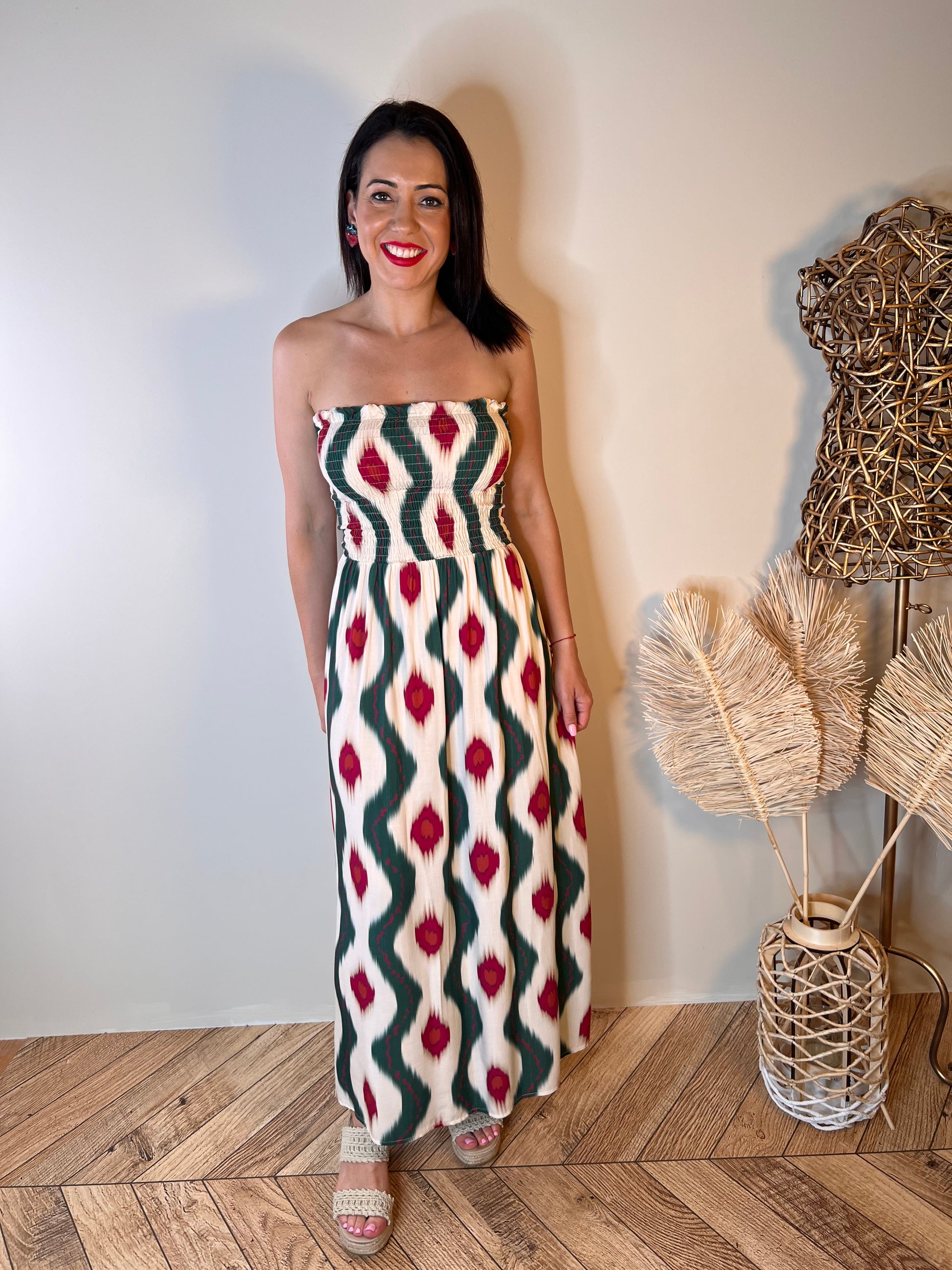 Este vestido en palabra de honor con colores vibrantes en tonos fucsias y verdes es perfecto para cualquier ocasión. Con su diseño elegante y llamativo, te destacarás en cualquier evento. Además, su suave tela te mantendrá cómoda durante todo el día. ¡Haz una declaración de moda con el vestido Serena!