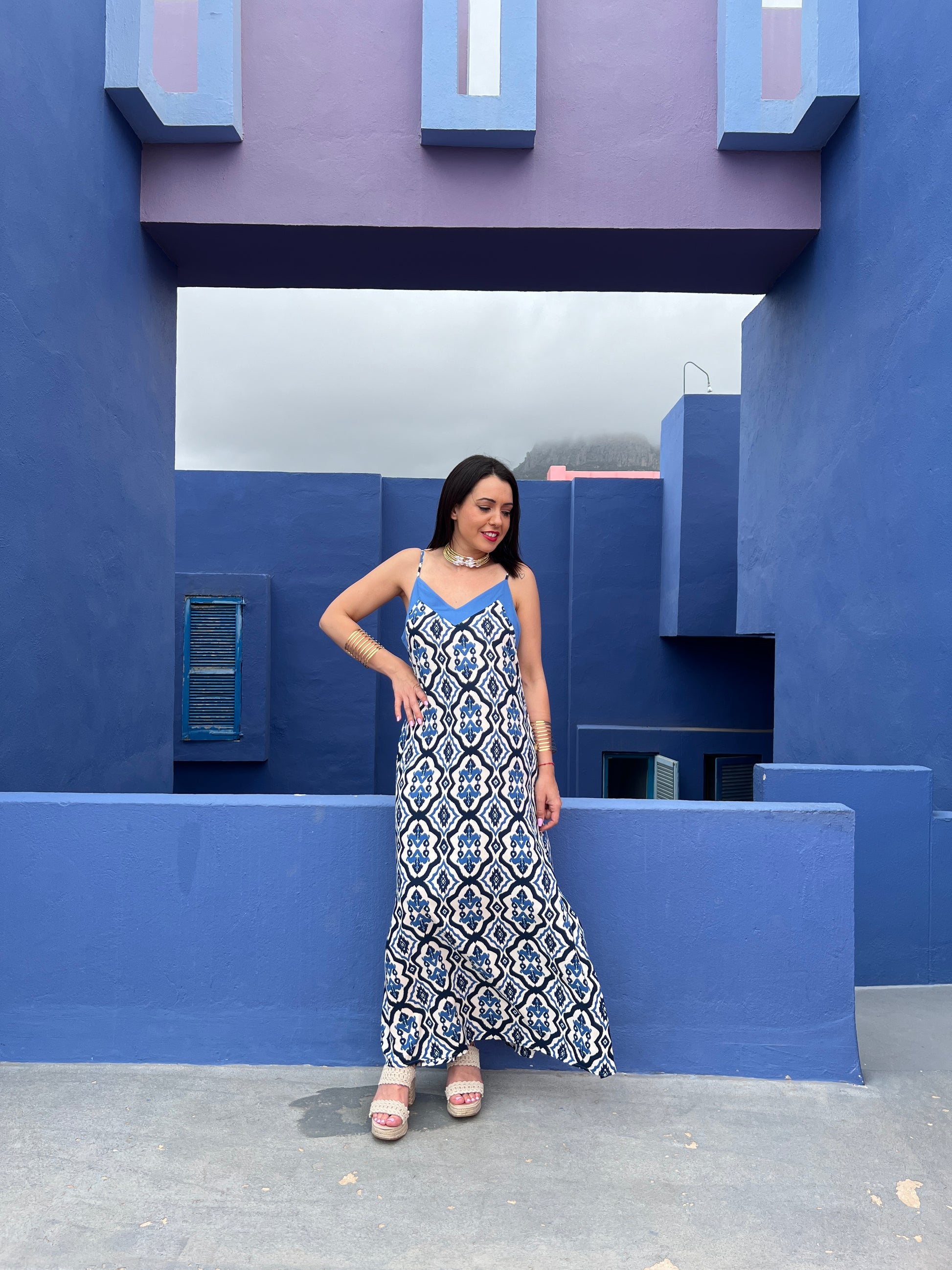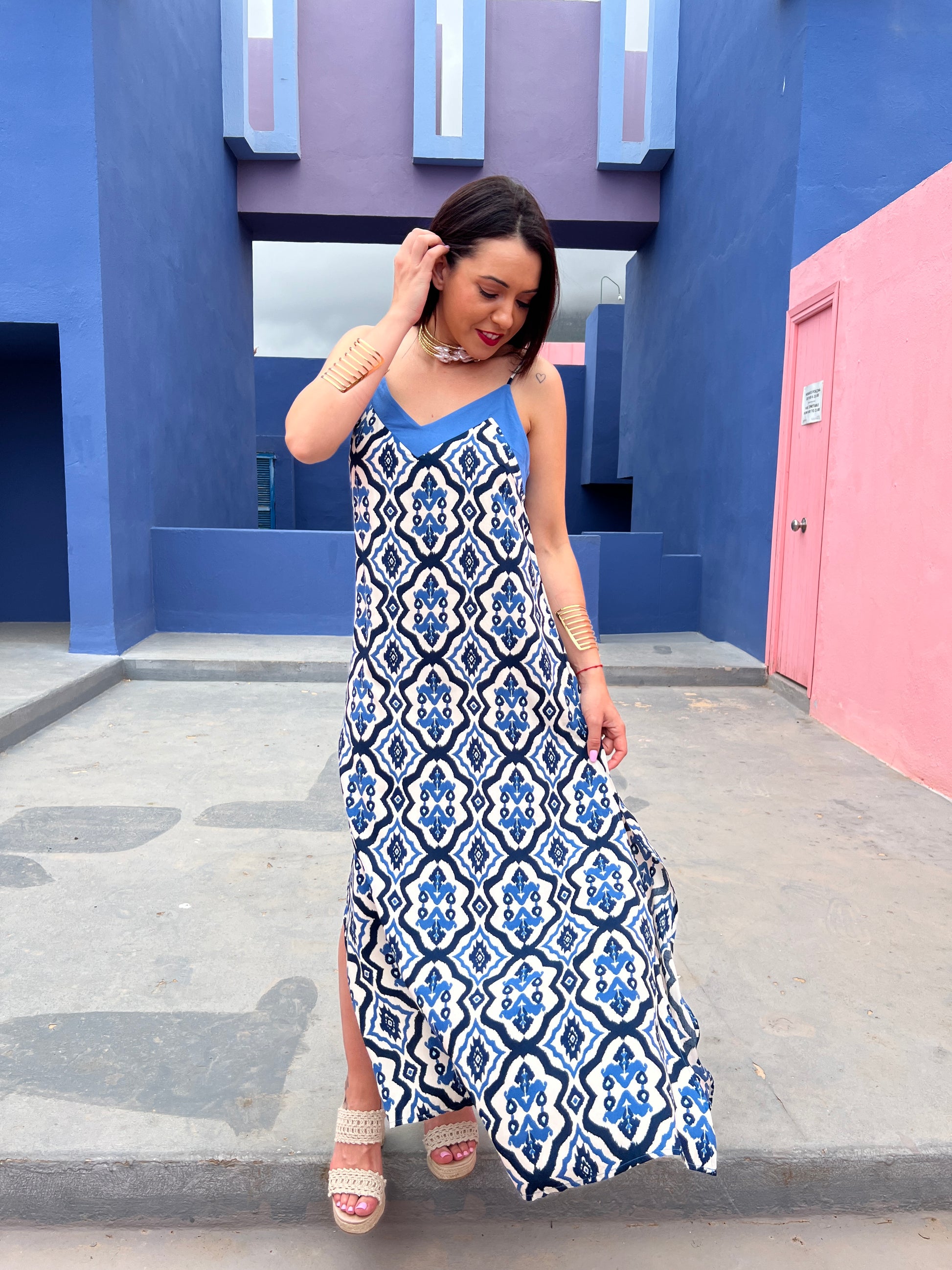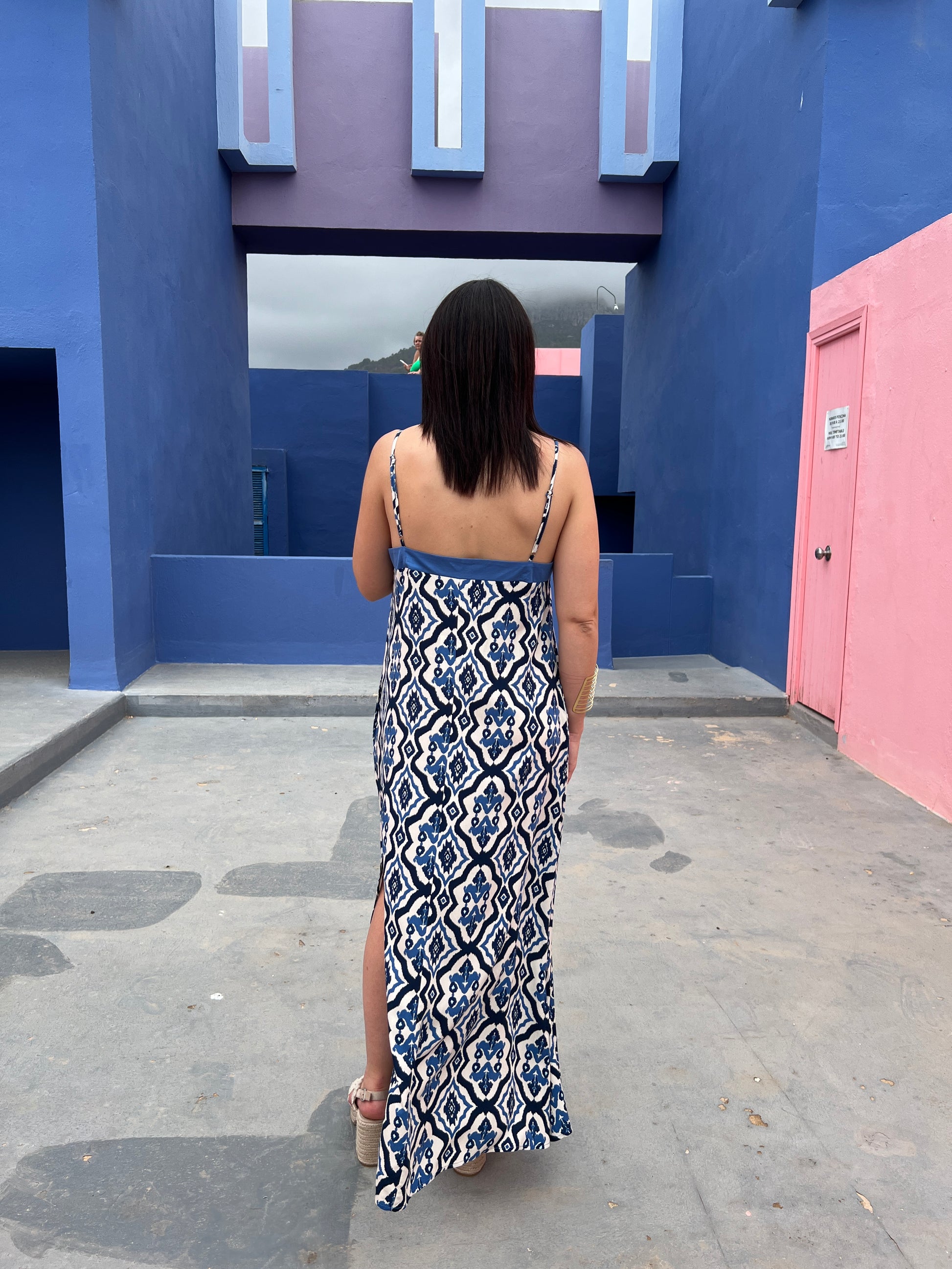 Este es el Vestido Zahir, con un estampado en tonos azules sobre fondo blanco, con aberturas en los costados y tirante regulable de corte recto amplio. Combina estilo y comodidad para un look elegante y moderno. Hecho con materiales de alta calidad y diseño innovador para resaltar en cualquier ocasión. ¡Obtén ahora este vestido exclusivo!