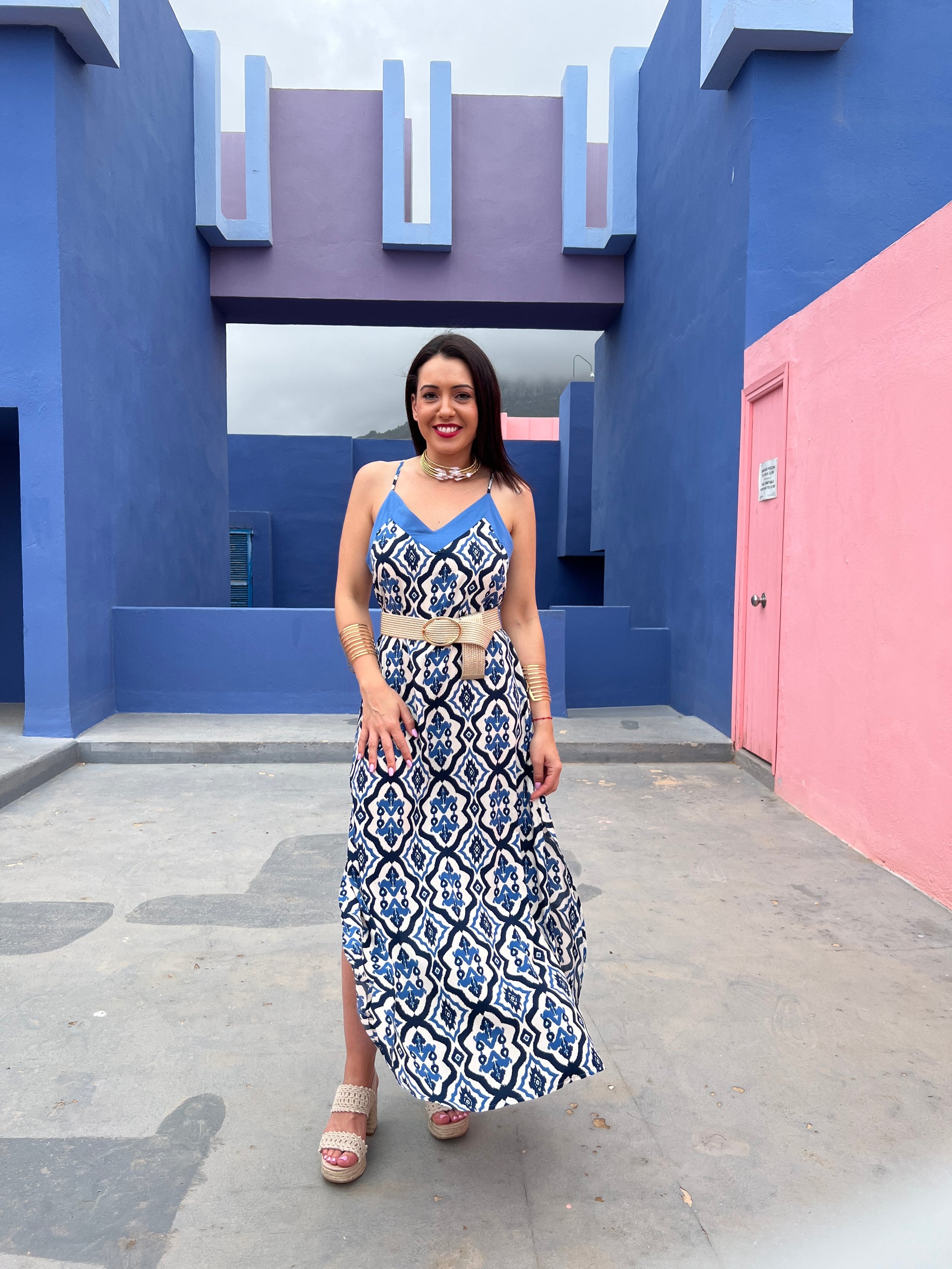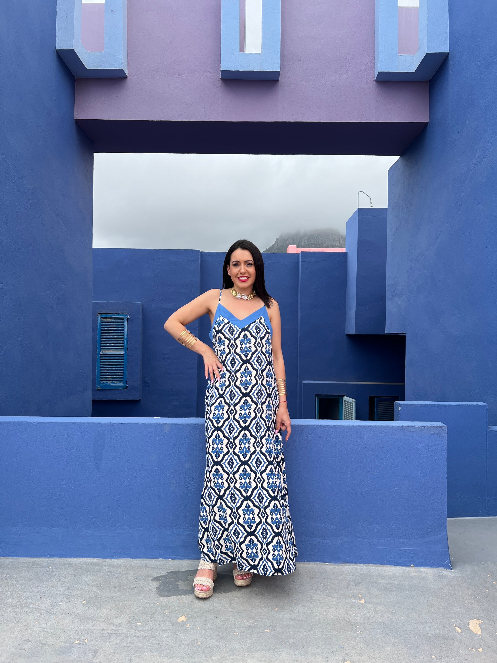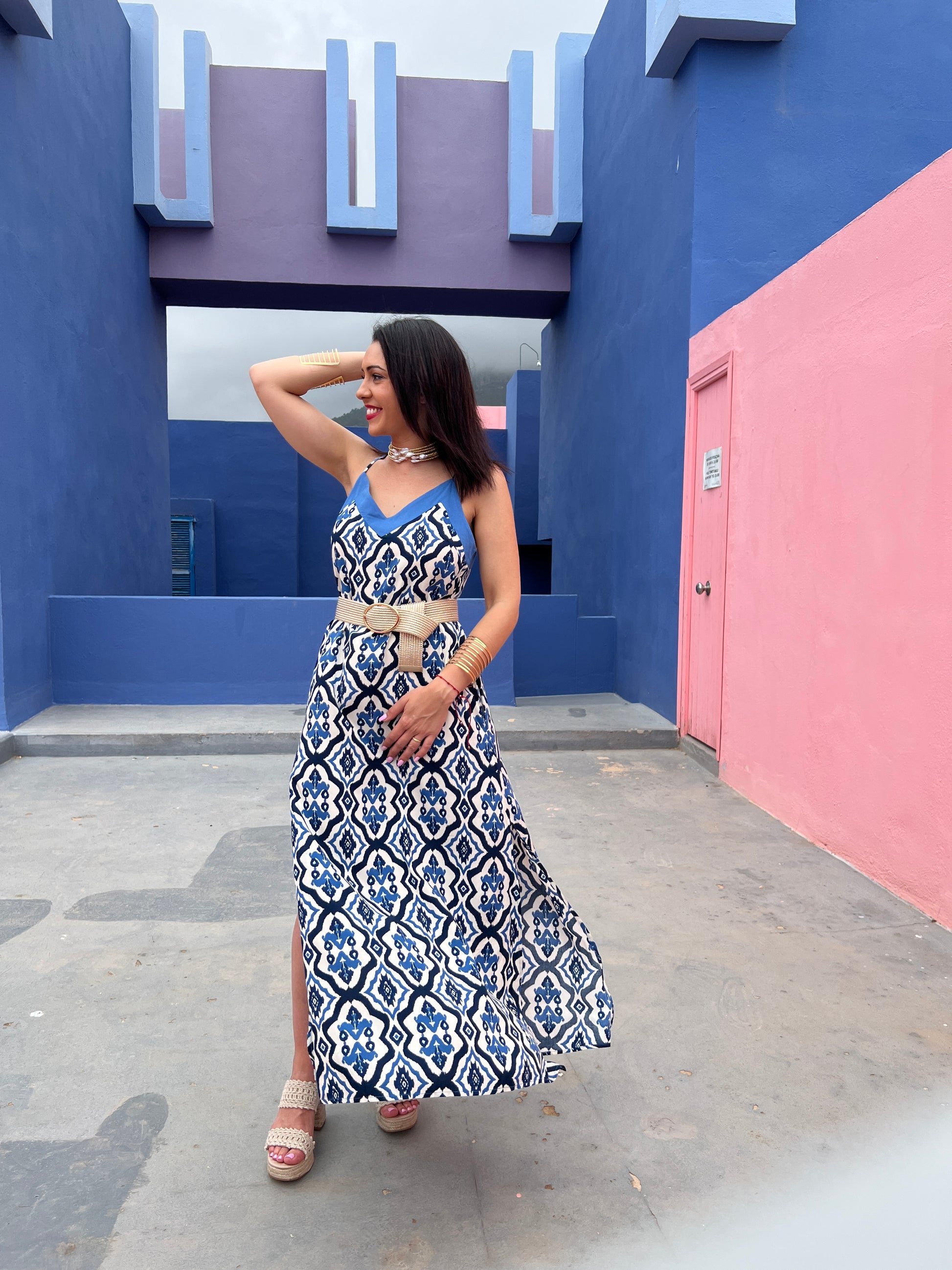 Este es el Vestido Zahir, con un estampado en tonos azules sobre fondo blanco, con aberturas en los costados y tirante regulable de corte recto amplio. Combina estilo y comodidad para un look elegante y moderno. Hecho con materiales de alta calidad y diseño innovador para resaltar en cualquier ocasión. ¡Obtén ahora este vestido exclusivo!